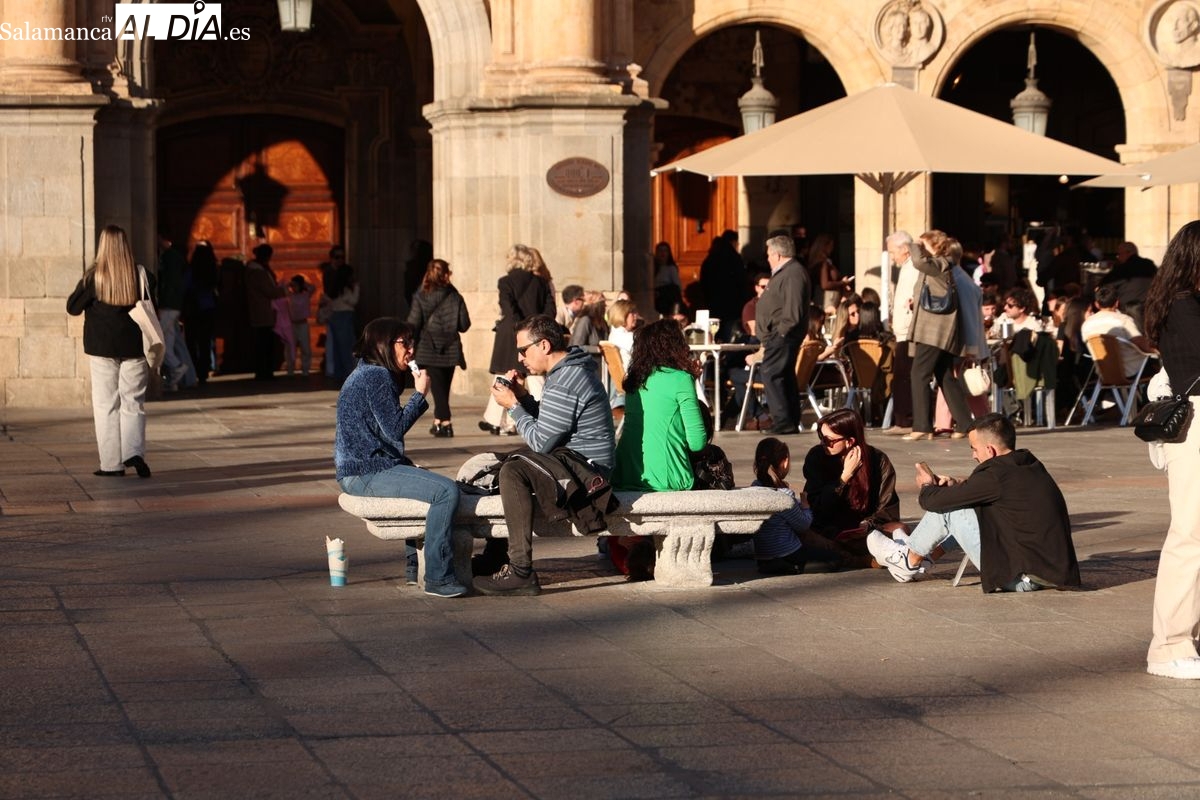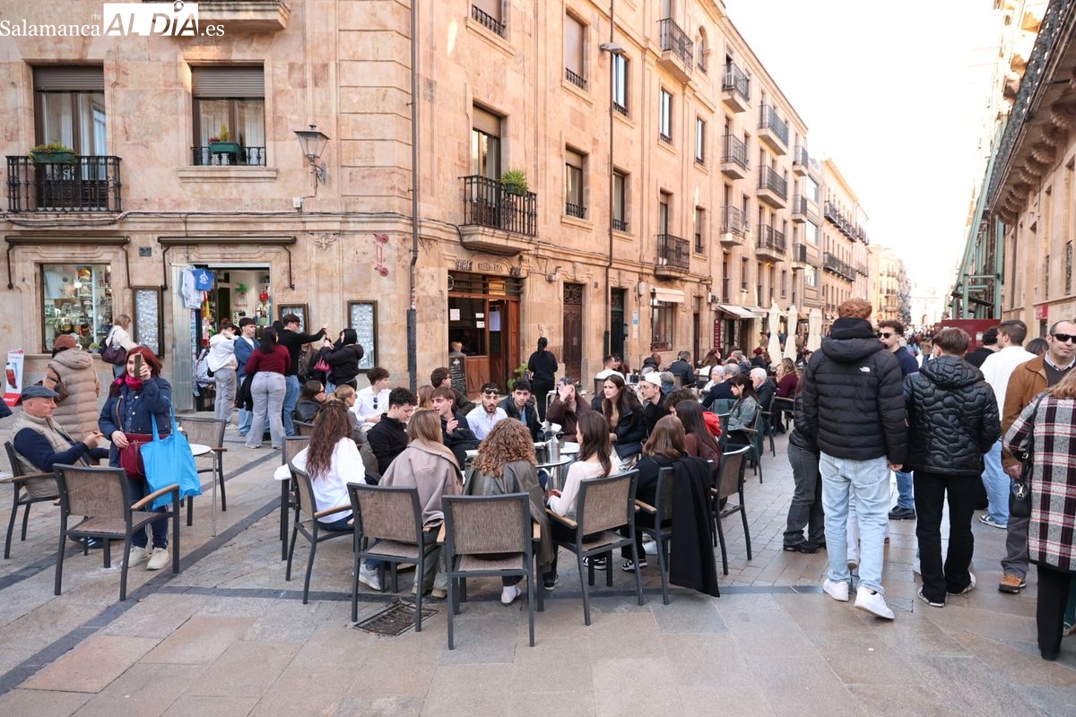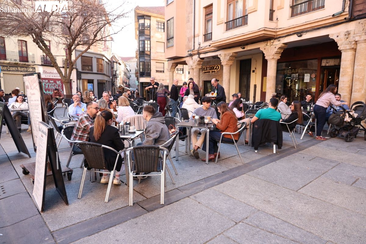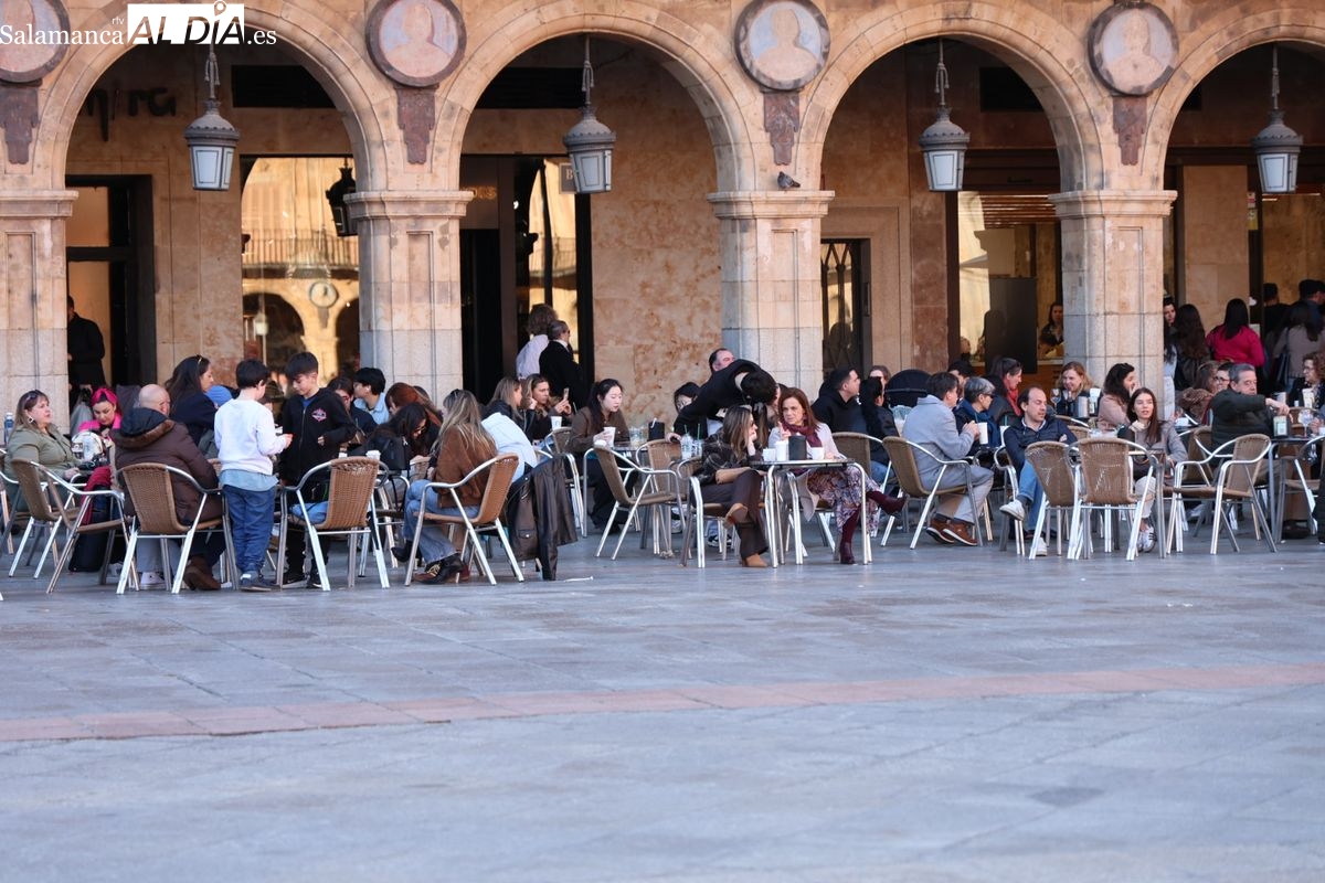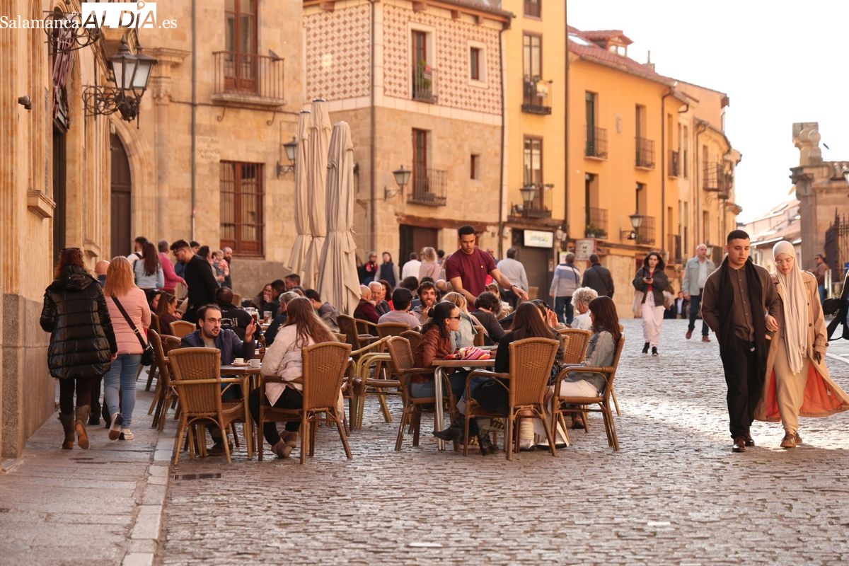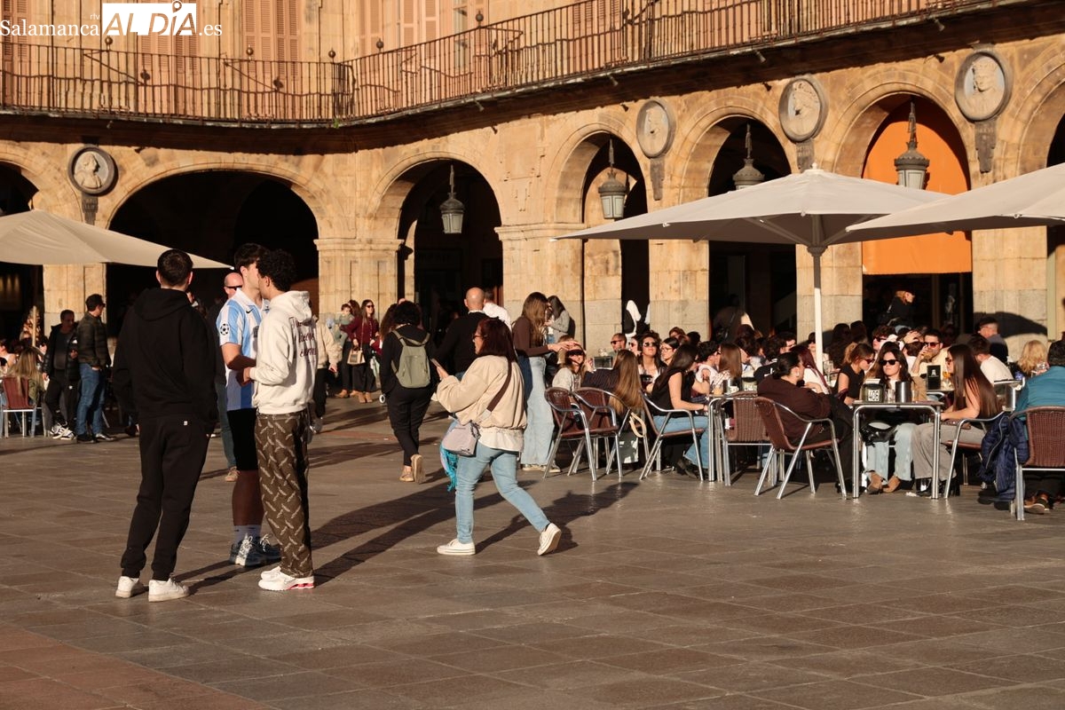 El cambio meteorológico ha propiciado una gran afluencia de salmantinos y turistas en el casco histórico y las terrazas de la ciudad