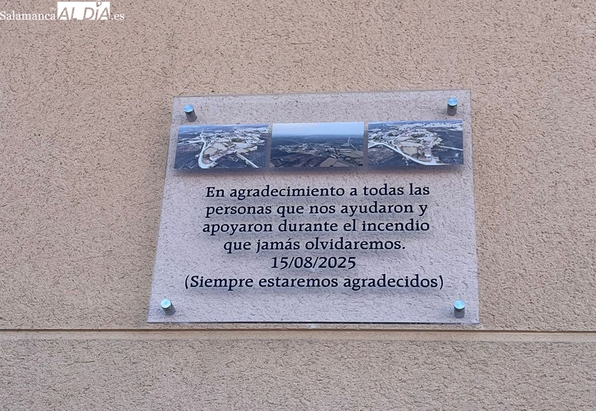 Uno de los momentos más significativos del día fue el descubrimiento de una placa conmemorativa. Este gesto sirvió para expresar el agradecimiento de los vecinos de Gejo de los Reyes "a todas las personas que nos ayudaron y apoyaron durante el incendio que jamás olvidaremos", ocurrido el 15 de agosto de 2025. Durante el acto, se dedicaron palabras de gratitud a los colaboradores: "a los que damos las gracias, gracias y mil veces gracias". En la placa descubierta reza textualmente: "En agradecimiento a todas las personas que nos ayudaron y apoyaron durante el incendio que jamás olvidaremos. 15/08/2025 (Siempre estaremos agradecidos)".