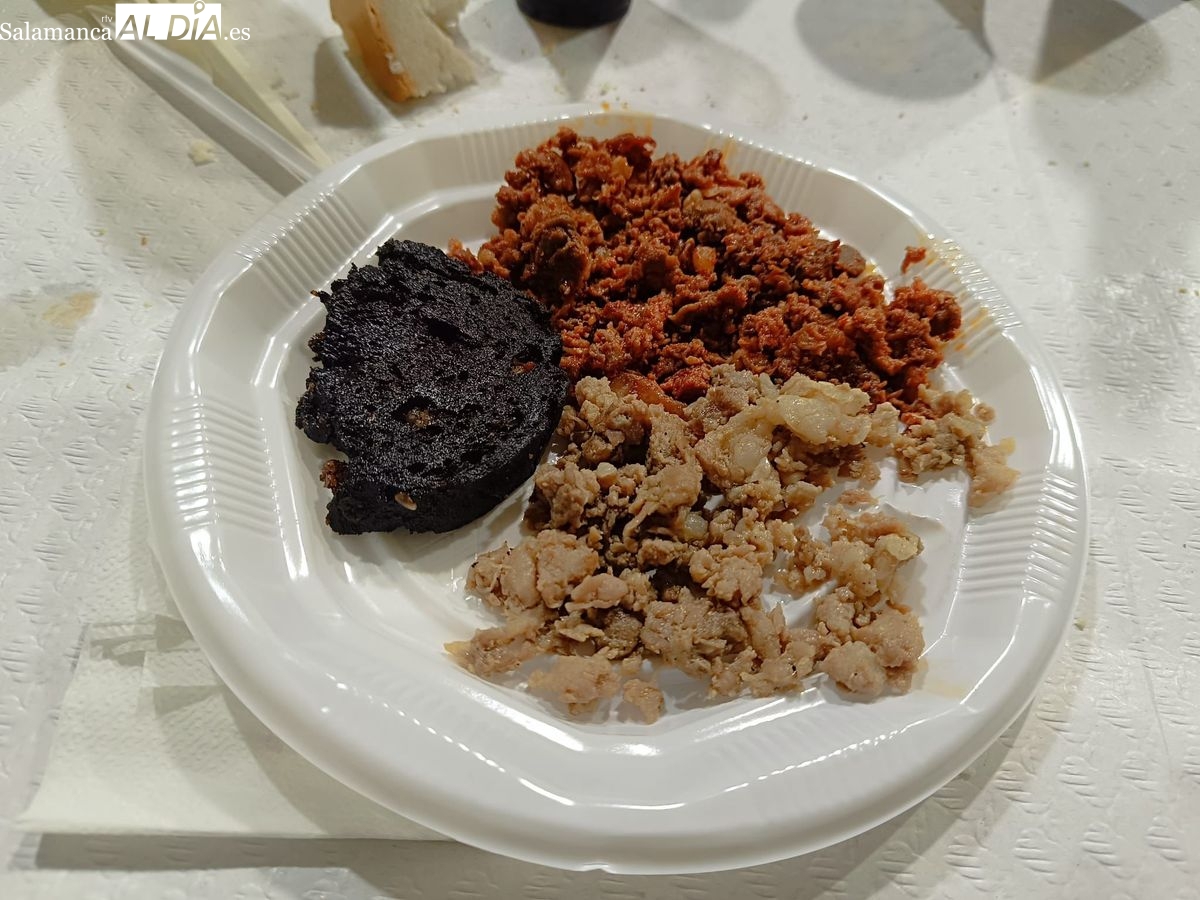 La gastronomía fue el hilo conductor de la jornada. A las 11:30 horas tuvo lugar el almuerzo, compuesto por huevos fritos, longaniza y farinato. Posteriormente, se llevó a cabo la selección de tipos de carne, el picado y el adobo para el embutido. La comida principal se sirvió a las 15:00 horas, con un menú contundente a base de hígado encebollado, patatas "meneás" con torreznos, filetes de lomo a la parrilla y fruta.