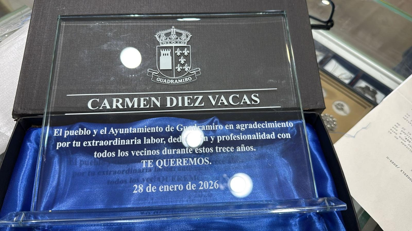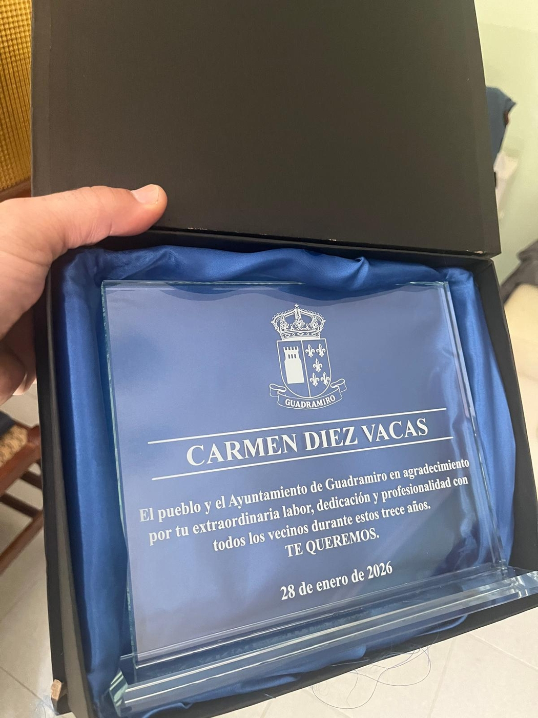 La gratitud de Guadramiro se ha materializado en la entrega de una placa conmemorativa en nombre del Ayuntamiento y de todo el pueblo, así como dos ramos de flores y diversos obsequios entregados por los vecinos a título particular. En la placa reza la siguiente frase: "El pueblo y el Ayuntamiento de Guadramiro, en agradecimiento por tu extraordinaria labor, dedicación y rpofesionalidad con todos los vecinos durante estos trece años. Te queremos”. Tras las palabras y los aplausos en el bajo de la Casa Consistorial, los asistentes han compartido un pequeño convite, un momento de cercanía para intercambiar los últimos consejos y abrazos.
