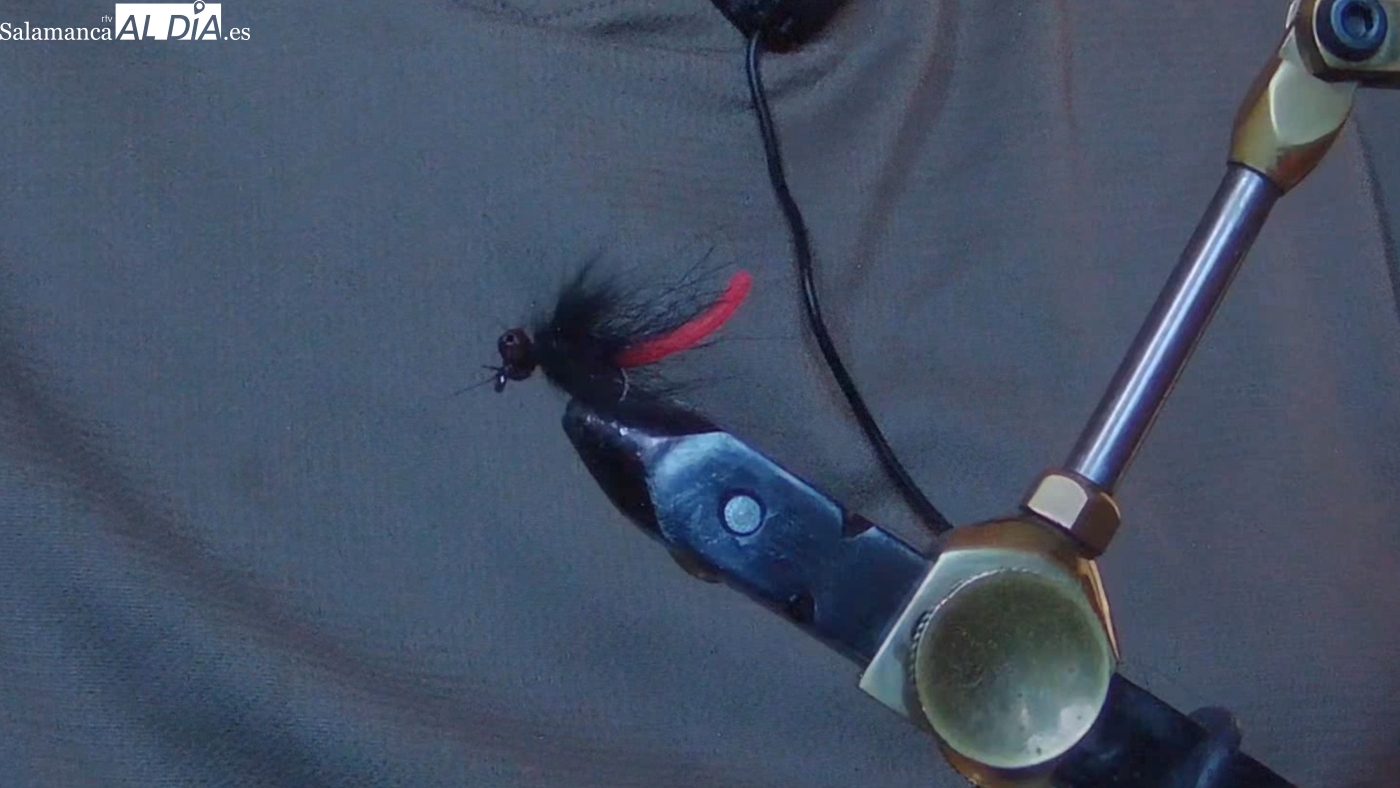 El éxito de la jornada también recae en la elección del cebo artificial. Se utilizó una ninfa montada sobre un anzuelo curvo del número 10 con ojos de cadena en negro, para evitar que un destello sobredimensionado asuste a este huidizo pez. Este montaje cuenta con un cuerpo y exuvia de vinilo rojo, complementado con un dubbing negro sintético con brillos en la zona del abdomen. El tórax, elaborado con pelo negro de conejo, confiere al señuelo una gran movilidad en el agua, logrando ser muy atractivo para estos peces.