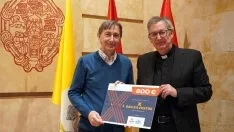 El Rector de la Universidad Pontificia de Salamanca (UPSA), Santiago García-Jalón, ha hecho entrega oficial de la recaudación obtenida durante la celebración de la X San Silvestre Universitaria. El donativo, que asciende a un total de 800 euros procedentes de la venta de dorsales, ha sido recibido por el director de Cáritas Diocesana de Salamanca, José Manuel Lázaro Uriol.