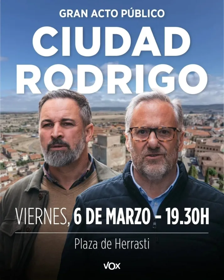 Santiago Abascal, líder nacional de VOX, encabezará un acto público en Ciudad Rodrigo el próximo viernes 6 de marzo. El evento, que se celebrará en la Plaza de Herrasti a las 19:30 horas, contará también con la presencia de Carlos Pollán. La formación política ha convocado a simpatizantes y vecinos en este céntrico enclave mirobrigense para presentar sus propuestas en un mitin abierto.