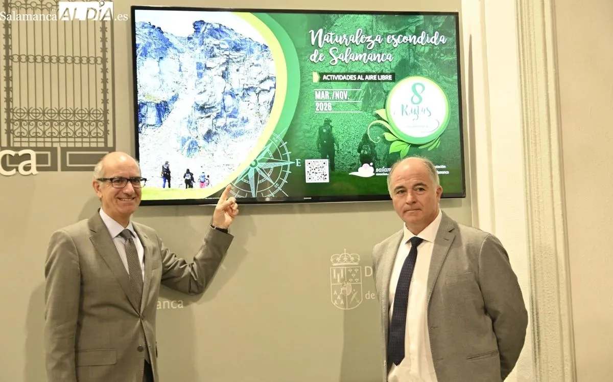 El presidente de la Diputación de Salamanca, Javier Iglesias, acompañado por el diputado de Turismo, Juan Carlos Zaballos, ha presentado esta mañana los detalles de la VIII Edición de “Naturaleza Escondida”. Esta propuesta institucional se ha consolidado como una herramienta clave para fomentar el turismo activo e invitar a los participantes a descubrir paisajes espectaculares de la provincia que a menudo pasan desapercibidos.