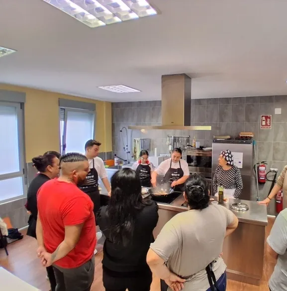 Cáritas Diocesana Ciudad Rodrigo refuerza su curso de Operaciones Básicas de Cocina con la visita de una antigua alumna, quien compartió su éxito laboral con los ocho participantes actuales.