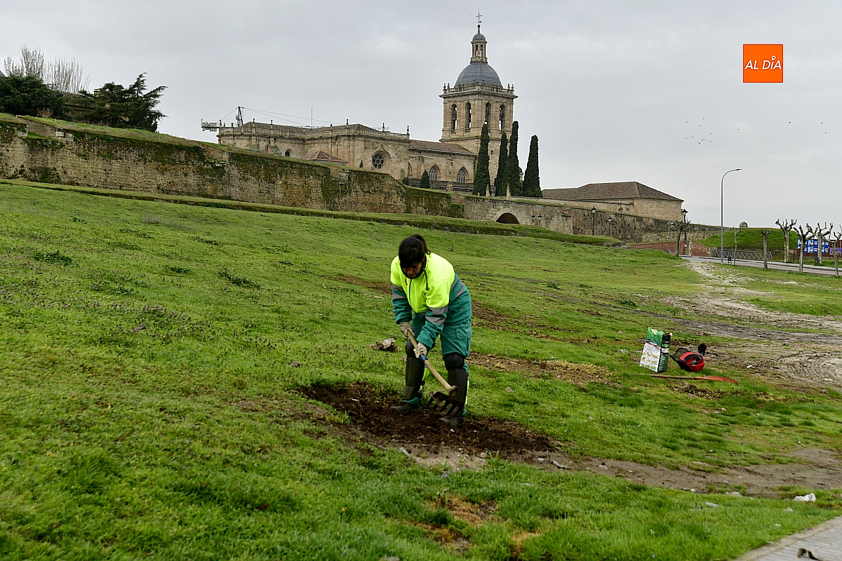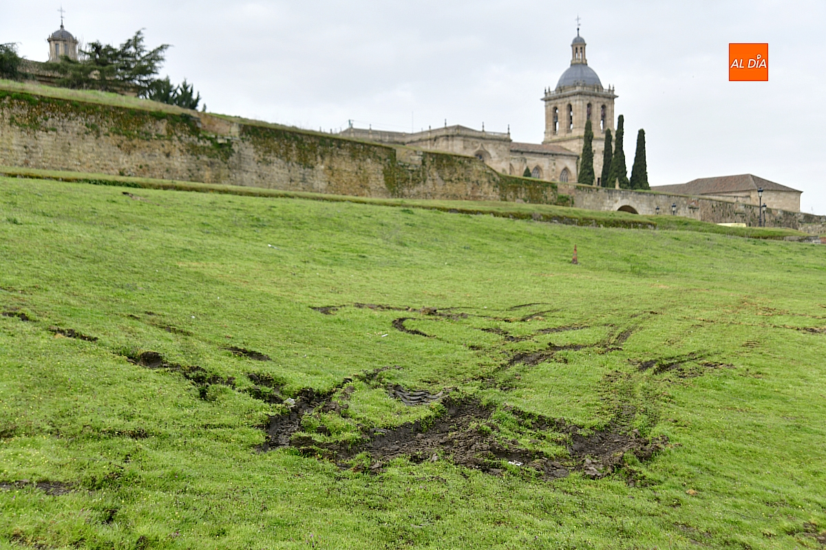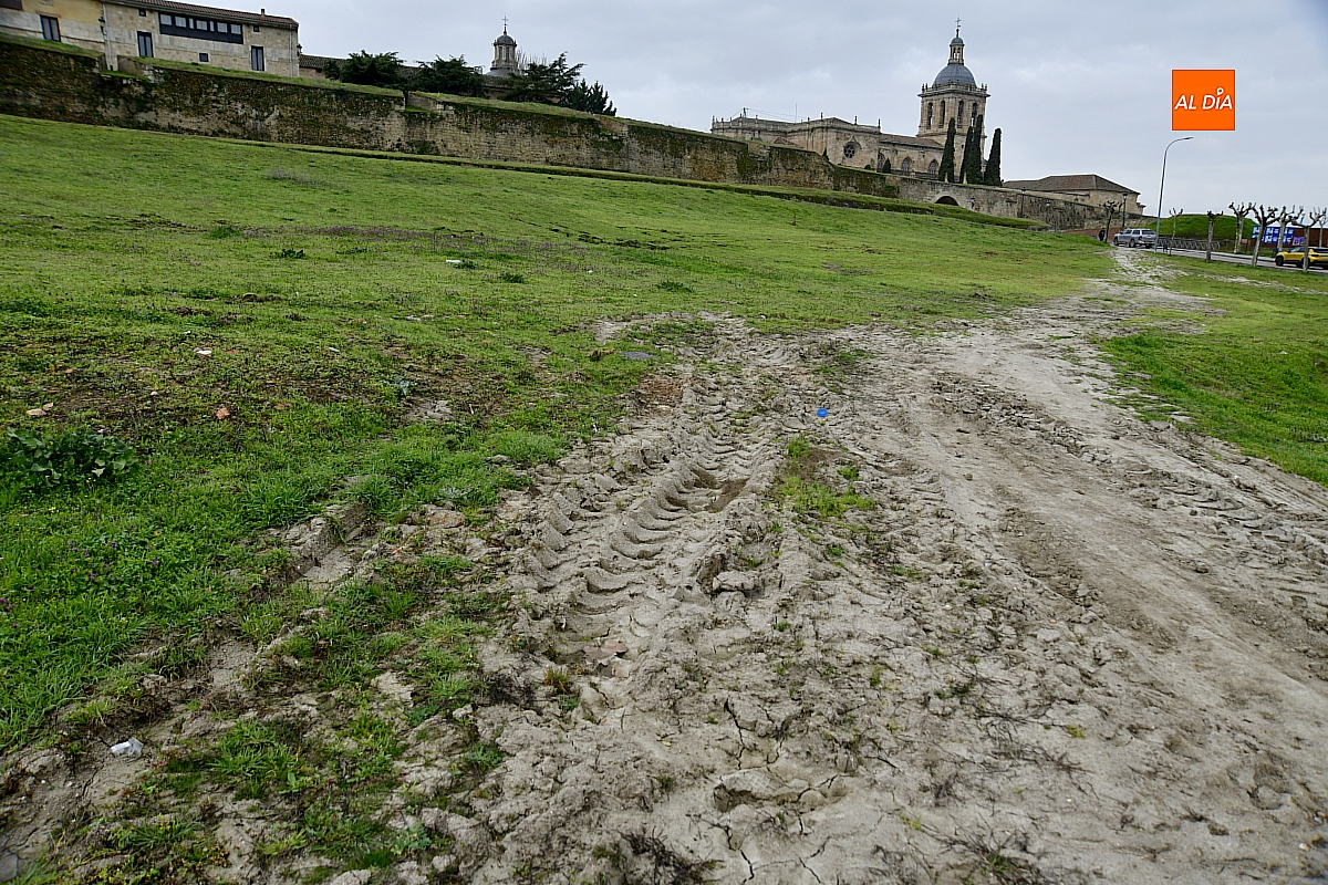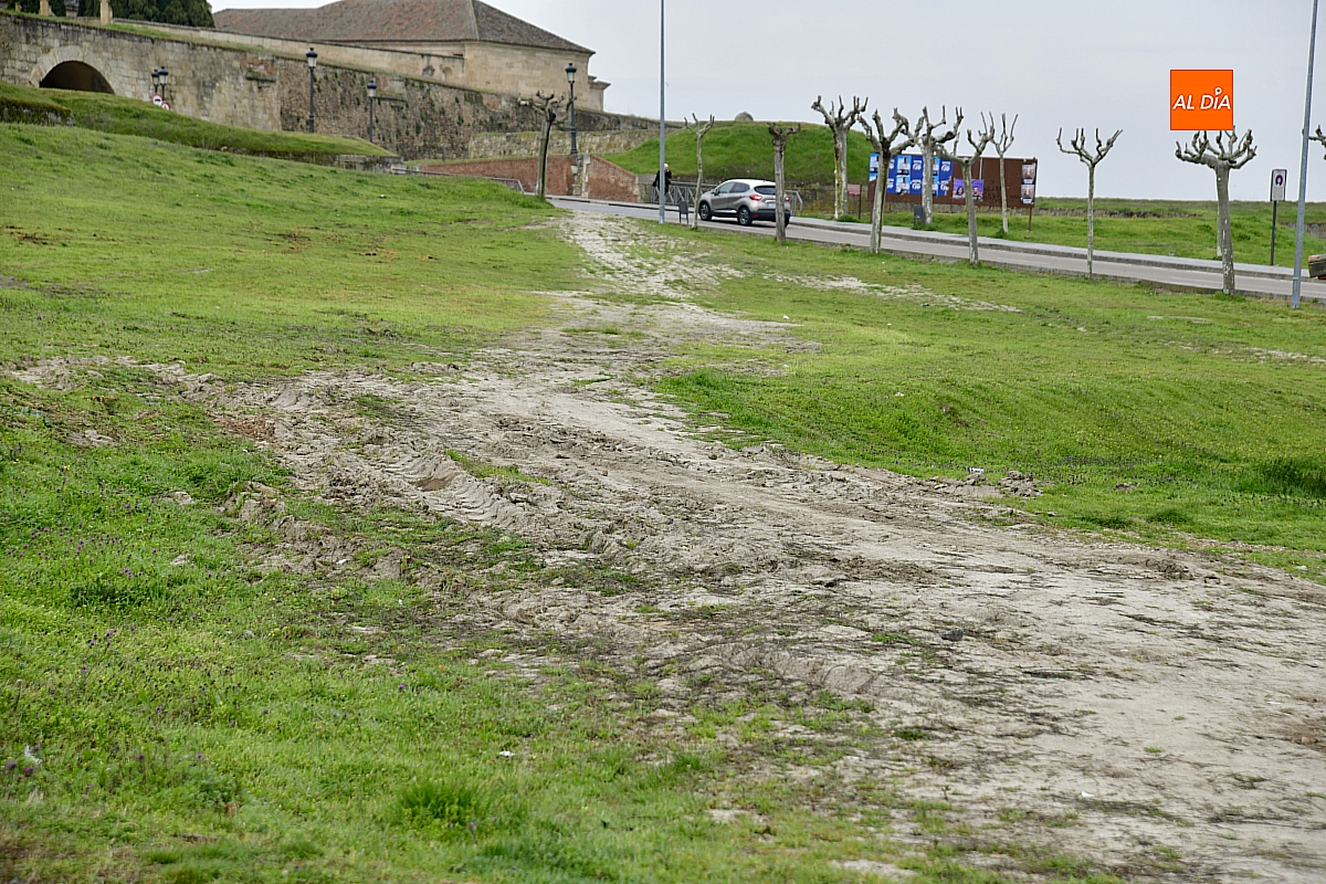 Los operarios municipales trabajan desde esta semana en la recuperación del glacis, un espacio emblemático que ha sufrido las consecuencias de la instalación ferial. Las recientes lluvias dejaron el terreno demasiado blando, lo que agravó el impacto de los vehículos de transporte.