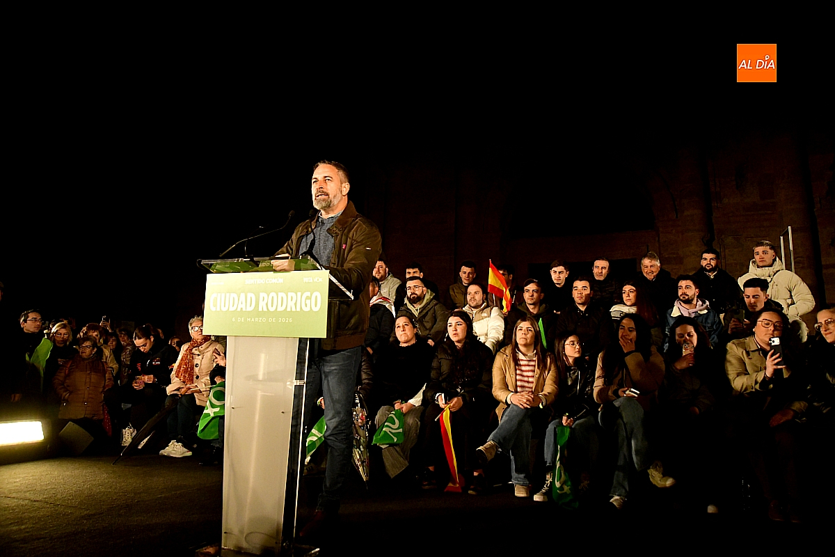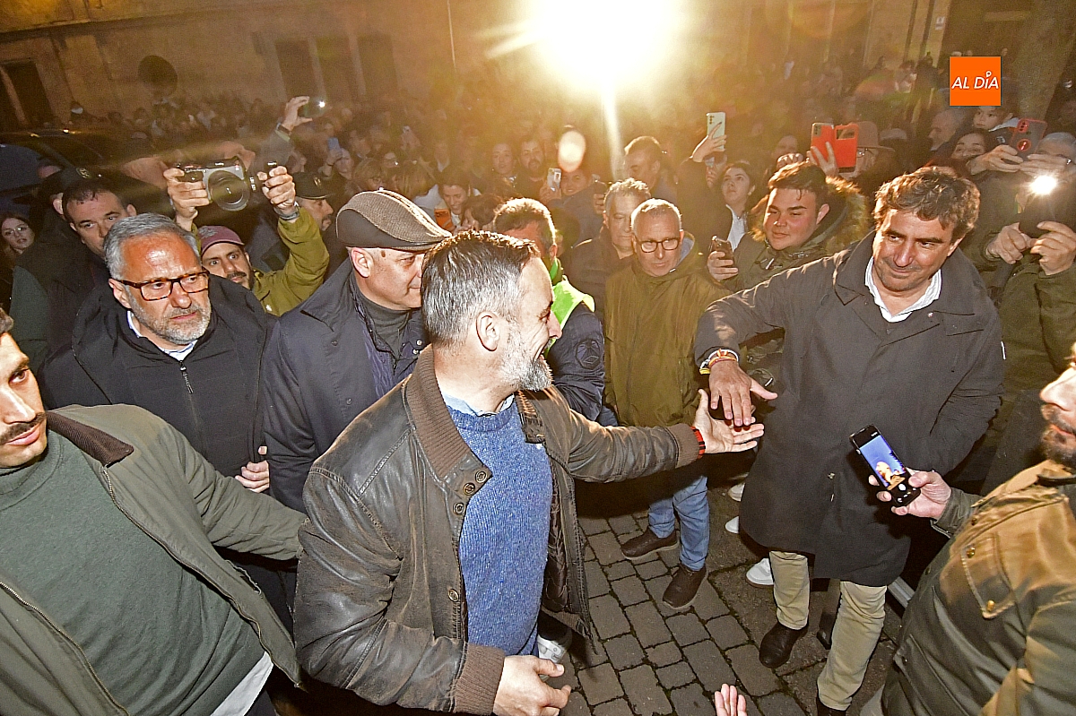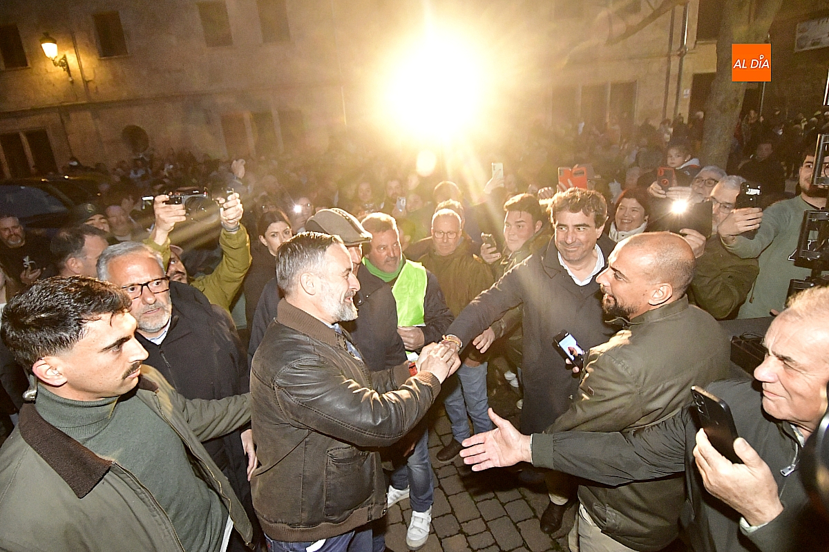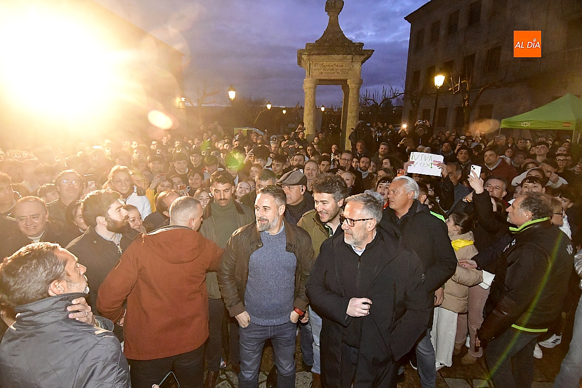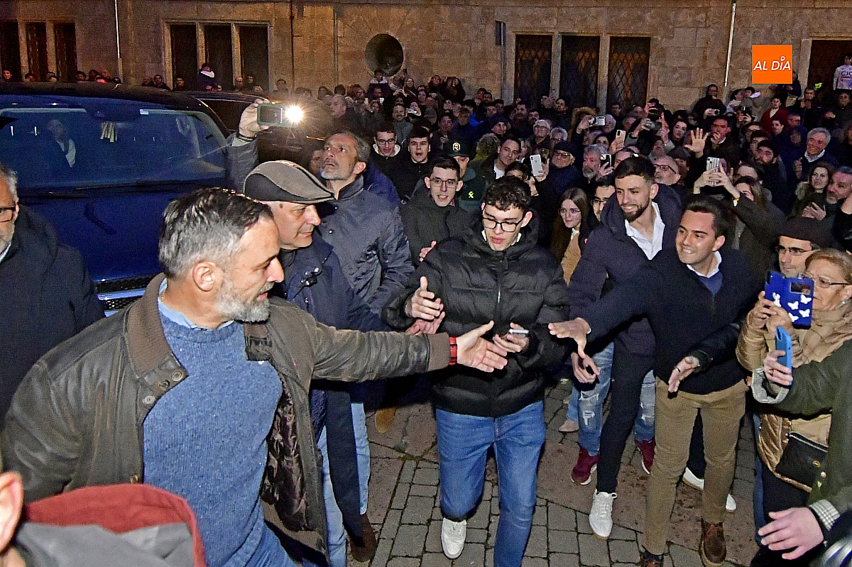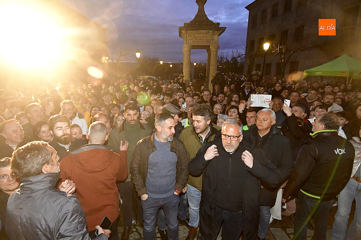Las tranquilas calles del centro histórico de Ciudad Rodrigo alteraron este viernes su ritmo habitual ante la llegada del líder nacional de Vox, Santiago Abascal, que acudió a Miróbriga para respaldar la candidatura a la Junta de Castilla y León de Carlos Pollán y al procurador por Salamanca, Carlos Menéndez.
