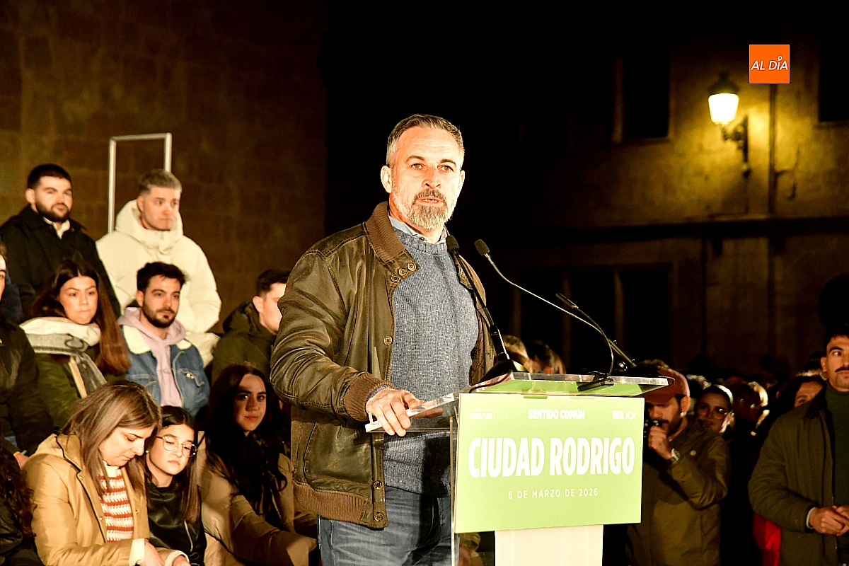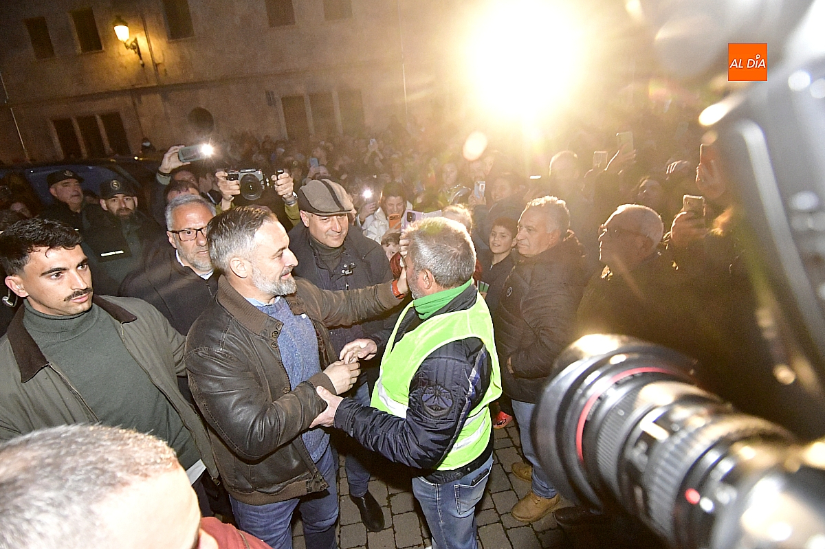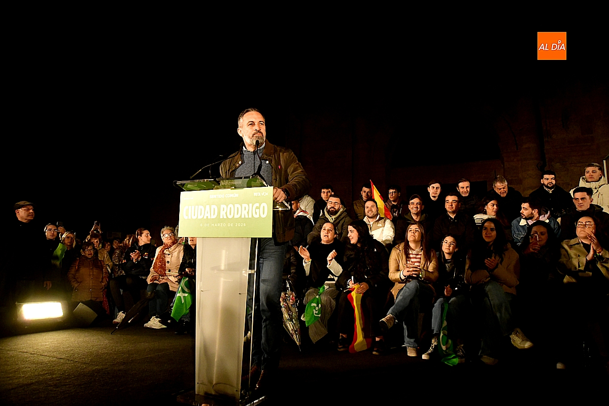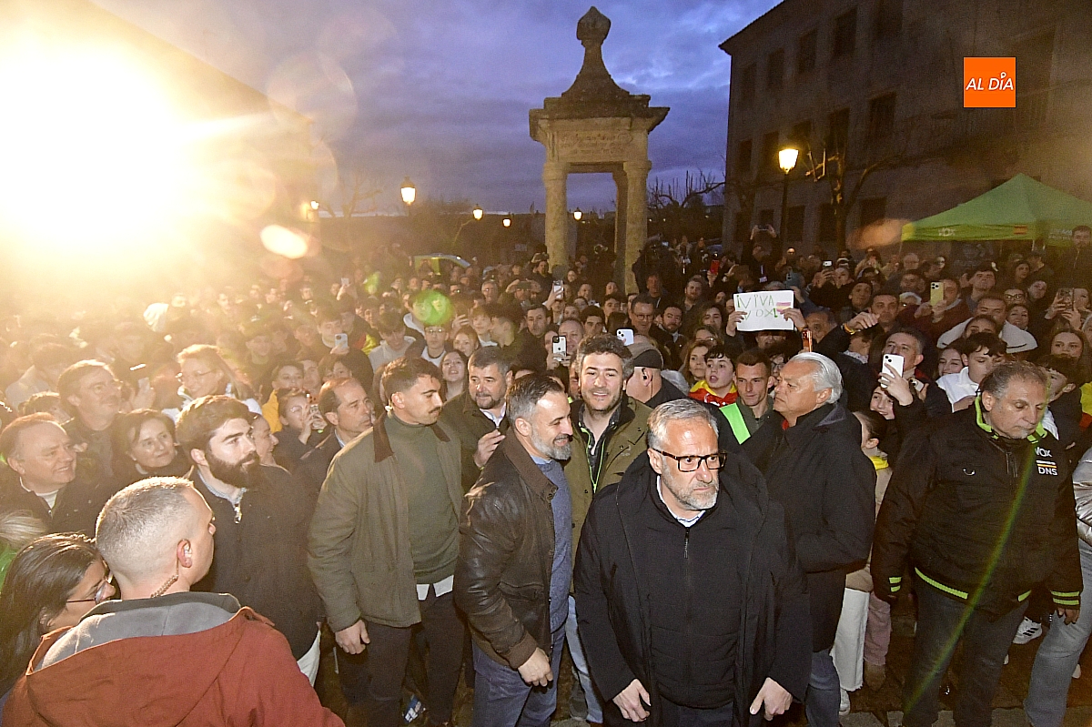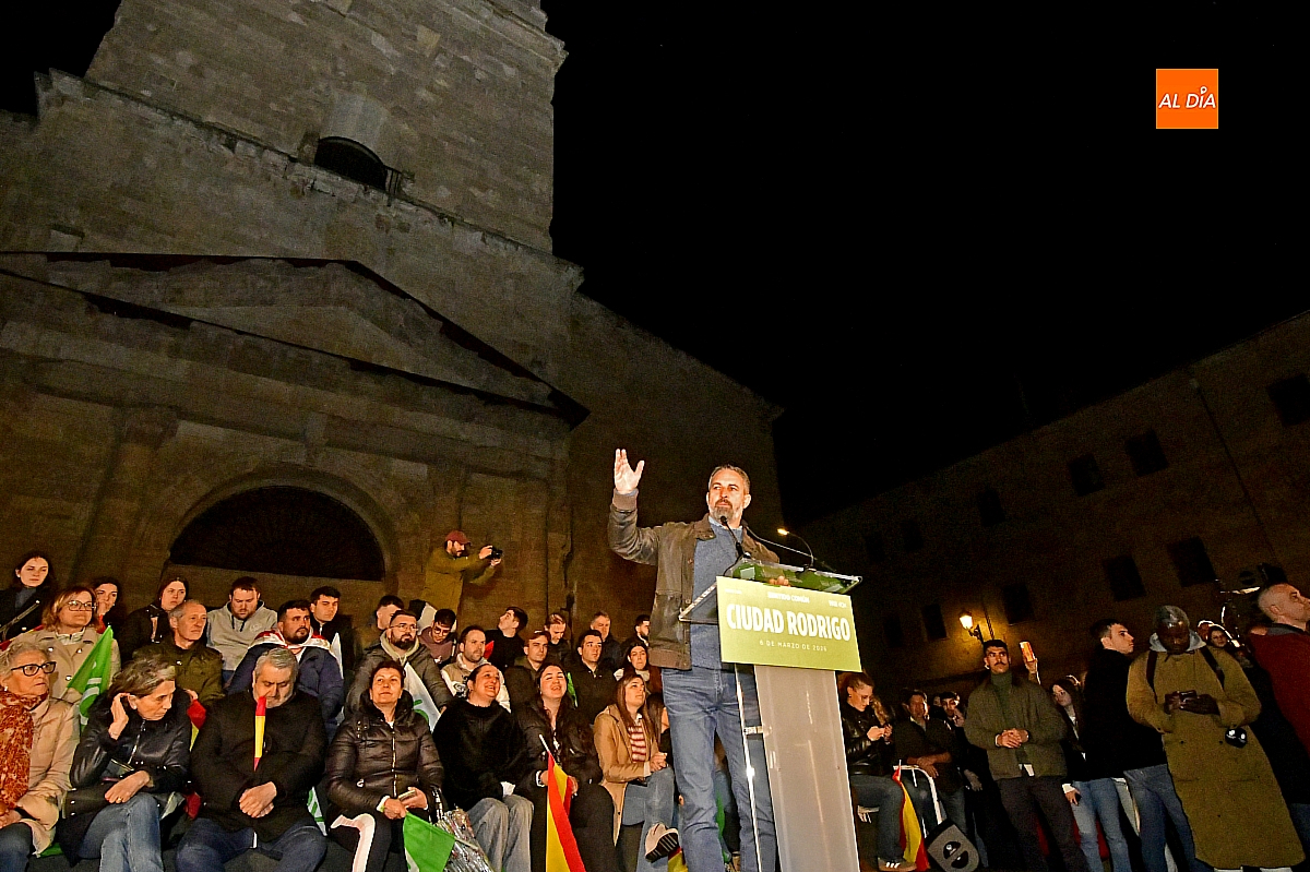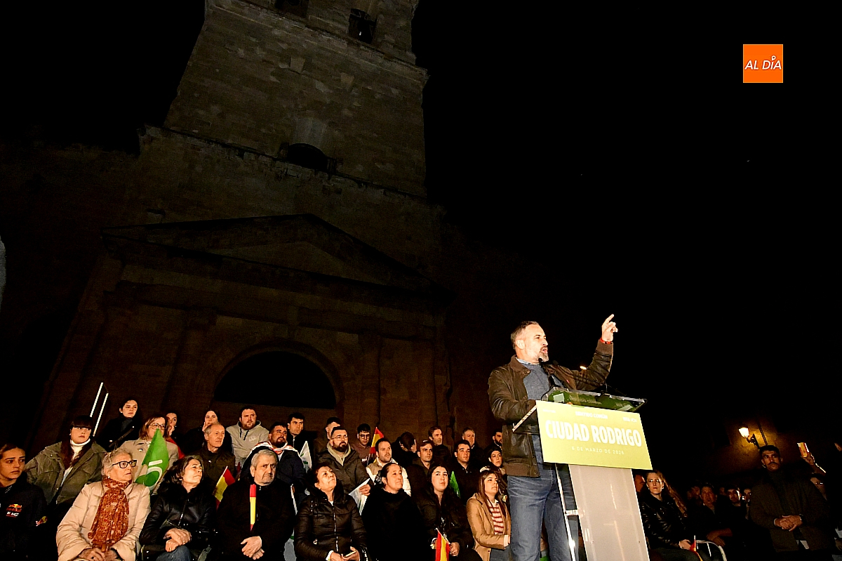 Las tranquilas calles del centro histórico de Ciudad Rodrigo alteraron este viernes su ritmo habitual ante la llegada del líder nacional de Vox, Santiago Abascal, que acudió a Miróbriga para respaldar la candidatura a la Junta de Castilla y León de Carlos Pollán y al procurador por Salamanca, Carlos Menéndez.