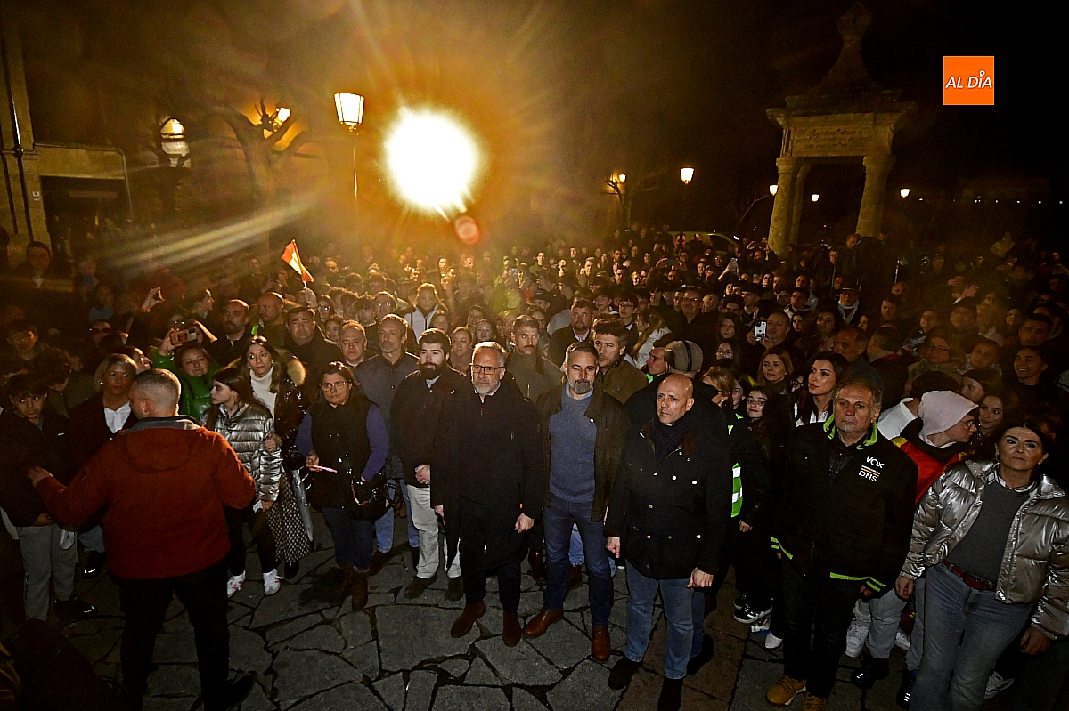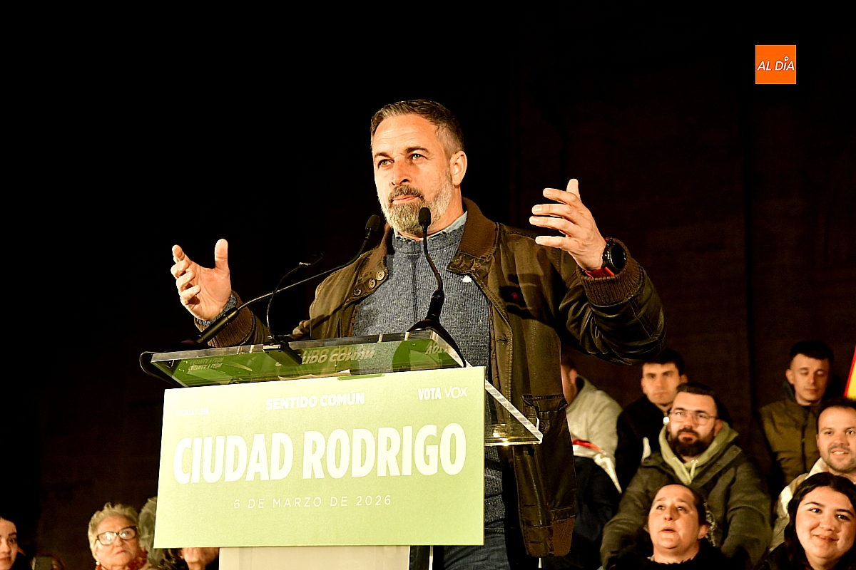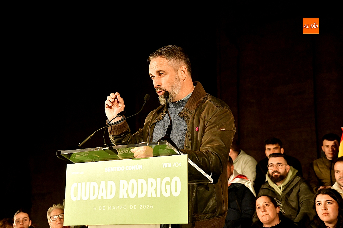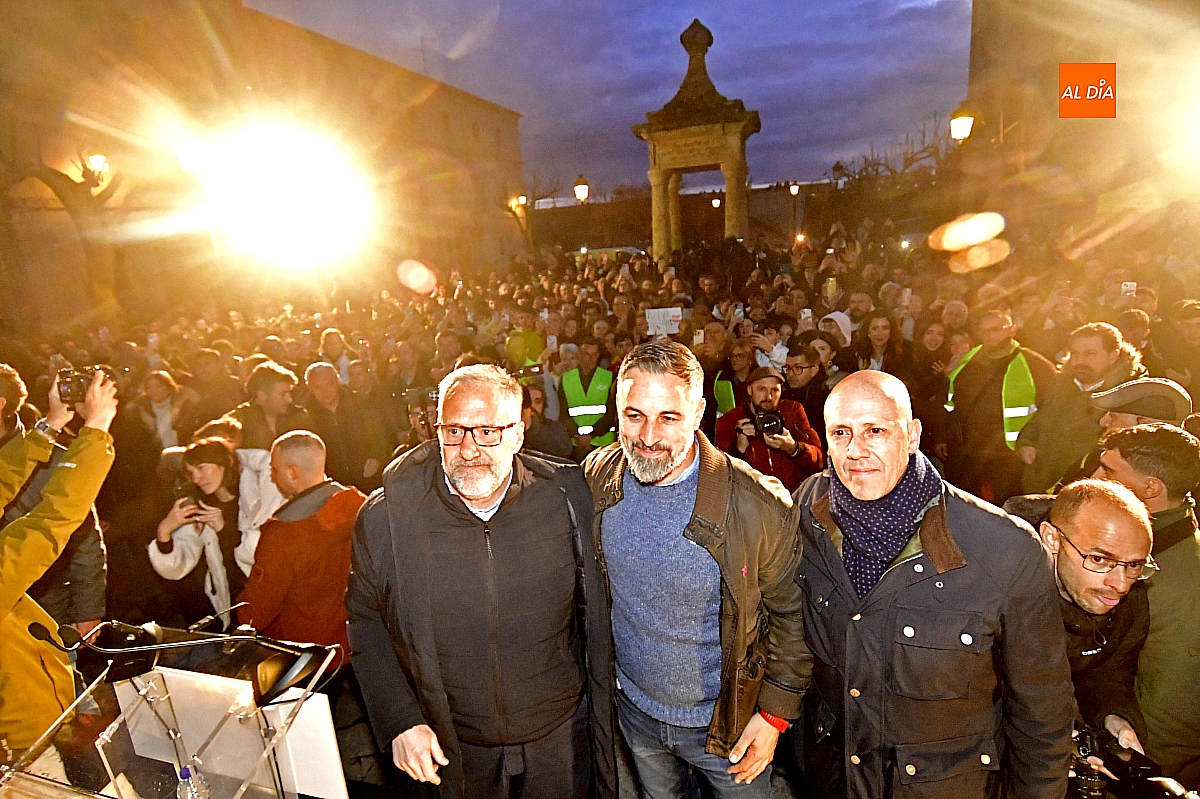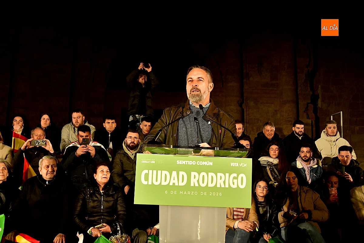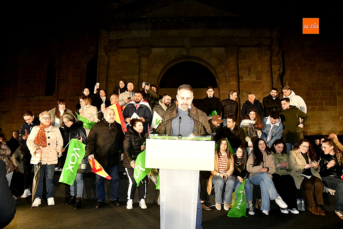 Las tranquilas calles del centro histórico de Ciudad Rodrigo alteraron este viernes su ritmo habitual ante la llegada del líder nacional de Vox, Santiago Abascal, que acudió a Miróbriga para respaldar la candidatura a la Junta de Castilla y León de Carlos Pollán y al procurador por Salamanca, Carlos Menéndez.