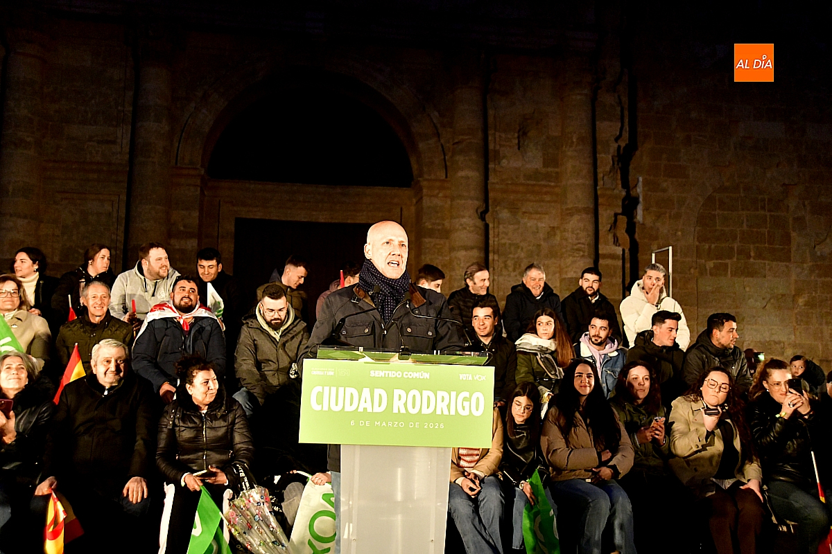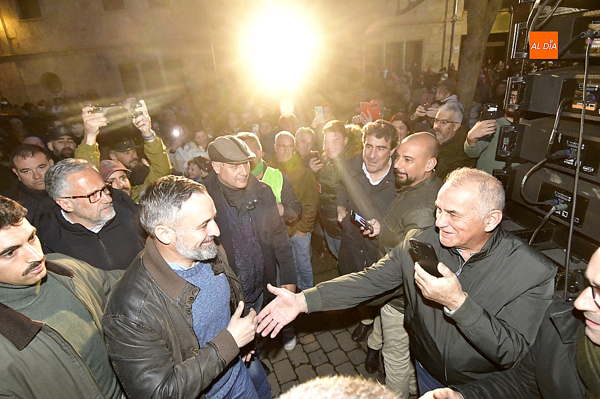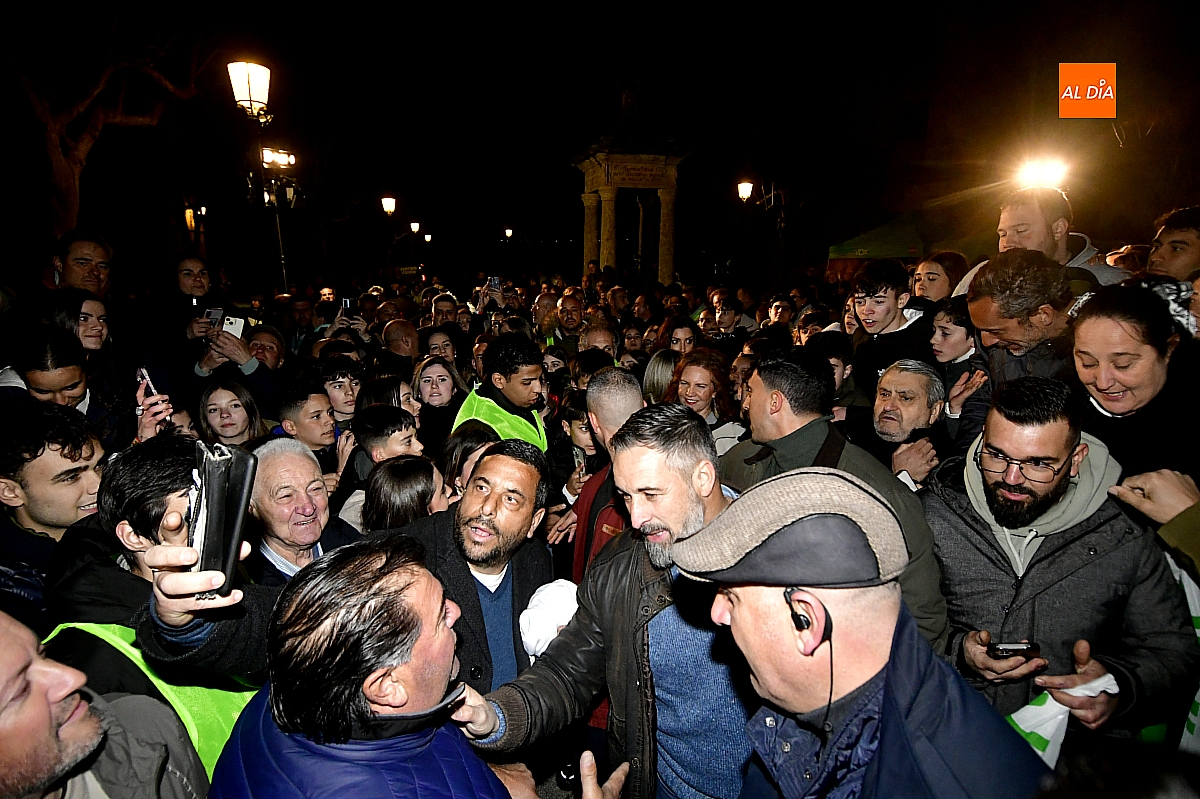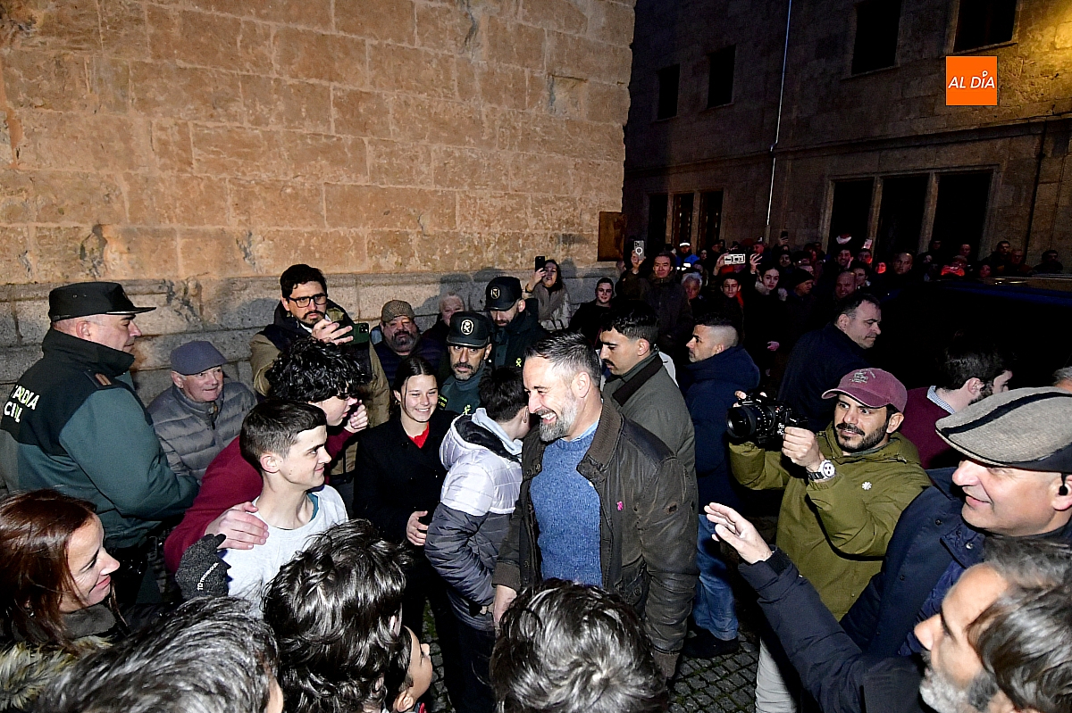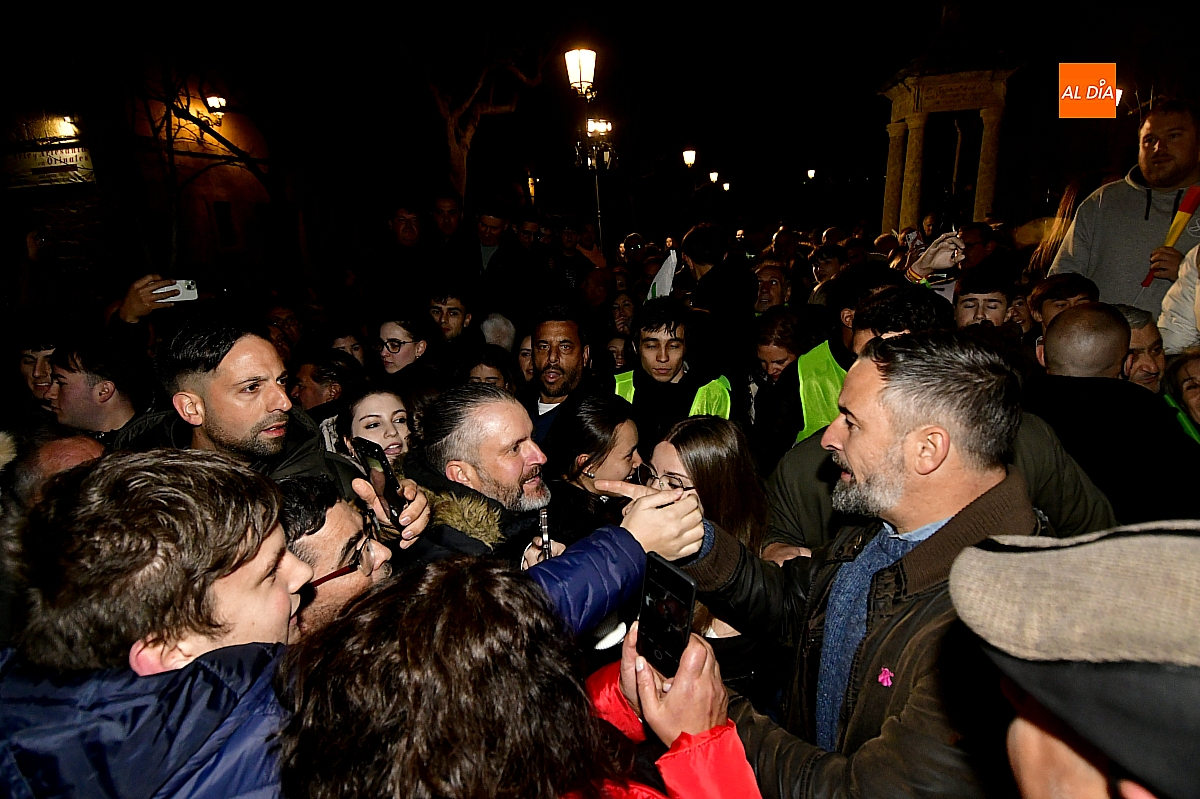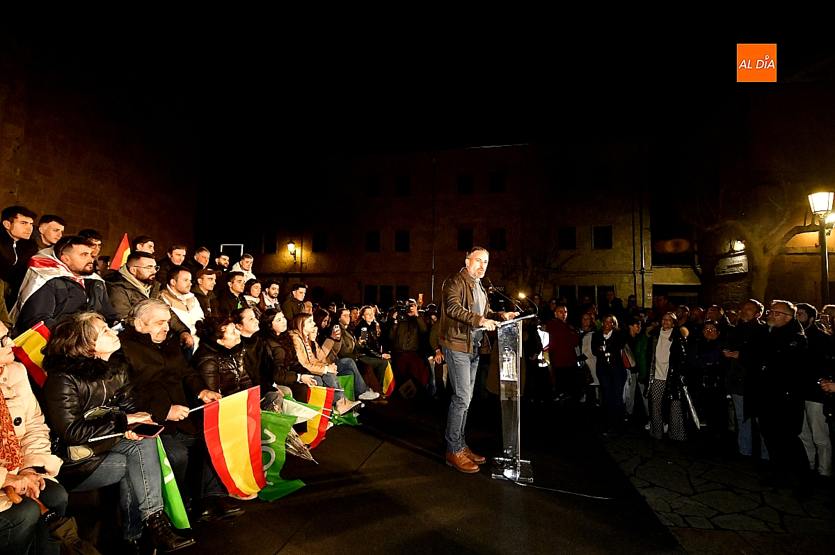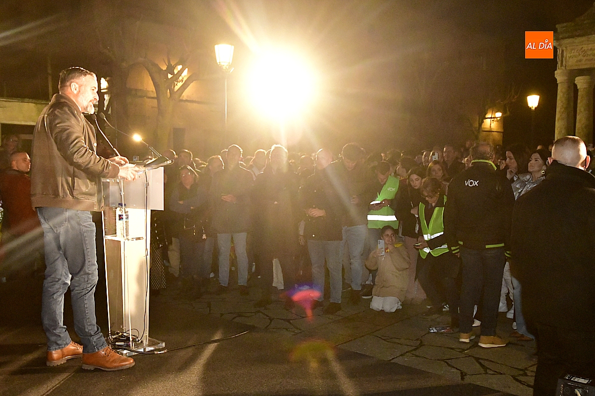 Las tranquilas calles del centro histórico de Ciudad Rodrigo alteraron este viernes su ritmo habitual ante la llegada del líder nacional de Vox, Santiago Abascal, que acudió a Miróbriga para respaldar la candidatura a la Junta de Castilla y León de Carlos Pollán y al procurador por Salamanca, Carlos Menéndez.