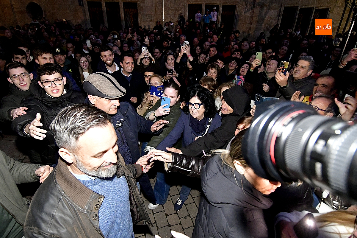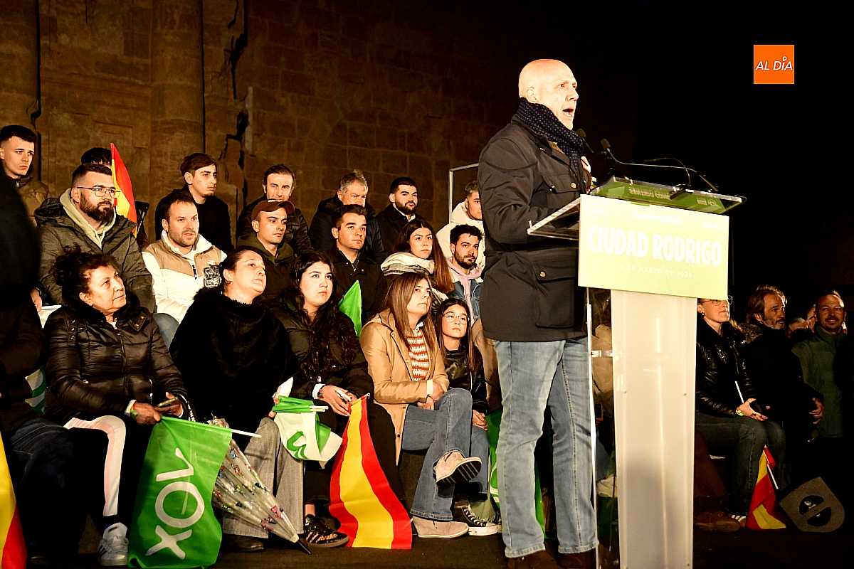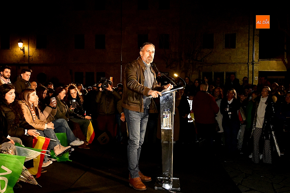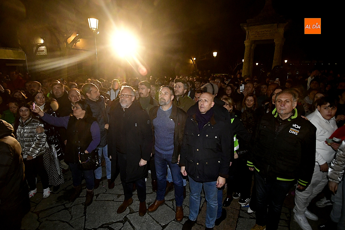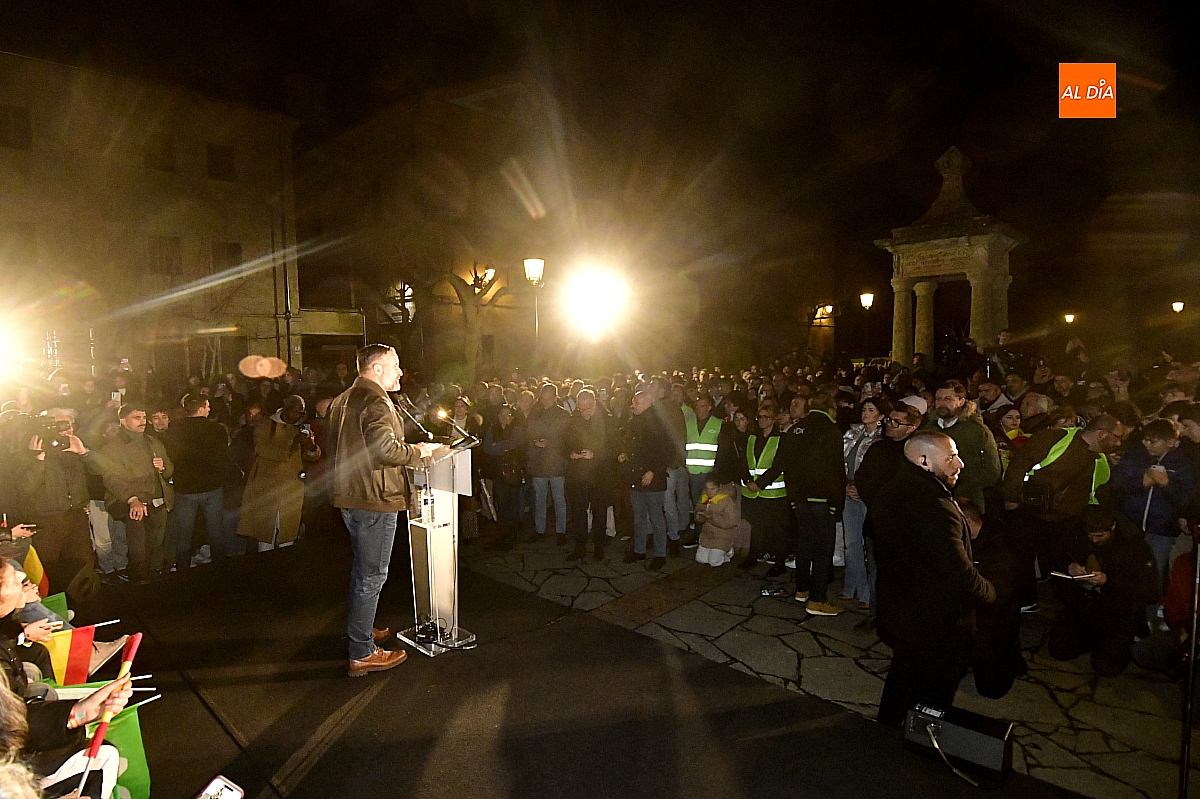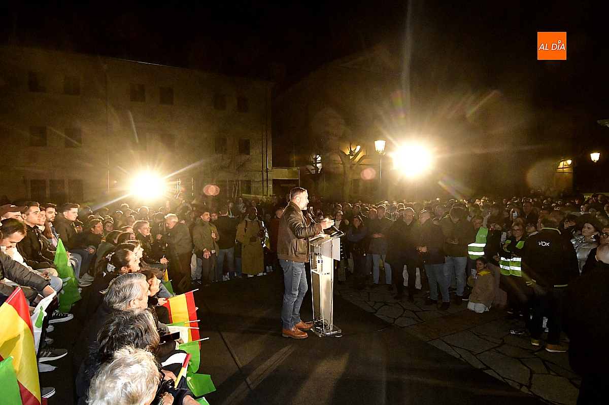 Las tranquilas calles del centro histórico de Ciudad Rodrigo alteraron este viernes su ritmo habitual ante la llegada del líder nacional de Vox, Santiago Abascal, que acudió a Miróbriga para respaldar la candidatura a la Junta de Castilla y León de Carlos Pollán y al procurador por Salamanca, Carlos Menéndez.