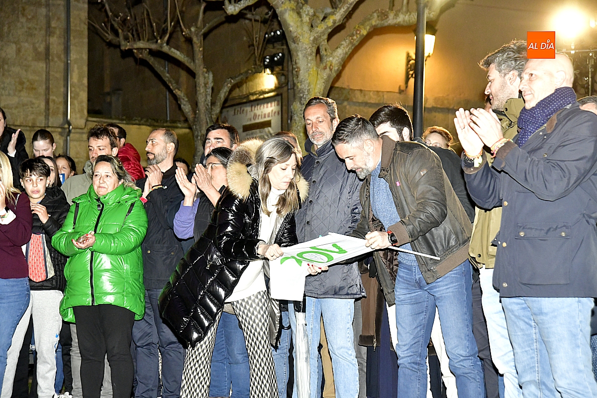 Carlos Menéndez y Carlos Pollán fueron arropados por el líder nacional de Vox en un mitin en una concurrida Plaza de Herrasti