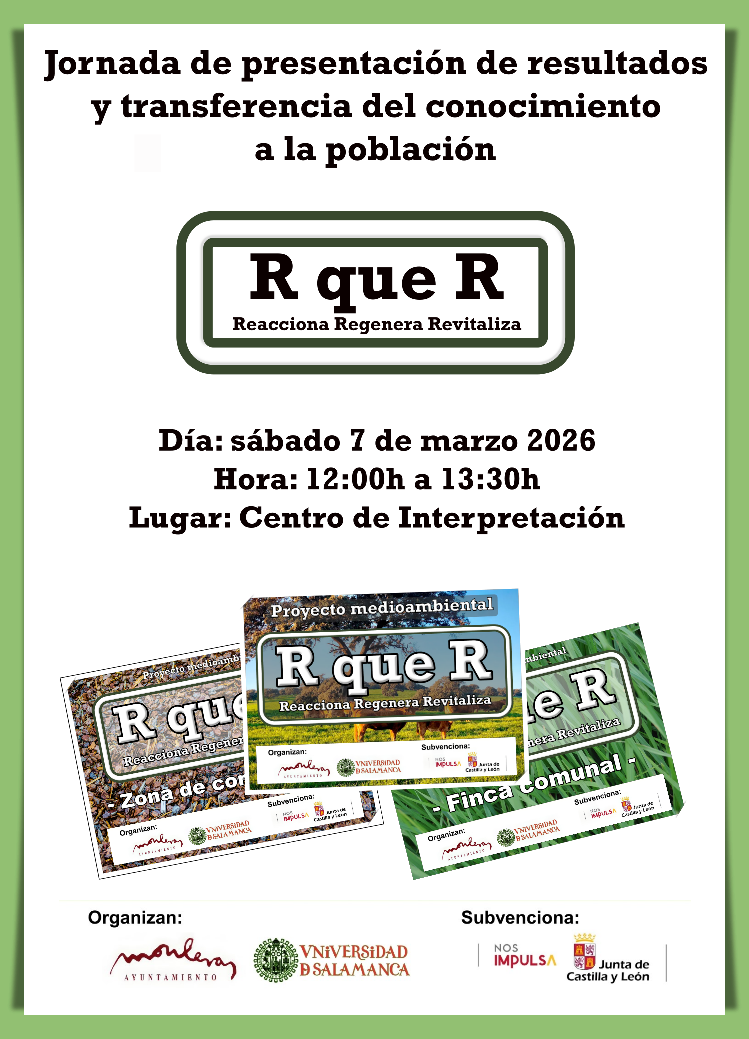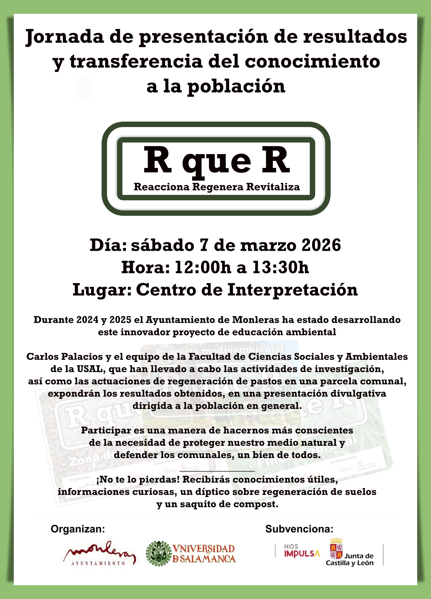 El Ayuntamiento de Monleras ha organizado para este sábado, 7 de marzo de 2026, una jornada divulgativa destinada a la presentación de los resultados del proyecto medioambiental 'MONLERAS R QUE R: Reacciona, Regenera, Revitaliza', así como a la transferencia del conocimiento generado a la sociedad.