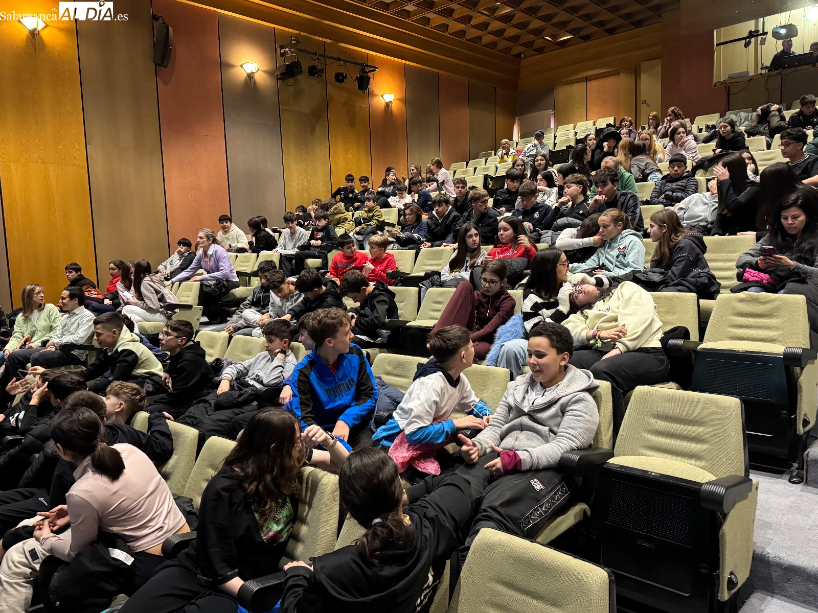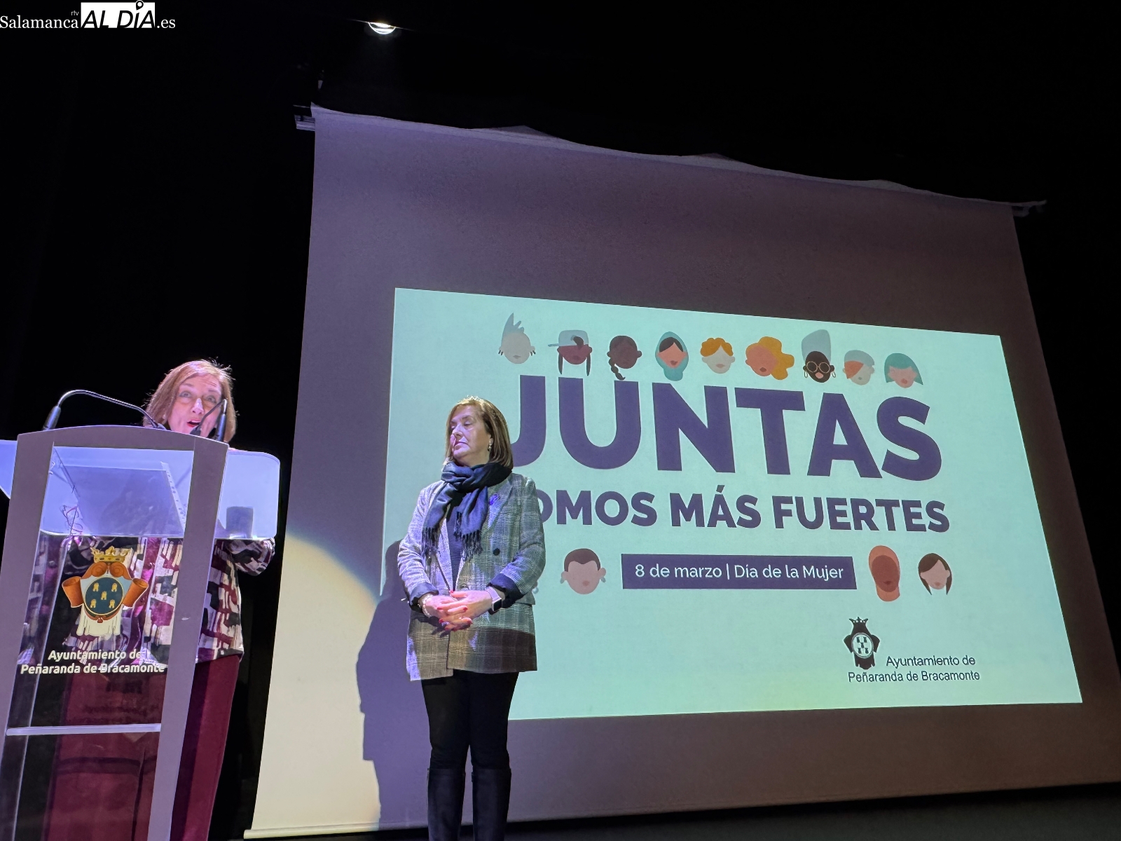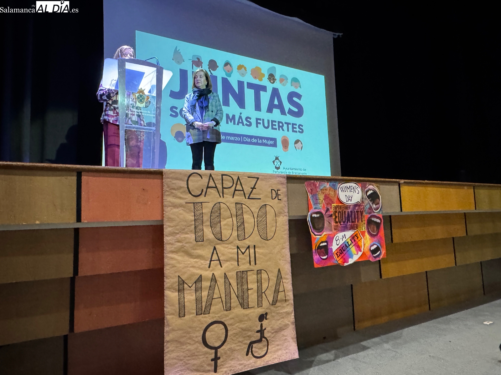 Multitud de estudiantes de los centros educativos peñarandinos y vecinos se han dado cita este viernes en el teatro del CDS para asistir a la lectura del manifiesto con motivo del Día Internacional de la Mujer. El acto institucional ha tenido que cambiar su ubicación original prevista en el templete, ya que, como se ha explicado al inicio, "era prácticamente imposible por el viento y la lluvia".