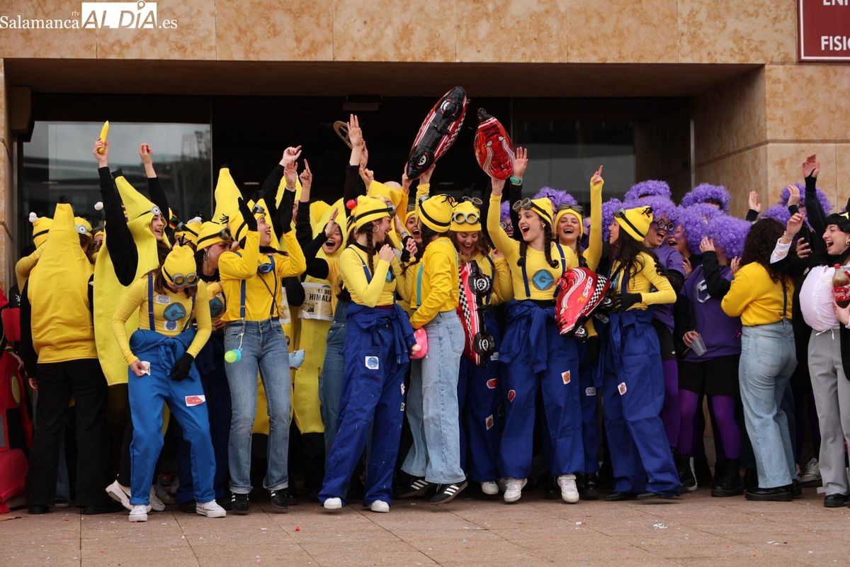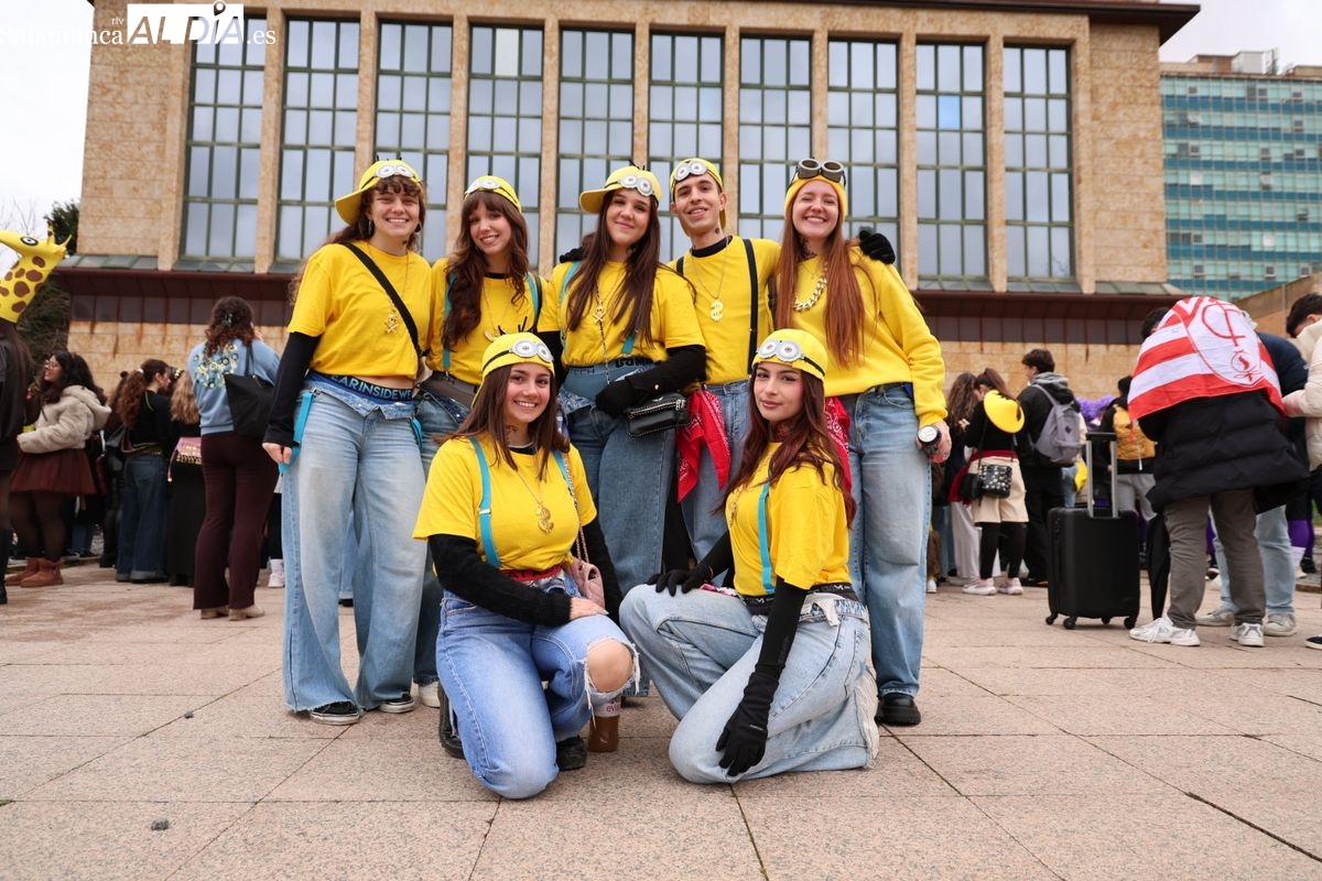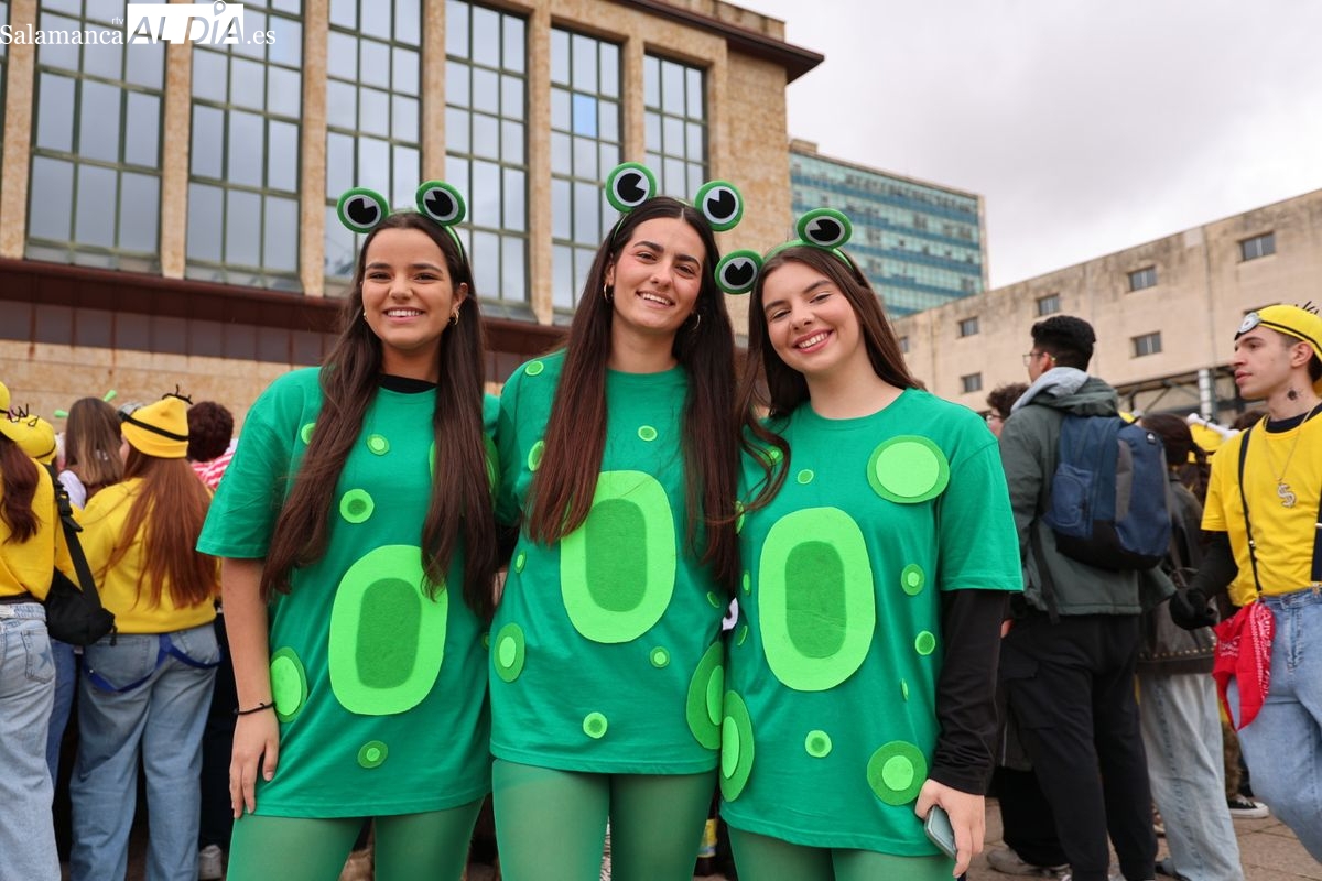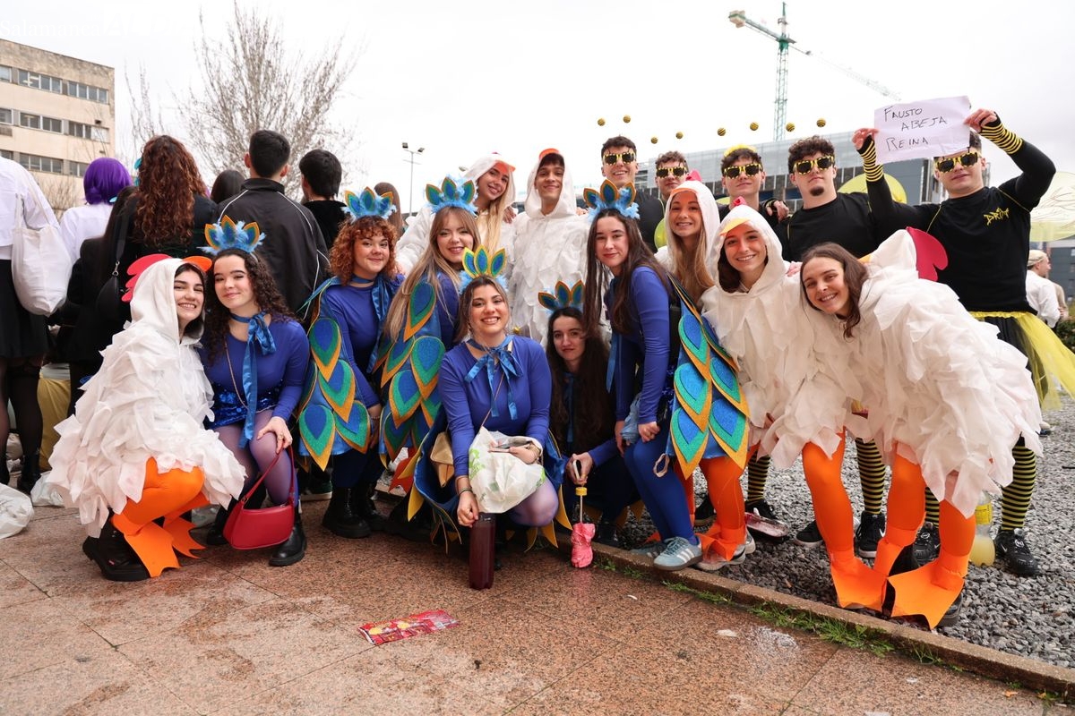 Tras la concentración inicial junto a las puertas de la facultad, la celebración ha continuado su curso. Los alumnos han iniciado un vistoso desfile conjunto para prolongar el ambiente lúdico fuera del recinto estrictamente académico.