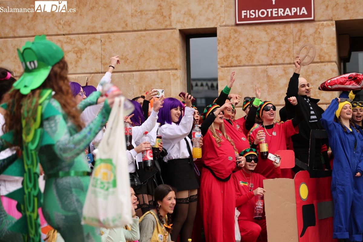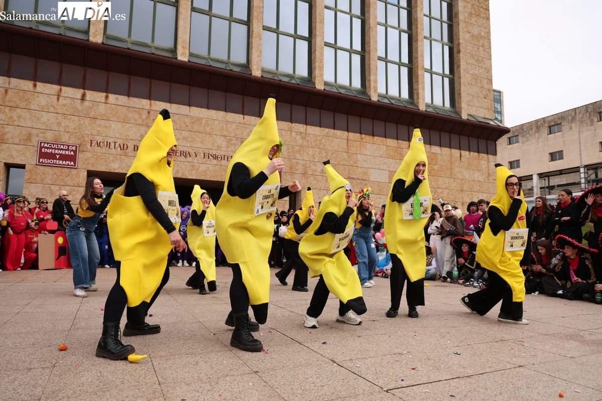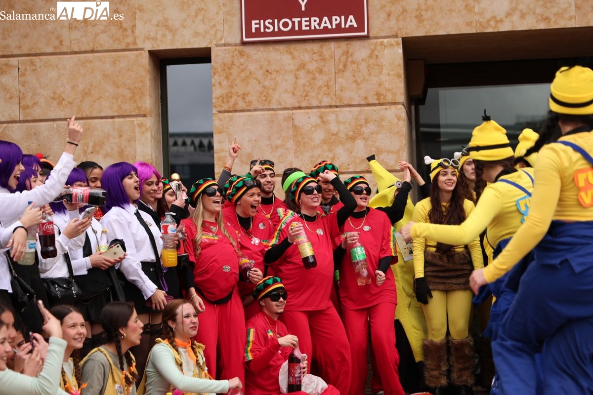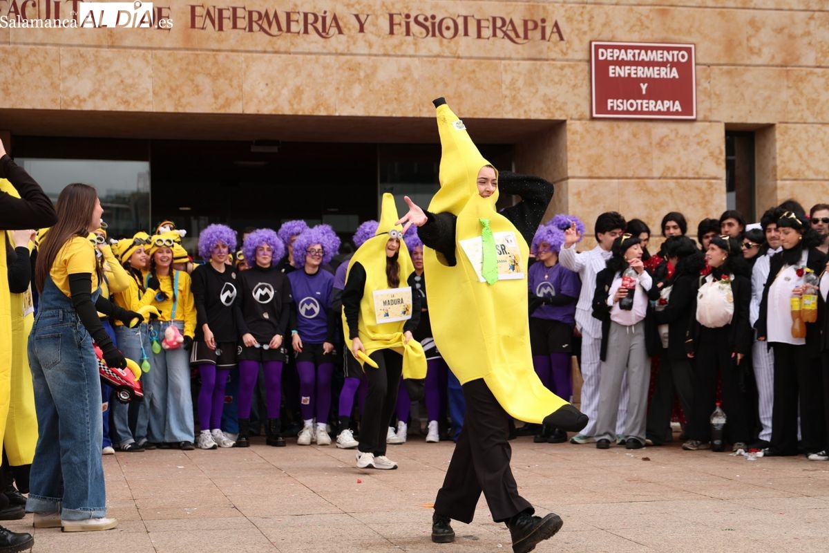 Tras la concentración inicial junto a las puertas de la facultad, la celebración ha continuado su curso. Los alumnos han iniciado un vistoso desfile conjunto para prolongar el ambiente lúdico fuera del recinto estrictamente académico.