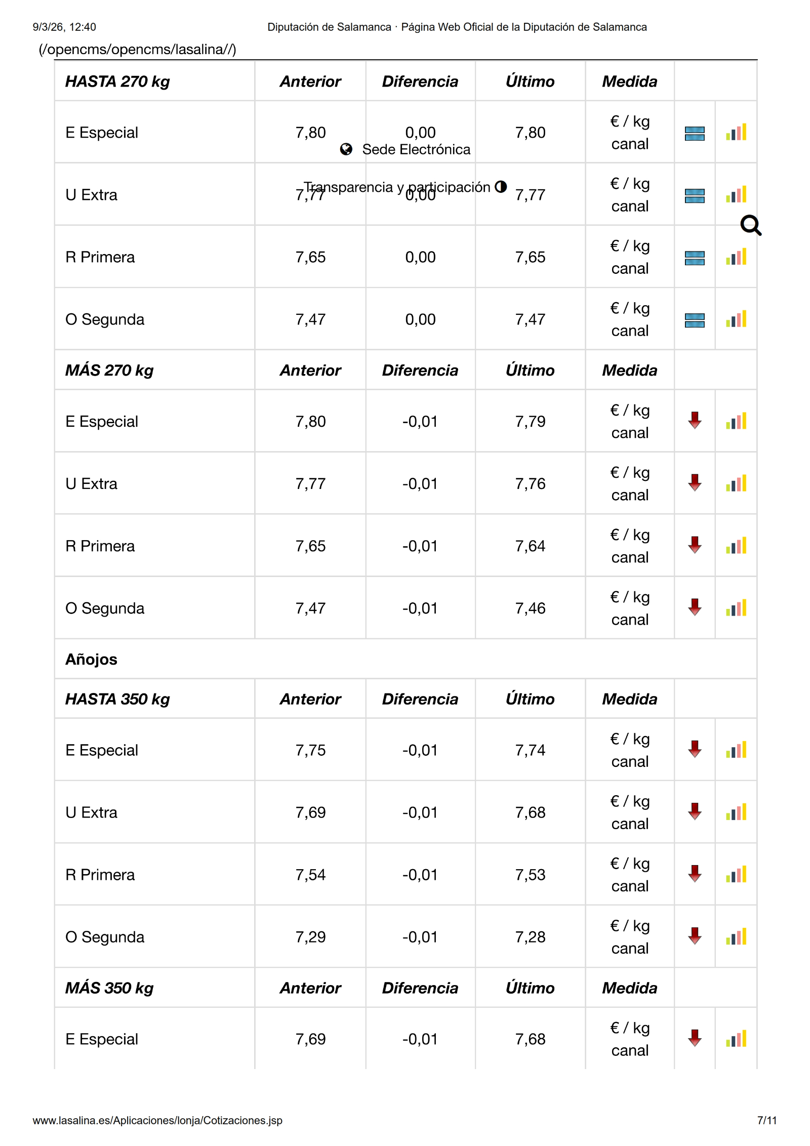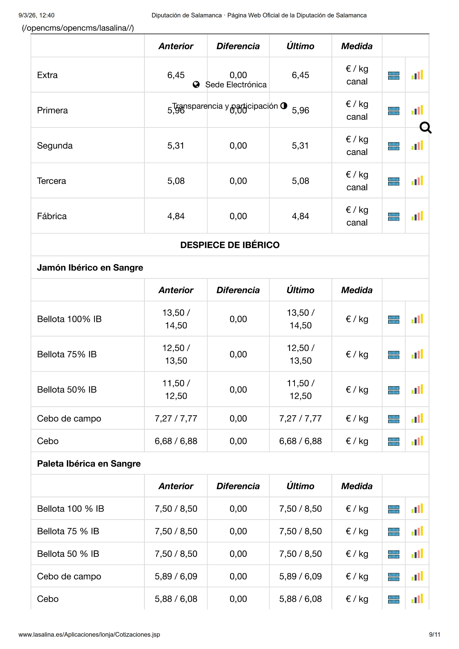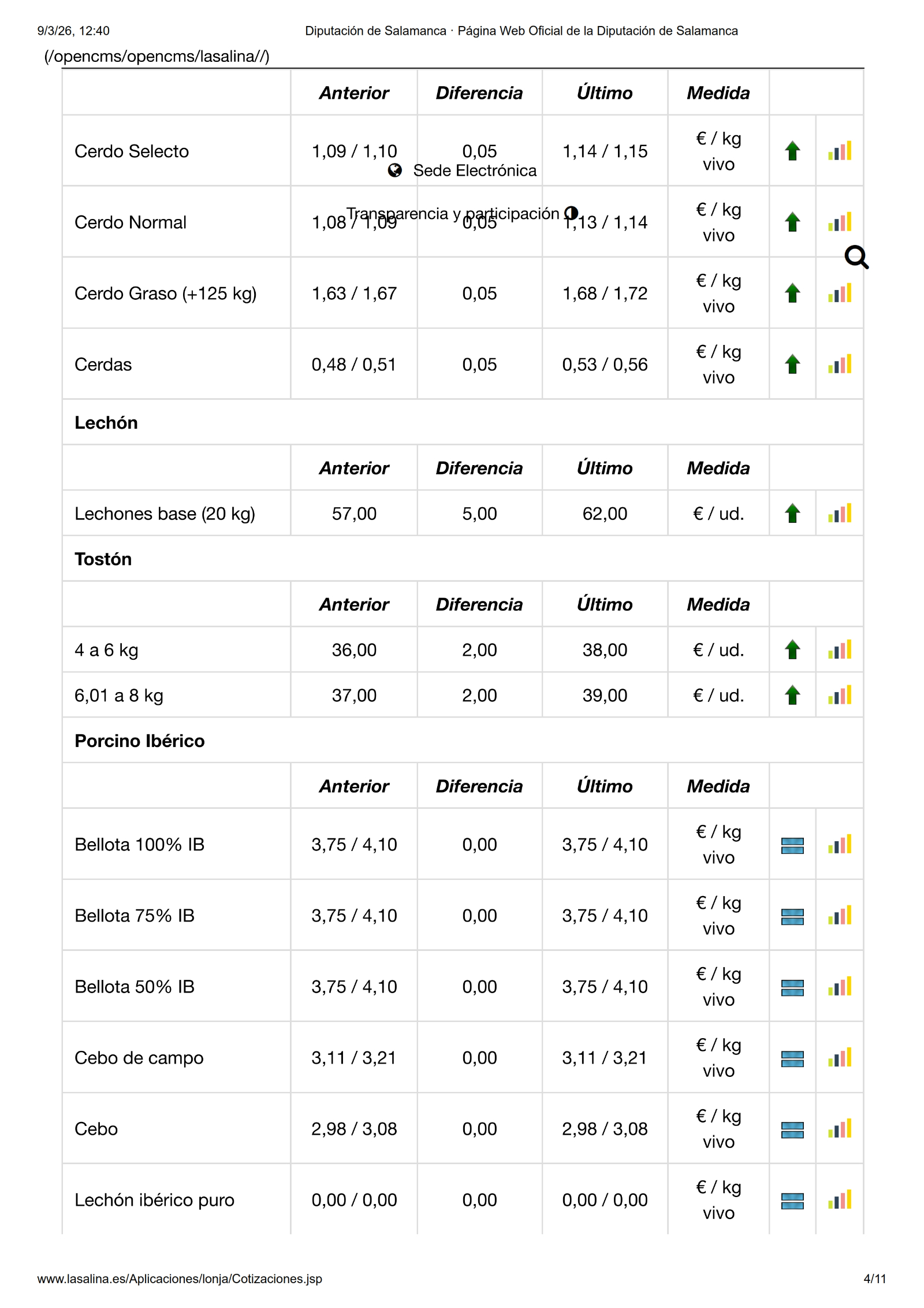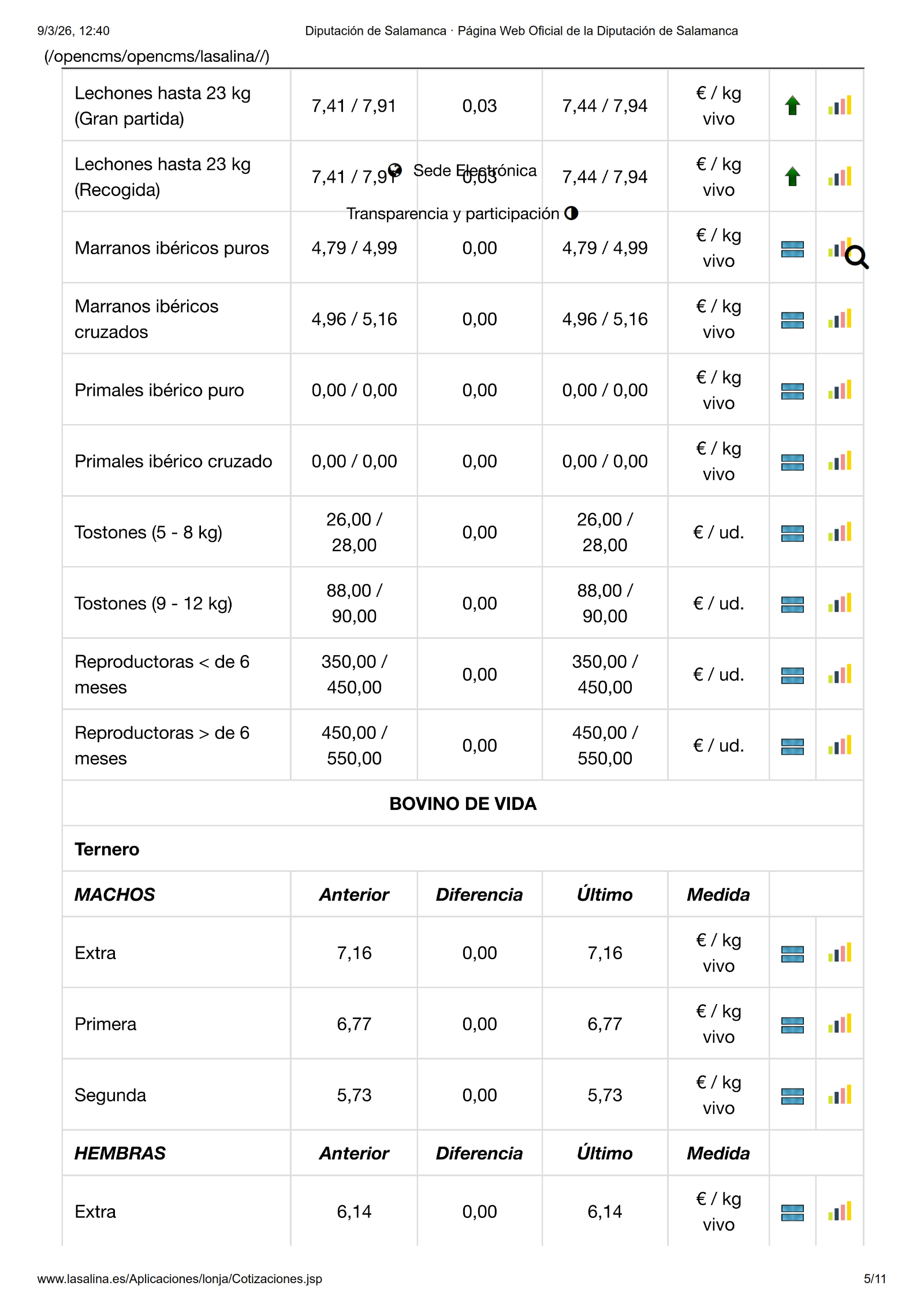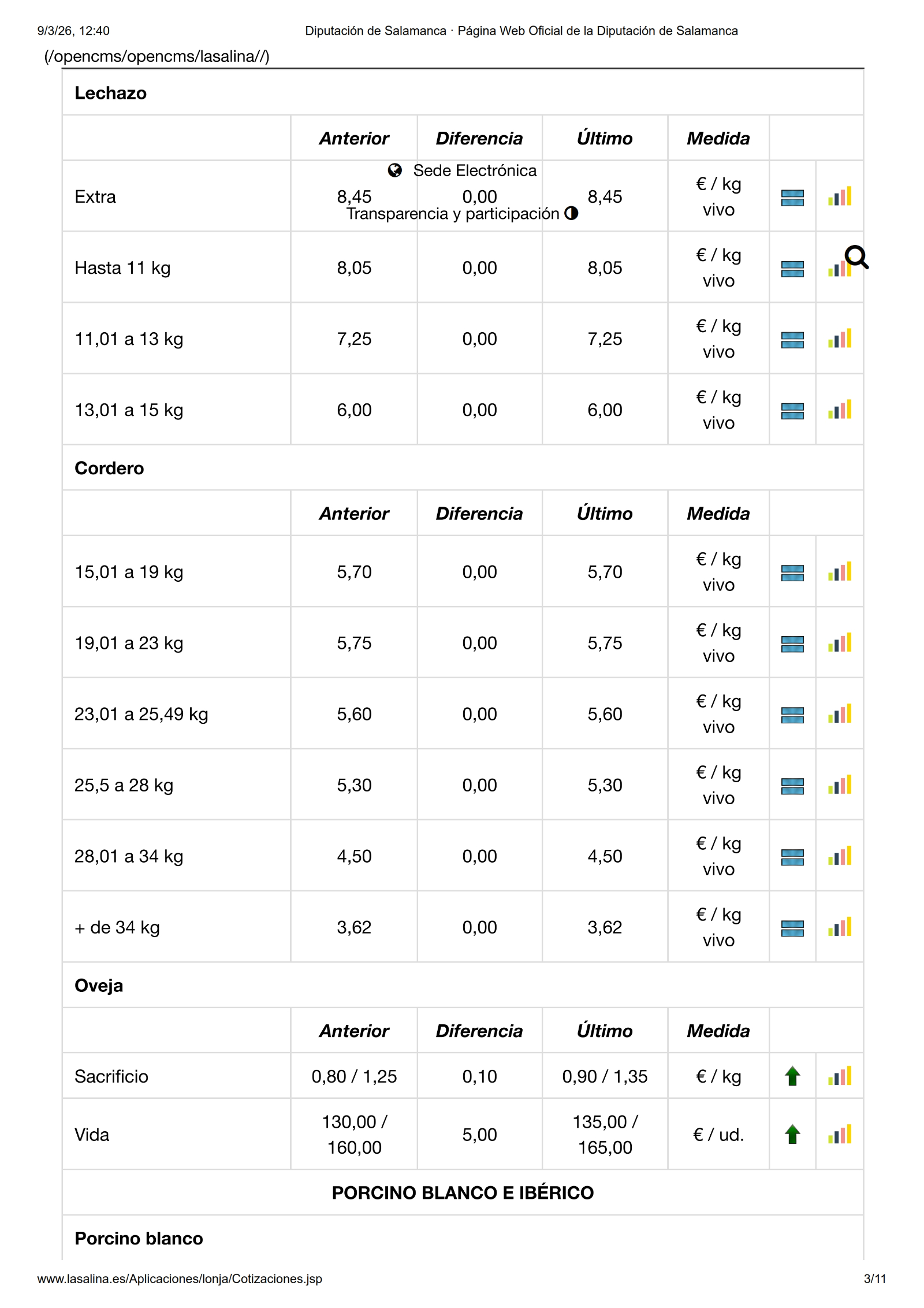 En la Mesa de Ovino solo se mueve el precio de las ovejas, en esta ocasión con una subida de 0,10 €/kg las de sacrificio y de 5,00 €/ud. las de vida. Por su parte, en la Mesa de Porcino blanco, subida lineal de 0,05 €/kg para el selecto, normal, graso y cerdas. También los lechones suben 5,00 €/ud. y 2,00 €/ud. los tostones de ambas categorías. En Ibérico solo se mueven los lechones, en este caso con una subida de 0,03 €/kg.