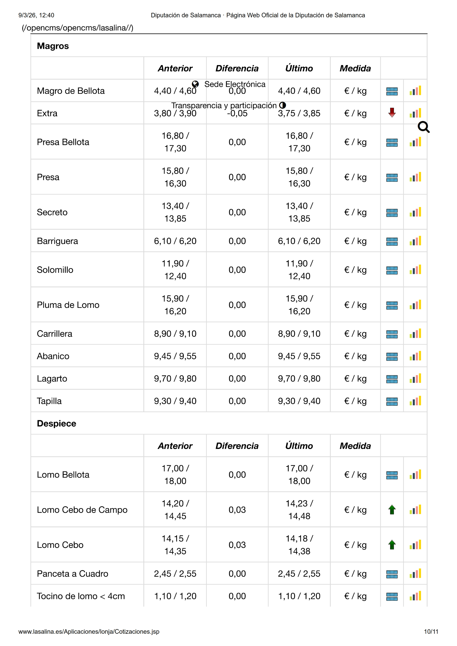 En la Mesa de Despiece de Ibérico, el magro extra cae -0,05 €/kg, mientras que el lomo de cebo y el de cebo de campo suben 0,03 €/kg.