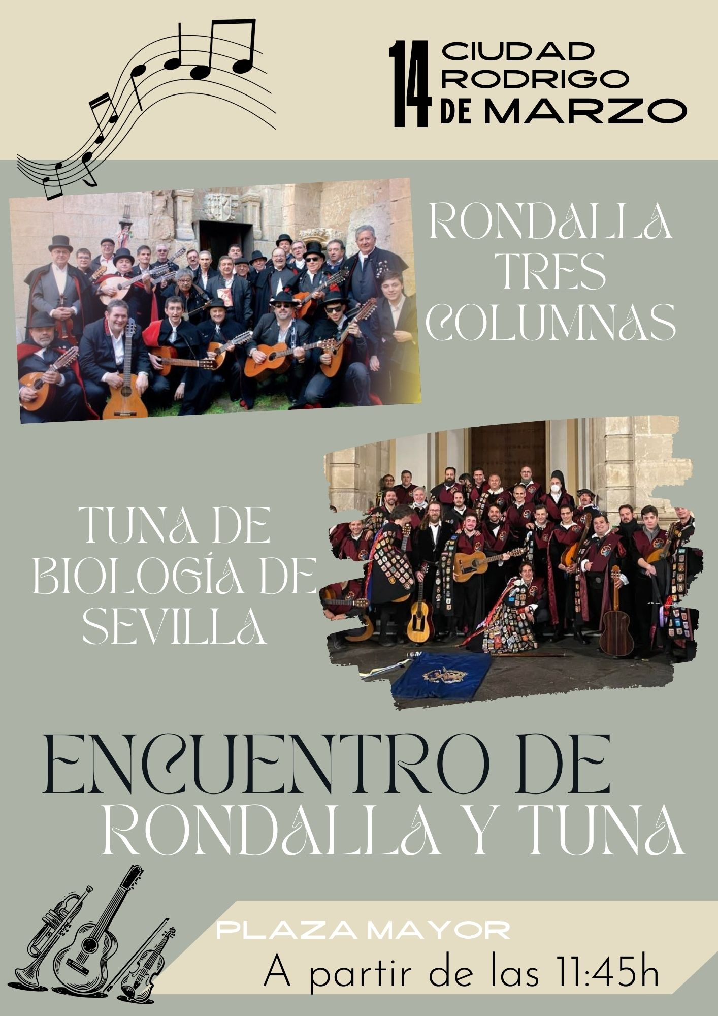 Ciudad Rodrigo acogerá del 13 al 15 de marzo un encuentro musical entre la Rondalla Tres Columnas y la Tuna de Biología de Sevilla. El acto central será un recital conjunto en la Plaza Mayor este sábado a las 11:45 horas, tras una recepción oficial en el Ayuntamiento.