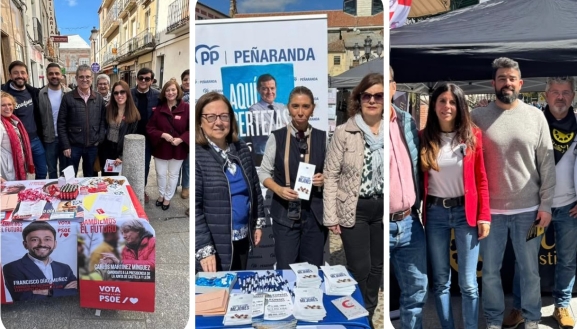 Este jueves se ha celebrado en Peñaranda el último mercadillo semanal antes de los comicios, una jornada que las distintas formaciones políticas han aprovechado para acercar sus propuestas a los vecinos instalando mesas informativas en diferentes puntos del centro de la ciudad.