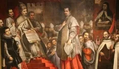 Una de las obras centrales de la exposición es una pintura que retrata a los principales impulsores del proceso. El protagonismo visual recae sobre el papa Gregorio XV y su sobrino, el cardenal y arzobispo de Bolonia Ludovico Ludovisi, quien ejerció como procurador de las causas y maestro de ceremonias.