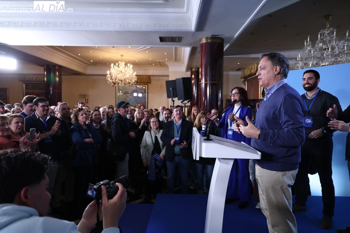 Por su parte, Carlos García Carbayo, presidente del Partido Popular de Salamanca, ha tomado la palabra ante los presentes. "El Partido Popular ha ganado las elecciones y Alfonso Fernández Mañueco va a ser nuestro próximo presidente. Queremos dar la enhorabuena a nuestro presidente regional. Los salmantinos y castellanos leoneses han vuelto a confiar en el PP y han depositado su confianza en un presidente", ha comenzado diciendo.