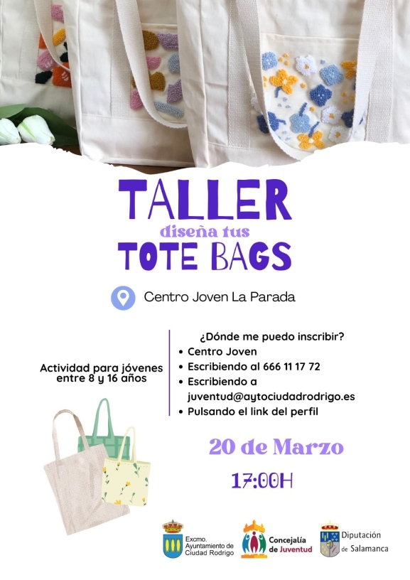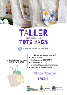 El Ayuntamiento de Ciudad Rodrigo, a través de su Concejalía de Juventud, ha organizado un taller de diseño de 'tote bags' dirigido al público juvenil. La actividad se desarrollará el próximo 20 de marzo en las instalaciones del Centro Joven La Parada.