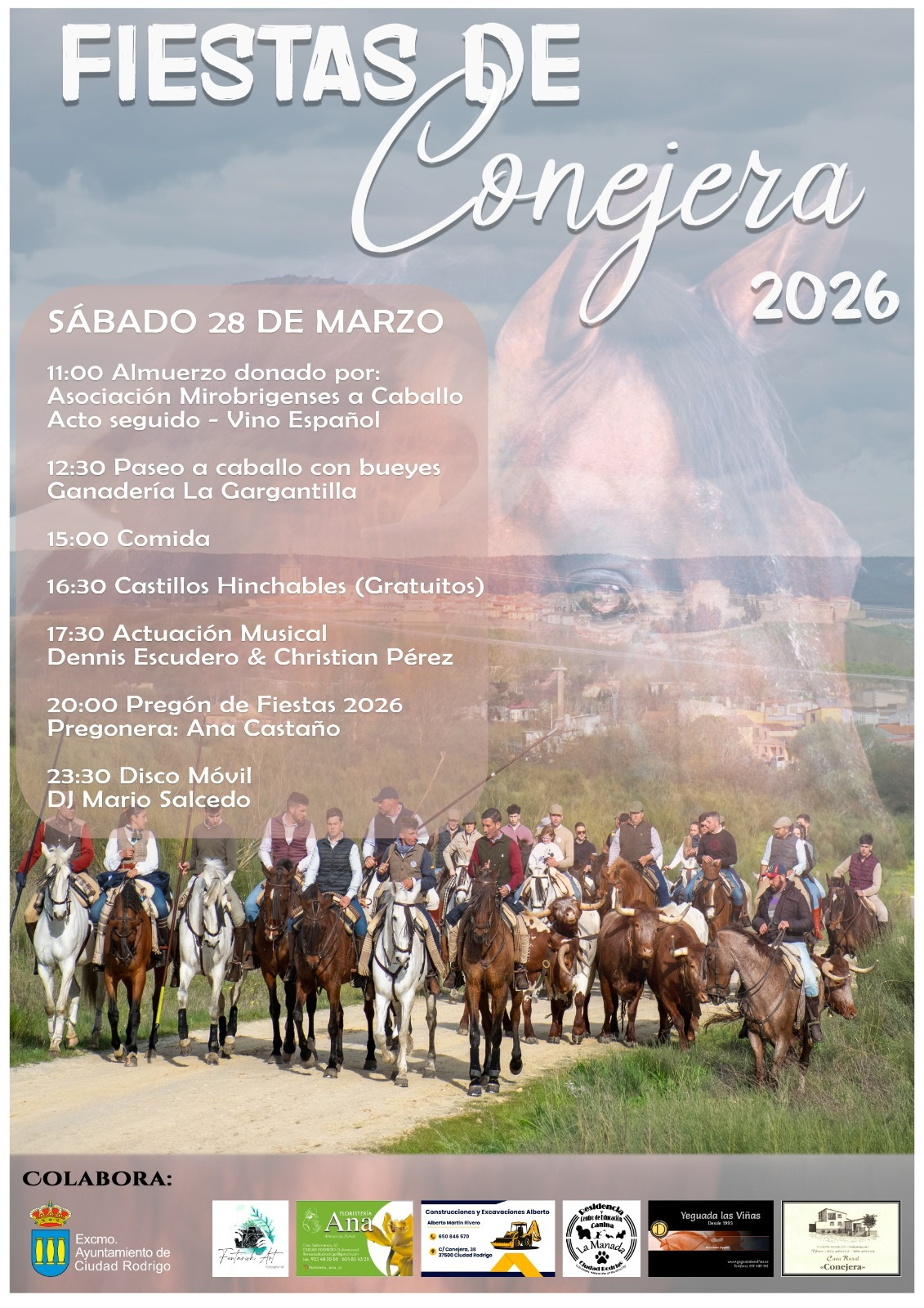 La pedanía mirobrigense de Conejera concentrará sus fiestas de 2026 en una única jornada el sábado 28 de marzo. El programa incluye un paseo a caballo con bueyes, actuaciones musicales y actividades infantiles. El pregón correrá a cargo de Ana Castaño, en un evento respaldado por el Ayuntamiento de Ciudad Rodrigo y empresas locales.