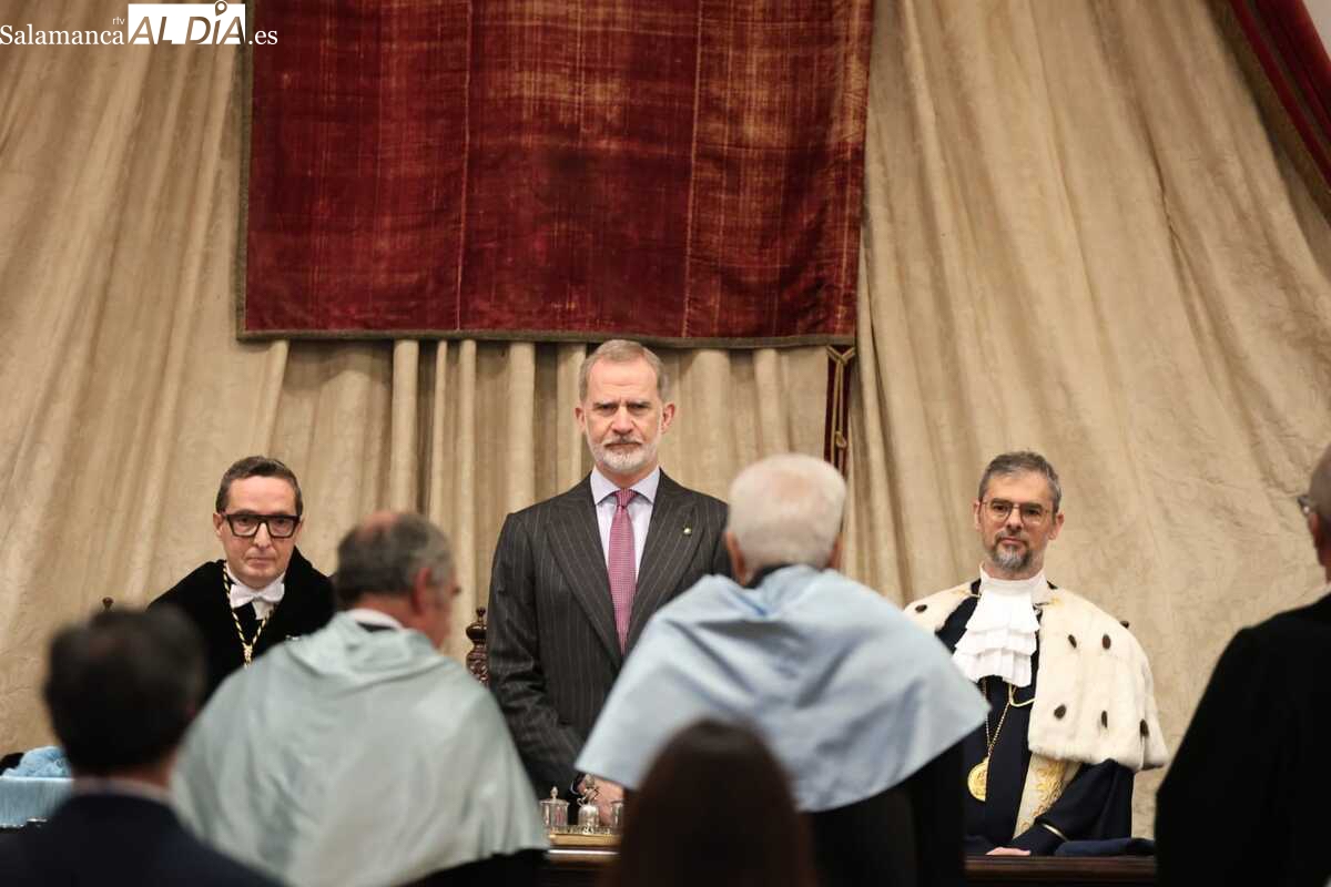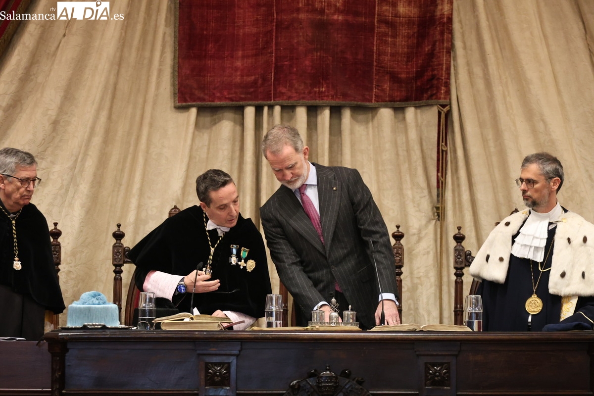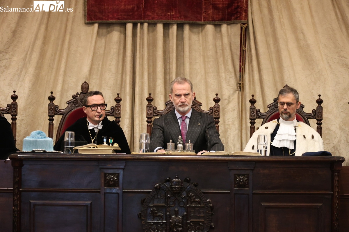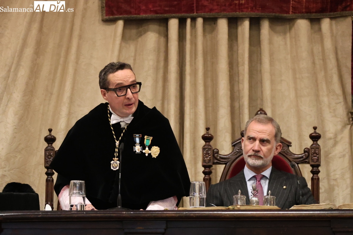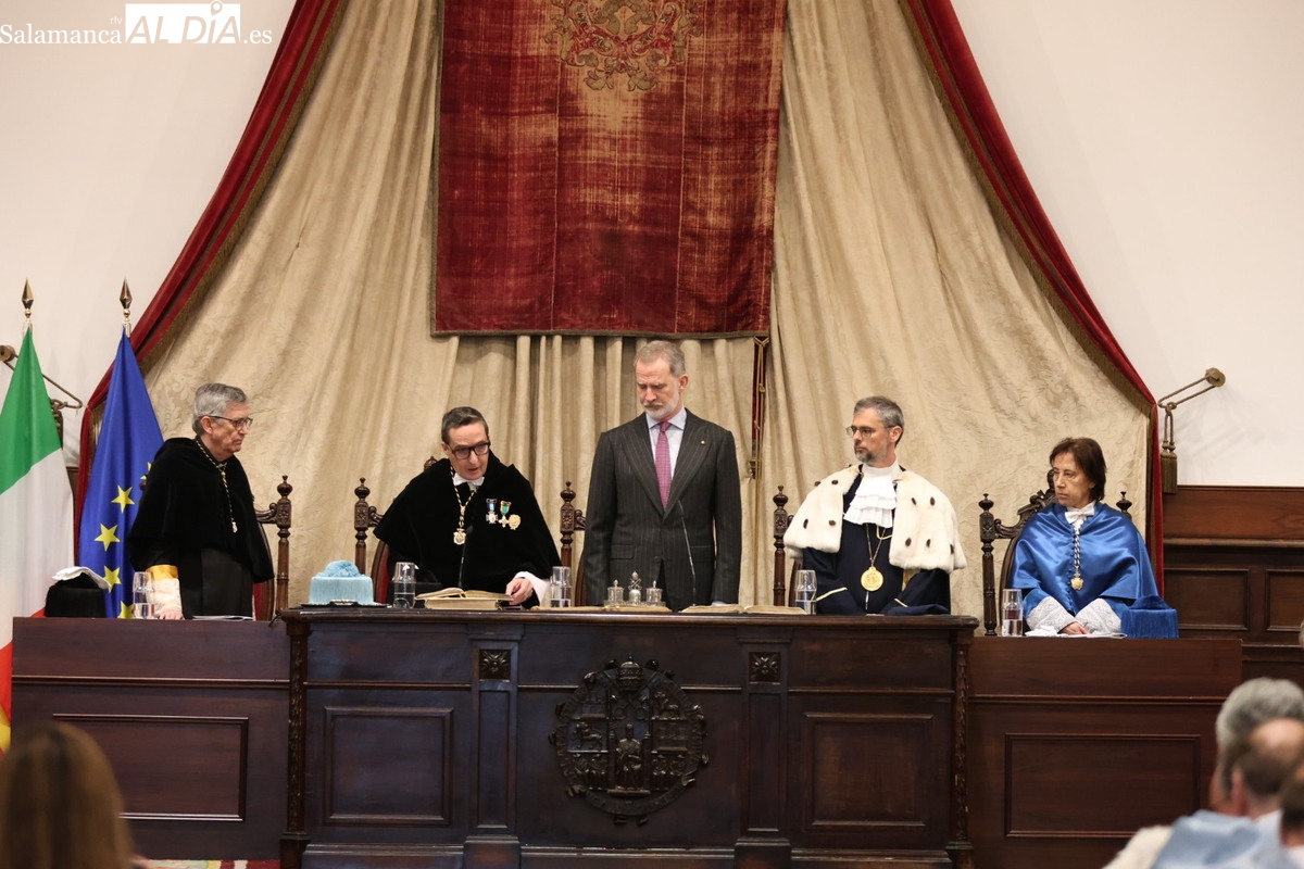 El último en tomar la palabra para cerrar el acto ha sido el rector de la Universidad de Salamanca, Juan Manuel Corchado quien tras agradecer la presencia del rey, ha destacado que “Salamanca es una universidad nacida para prensar por Europa. Aquí se enseñó que el derecho debía poner límites al poder, que la dignidad humana precede a toda autoridad y que la comunidad política solo es legítima cuando reconoce la igualdad moral de todos los seres humanos”.