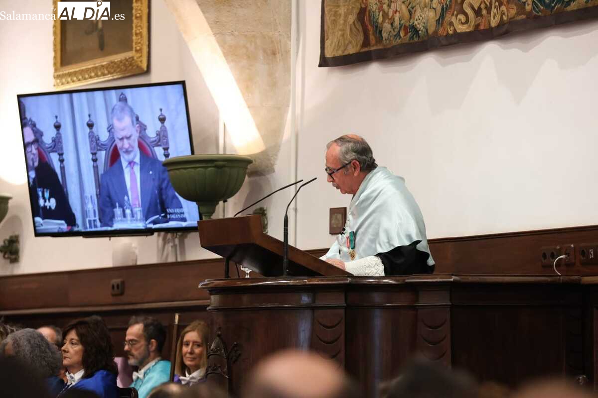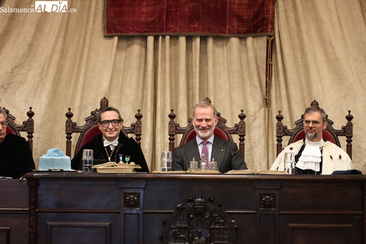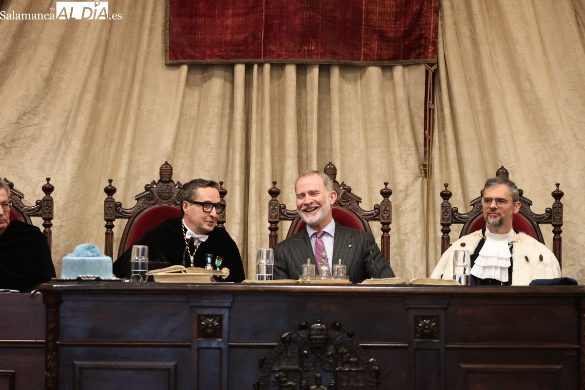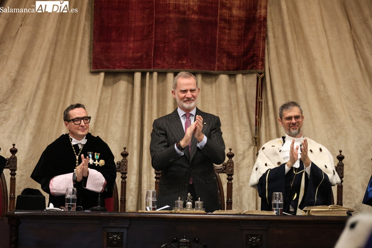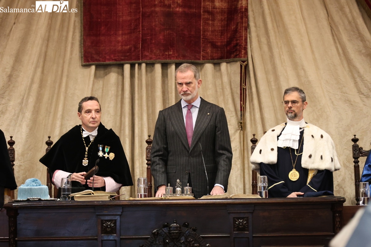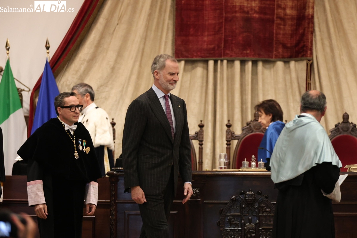 El último en tomar la palabra para cerrar el acto ha sido el rector de la Universidad de Salamanca, Juan Manuel Corchado quien tras agradecer la presencia del rey, ha destacado que “Salamanca es una universidad nacida para prensar por Europa. Aquí se enseñó que el derecho debía poner límites al poder, que la dignidad humana precede a toda autoridad y que la comunidad política solo es legítima cuando reconoce la igualdad moral de todos los seres humanos”.