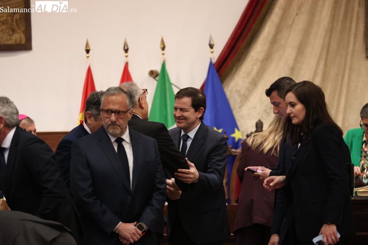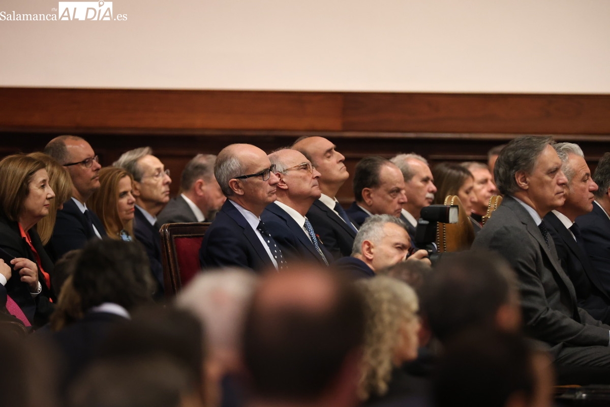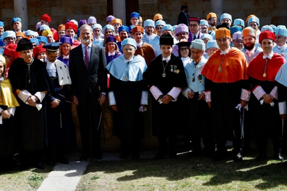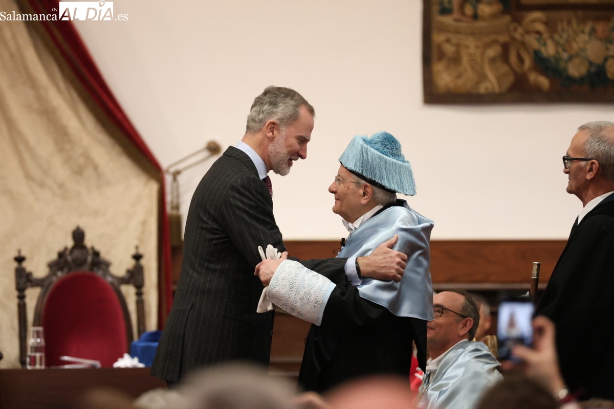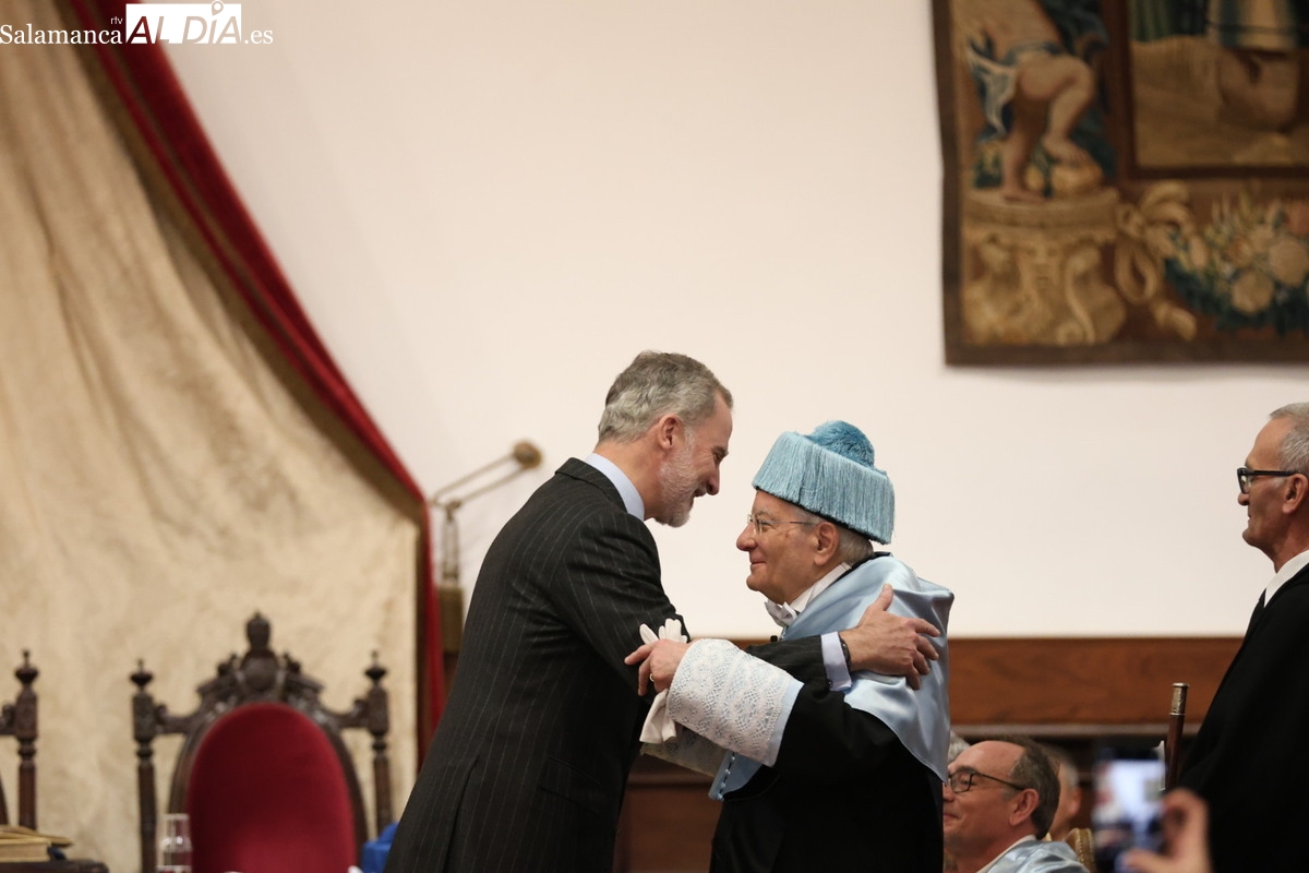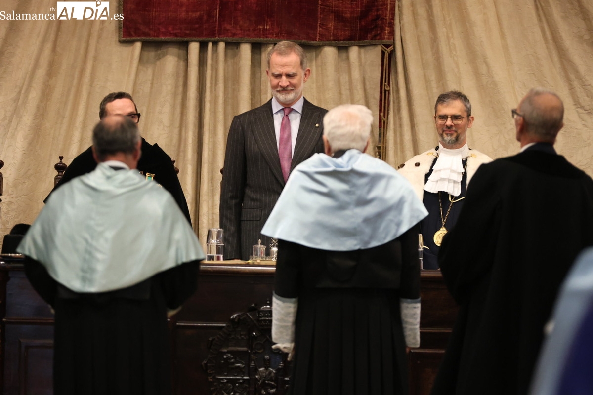 El último en tomar la palabra para cerrar el acto ha sido el rector de la Universidad de Salamanca, Juan Manuel Corchado quien tras agradecer la presencia del rey, ha destacado que “Salamanca es una universidad nacida para prensar por Europa. Aquí se enseñó que el derecho debía poner límites al poder, que la dignidad humana precede a toda autoridad y que la comunidad política solo es legítima cuando reconoce la igualdad moral de todos los seres humanos”.