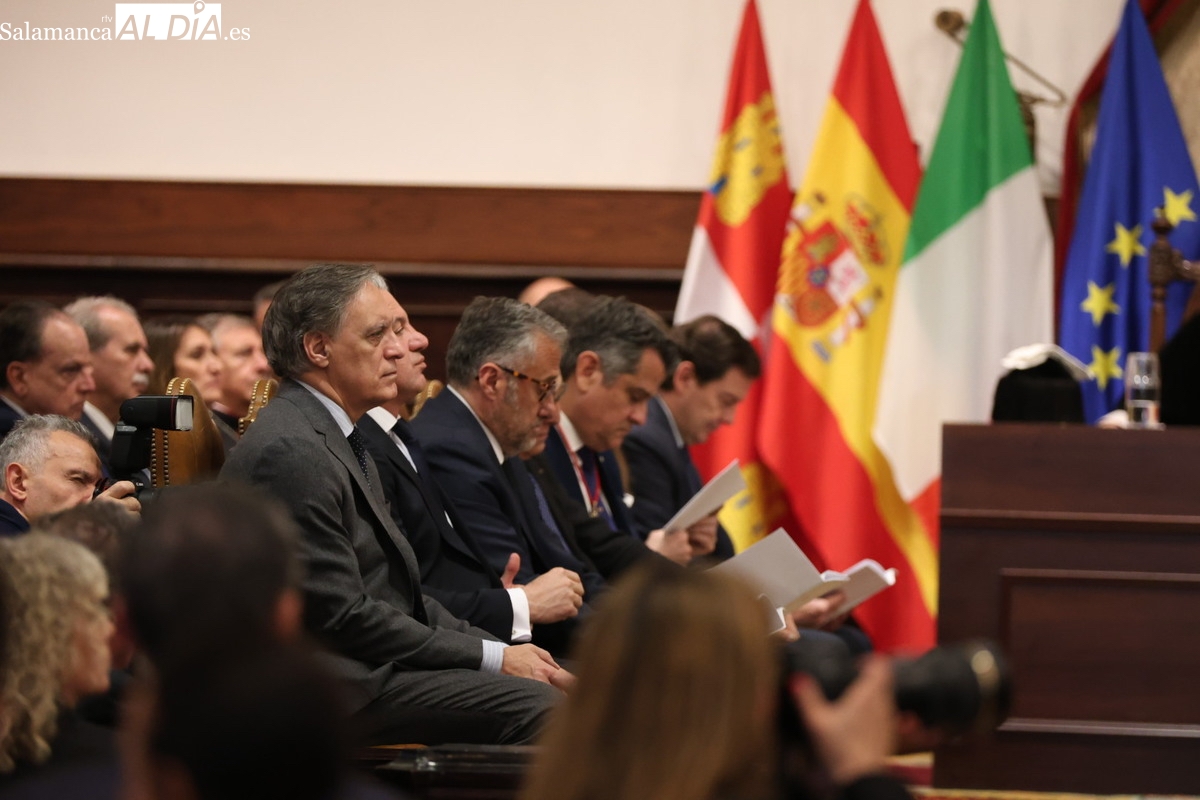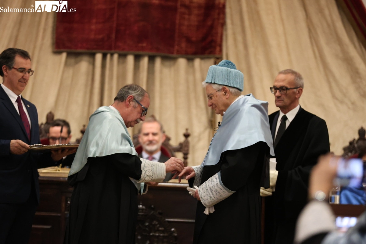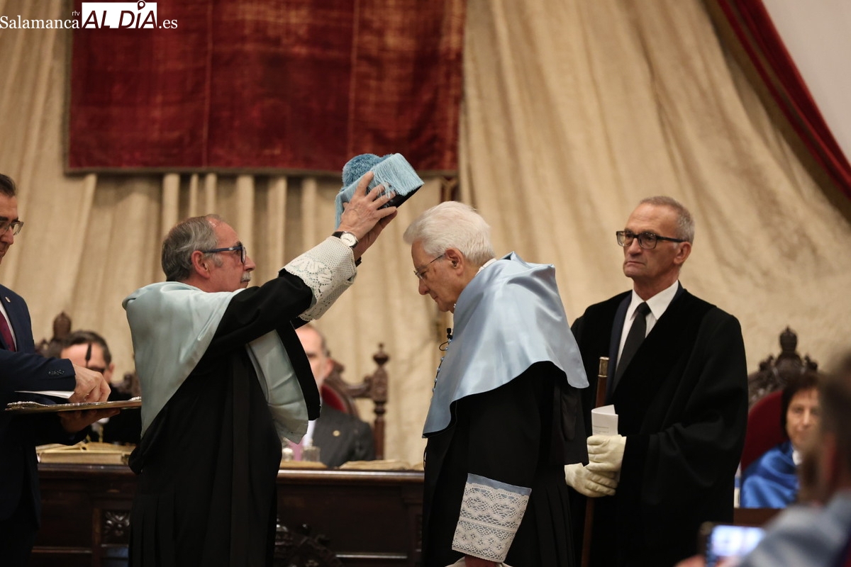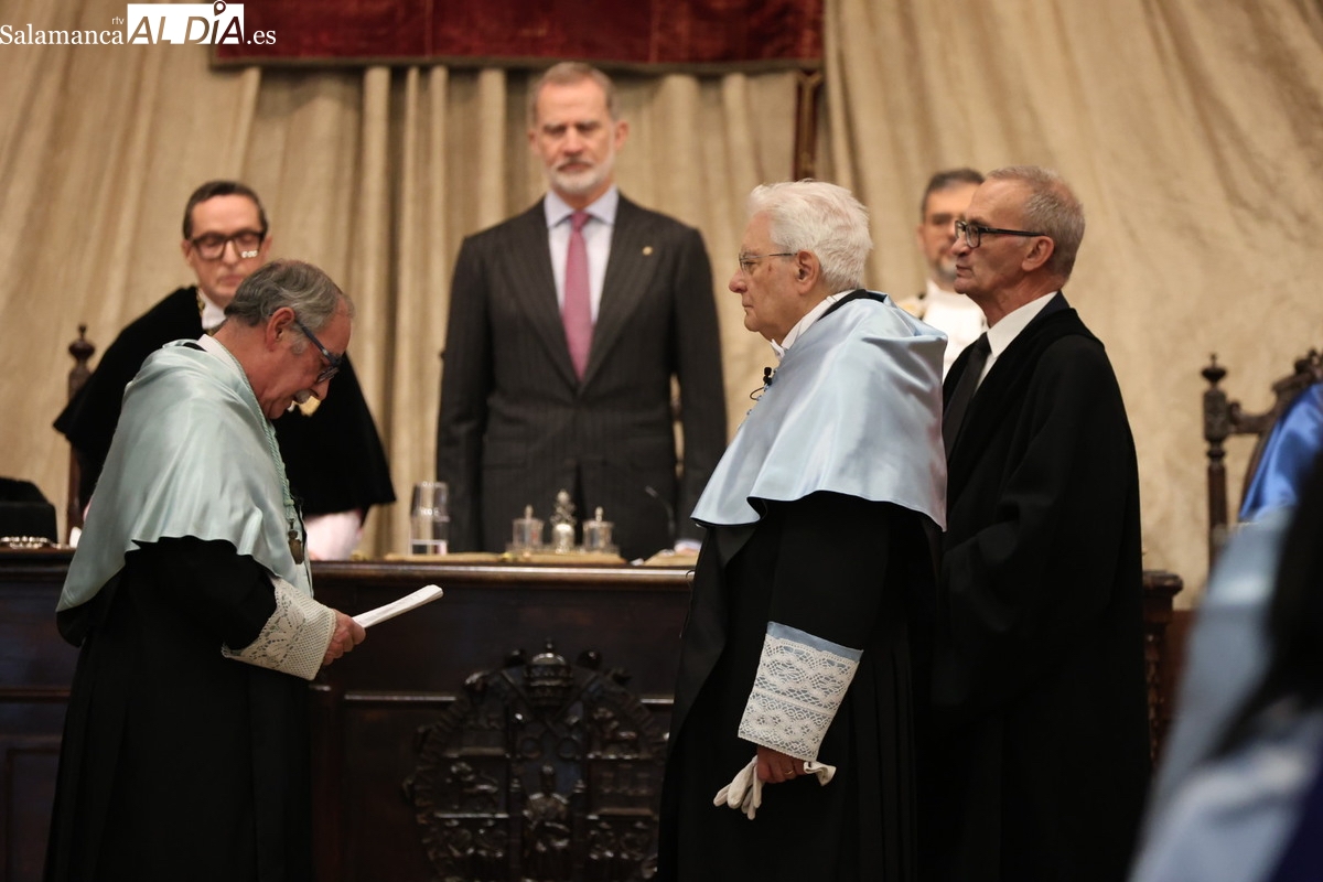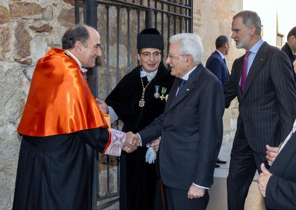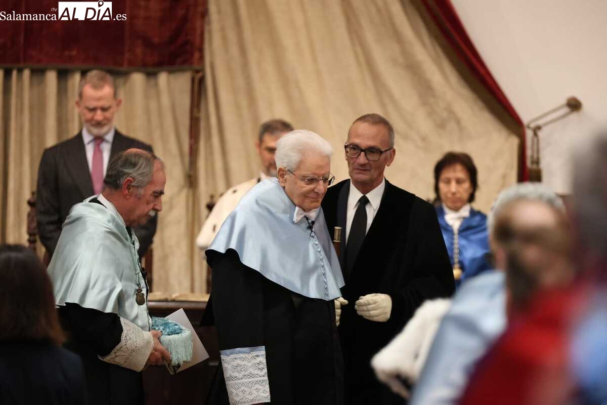 La Universidad de Salamanca ha nombrado doctor Honoris Causa a Sergio Mattarella, presidente de la República Italiana. La ceremonia se ha celebrado en el Paraninfo de las Escuelas Mayores, en un acto que ha contado con la presencia de su Majestad el rey Felipe VI, quien ha sido el encargado de dar comienzo al acto con unas palabras en italiano. Momentos antes del acto, ambos diligentes han paseado por el centro de la ciudad.
