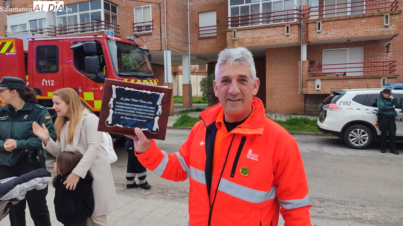 Aunque acostumbrado a las emociones fuertes en su trabajo, en esta ocasión la emoción ha desbordado al veterano conductor de ambulancias y bombero de Vitgiudino, que no ha podido evitar secarse las lágrimas al contemplar a la multitud de compañeros congregados a las puertas del Centro de Salud. En el patio de entrada le aguardaba no solo su familia profesional, sino también la personal, dispuesta a devolverle una pequeña parte de la entrega que él ha demostrado durante casi cuatro décadas salvando vidas.