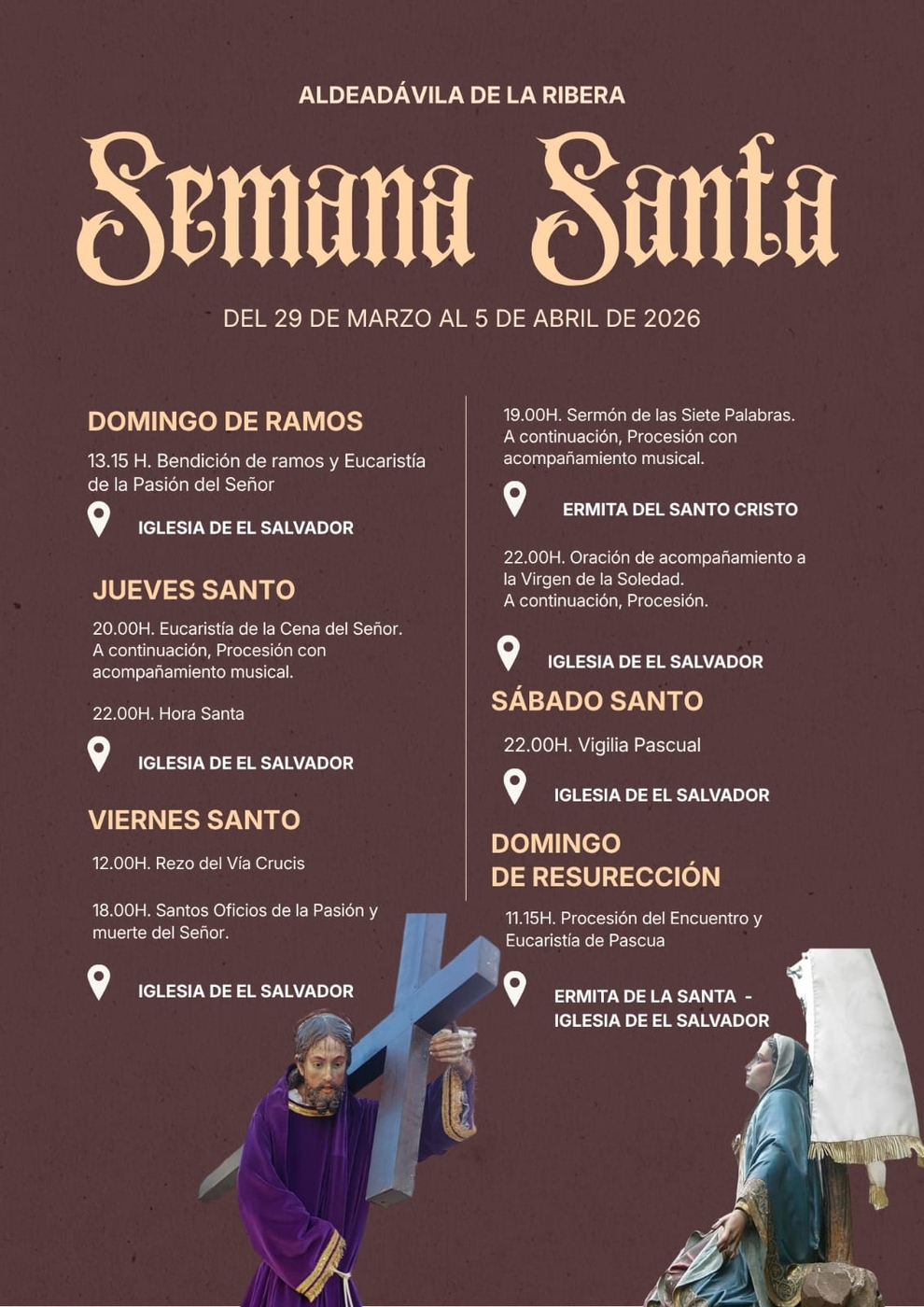 La localidad de Aldeadávila de la Ribera ultima los preparativos para la celebración de su Semana Santa, que se desarrollará entre el 29 de marzo y el 5 de abril de 2026. La programación de este año incorpora destacadas novedades en sus desfiles procesionales, como la ampliación del acompañamiento musical y el estreno de unas nuevas andas con ruedas para la Virgen de la Soledad.