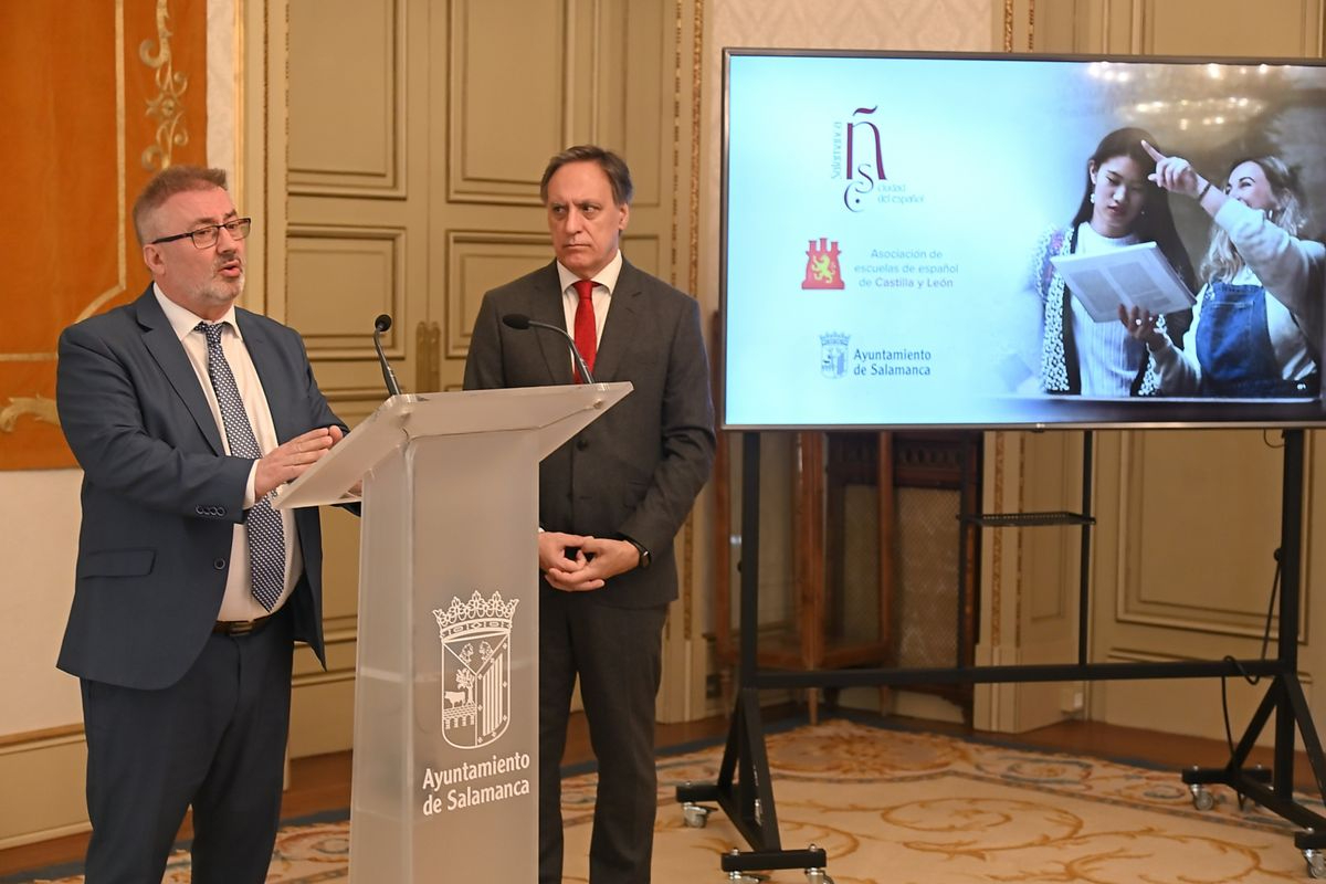 El alcalde de la ciudad, Carlos García Carbayo, y el presidente de la Asociación de Escuelas de Español de Castilla y León (AEECyL), Miguel Ángel Benito, han rubricado este lunes el documento. Durante la presentación, el regidor municipal ha destacado que la enseñanza de este idioma "forma parte de la identidad, de la proyección internacional y de la economía de Salamanca".