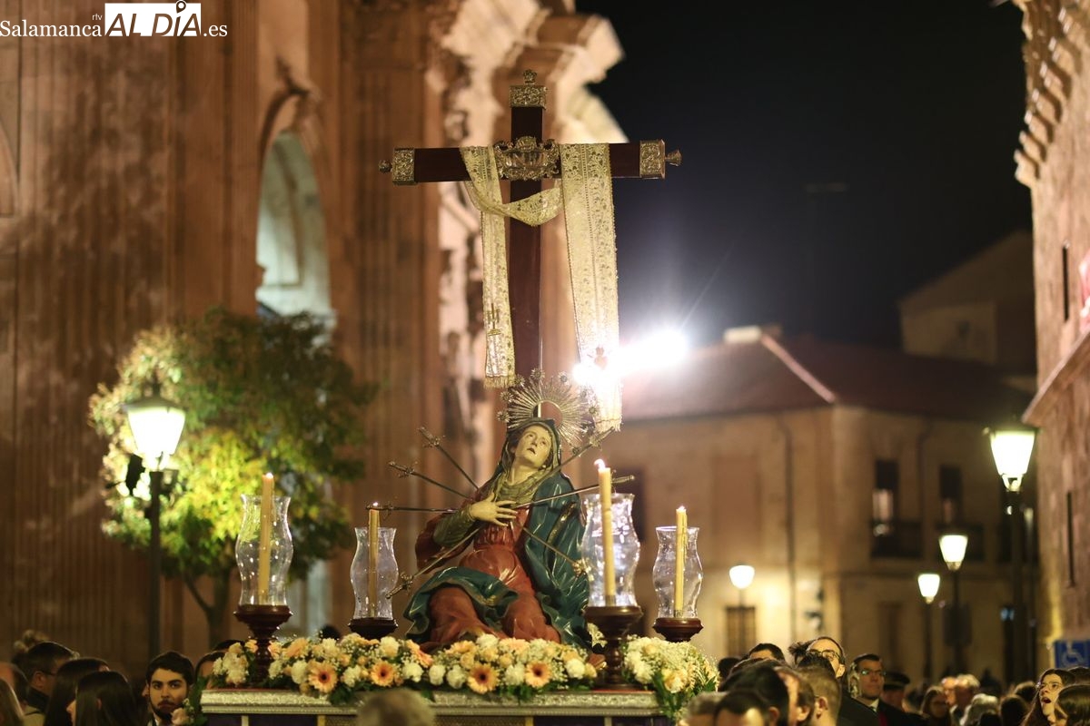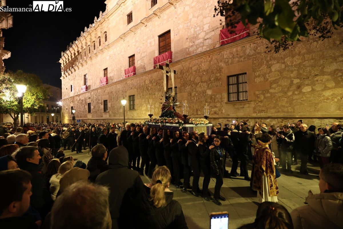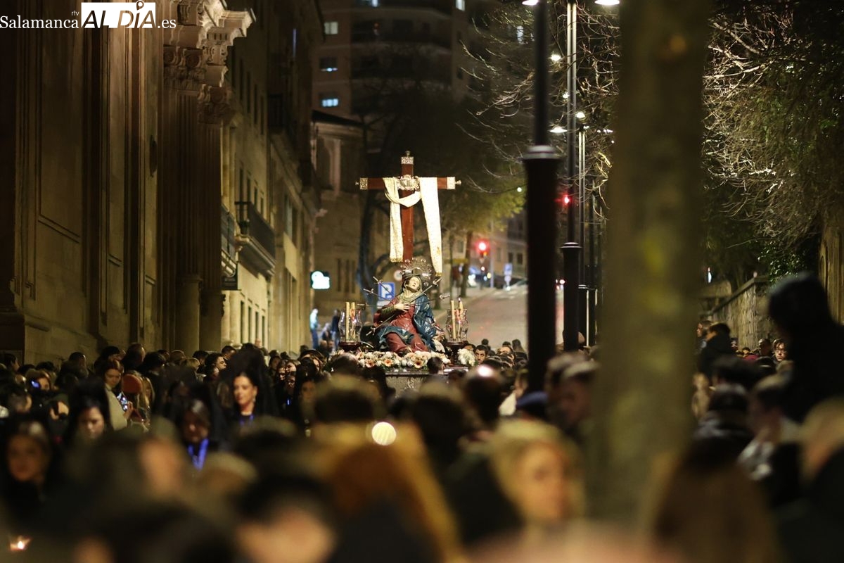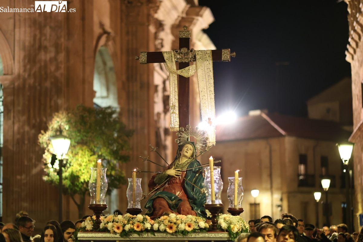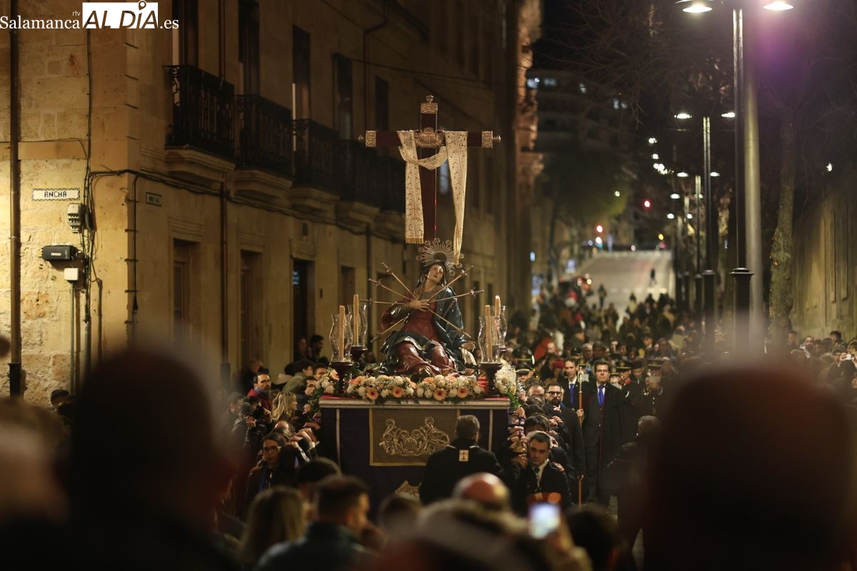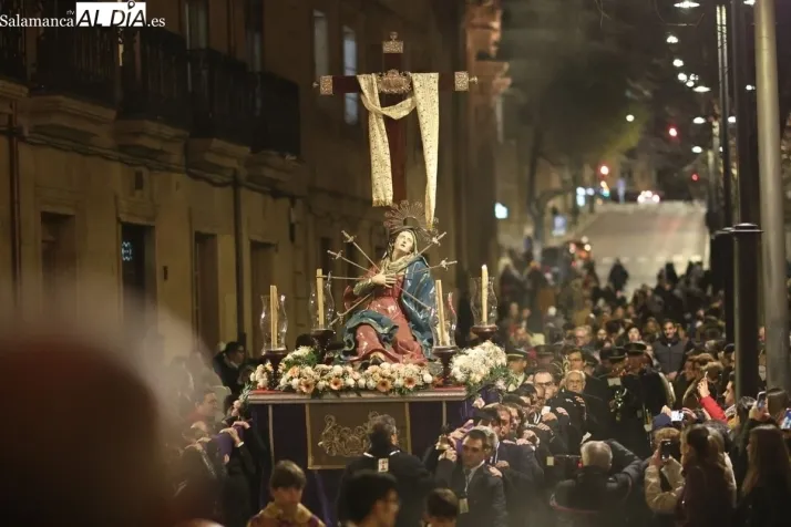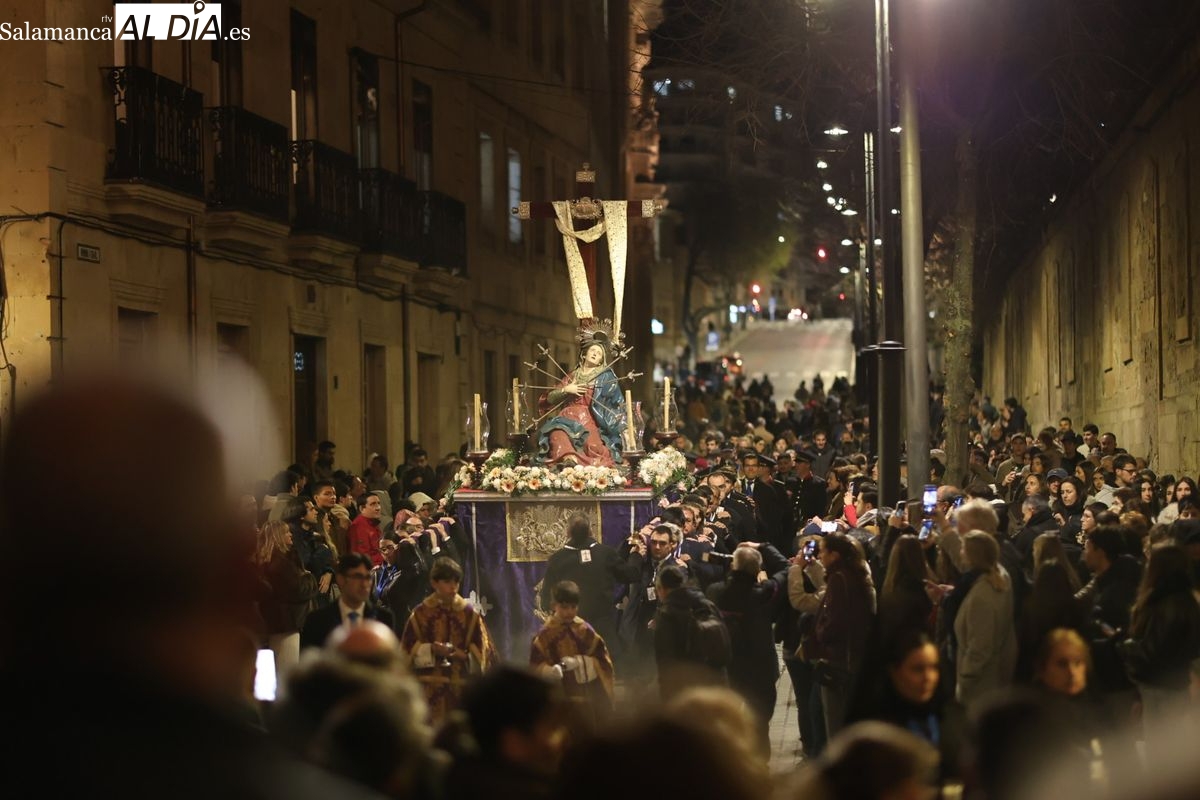 La Ilustre Cofradía de la Santa Vera Cruz ha inaugurado este viernes los desfiles penitenciales en Salamanca con la tradicional procesión del Vía Matris. La imagen de la Santísima Virgen de los Dolores ha podido reencontrarse con los fieles en las calles, tras no poder salir el año pasado a causa de las precipitaciones.