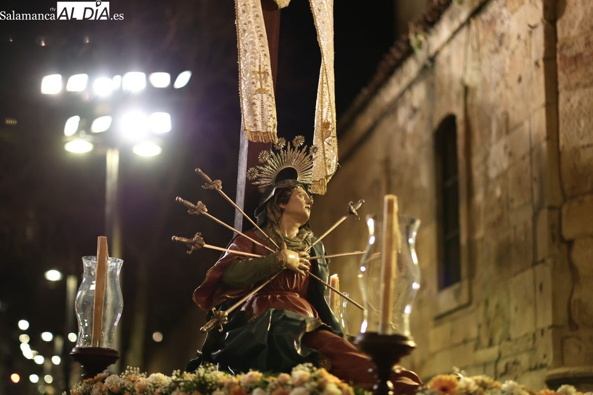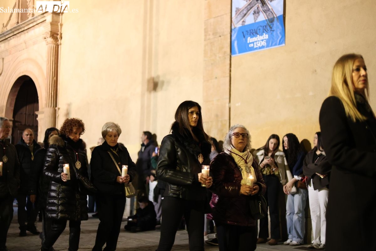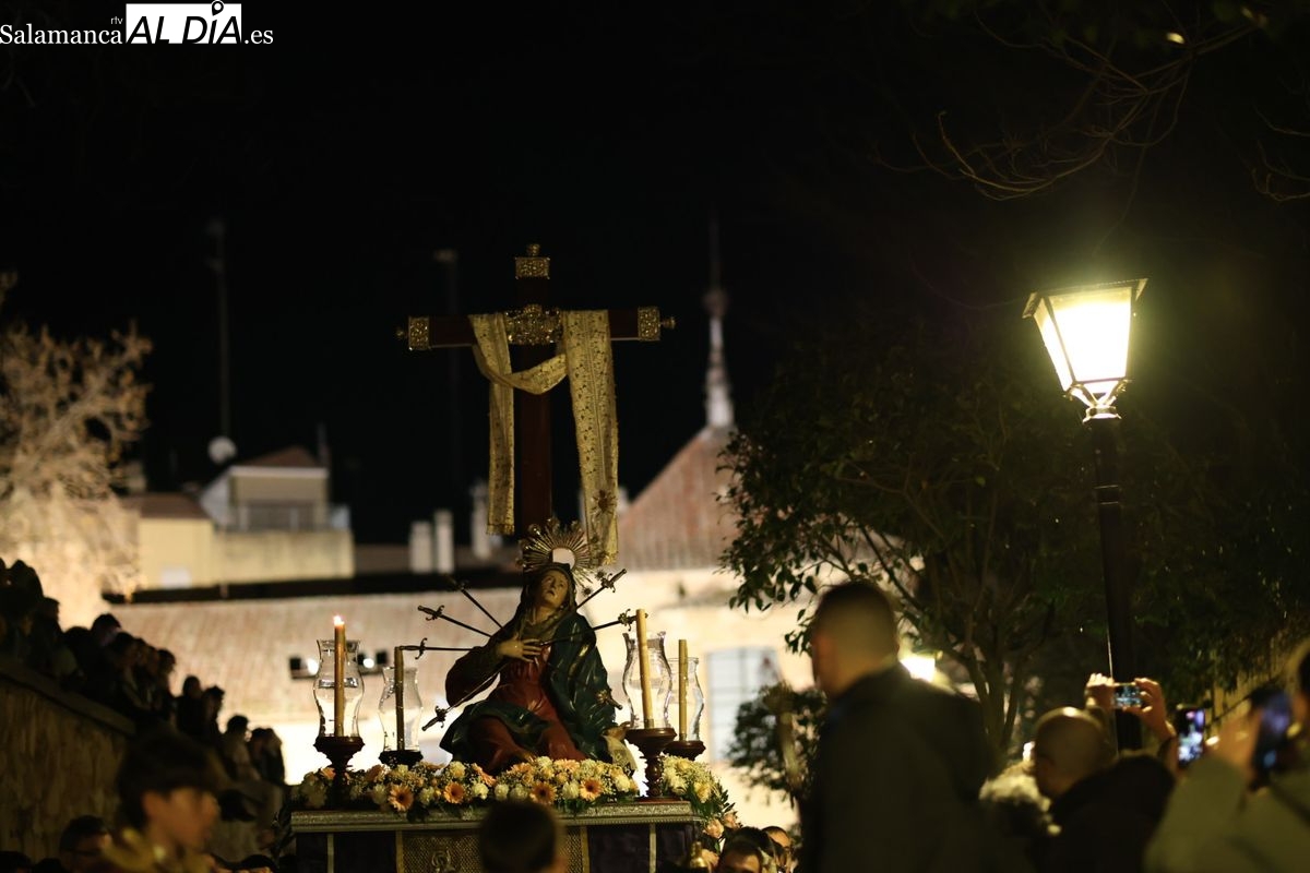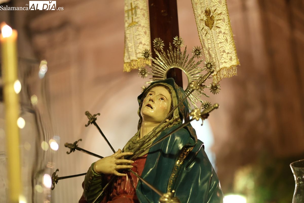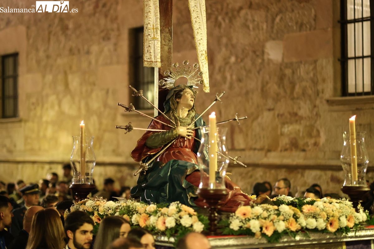 La Ilustre Cofradía de la Santa Vera Cruz ha inaugurado este viernes los desfiles penitenciales en Salamanca con la tradicional procesión del Vía Matris. La imagen de la Santísima Virgen de los Dolores ha podido reencontrarse con los fieles en las calles, tras no poder salir el año pasado a causa de las precipitaciones.