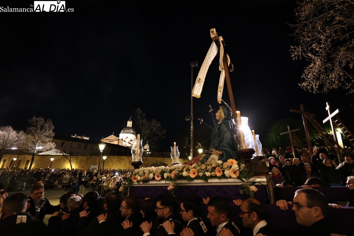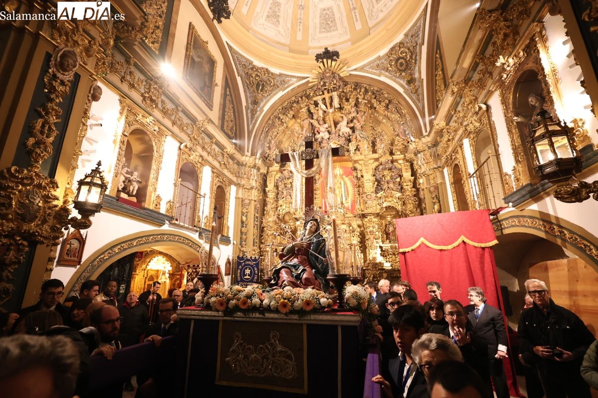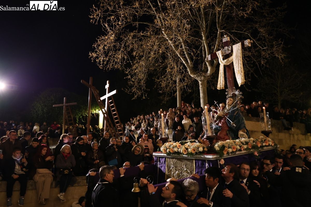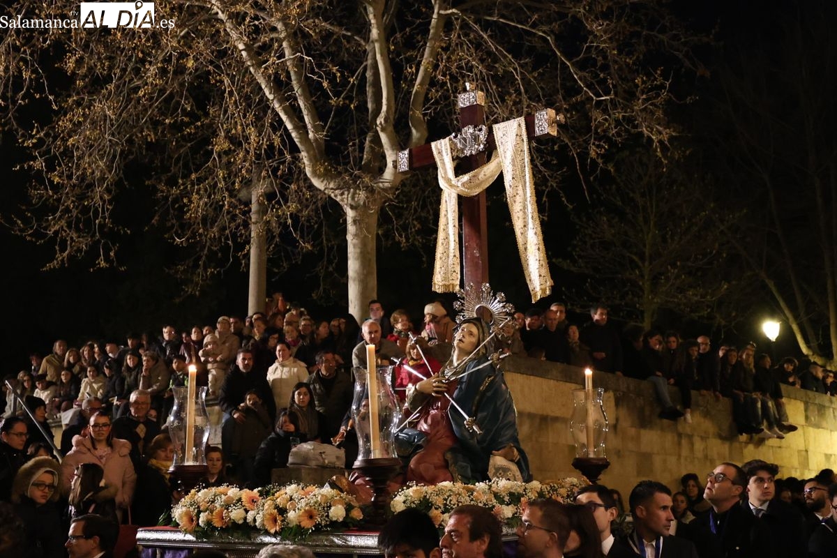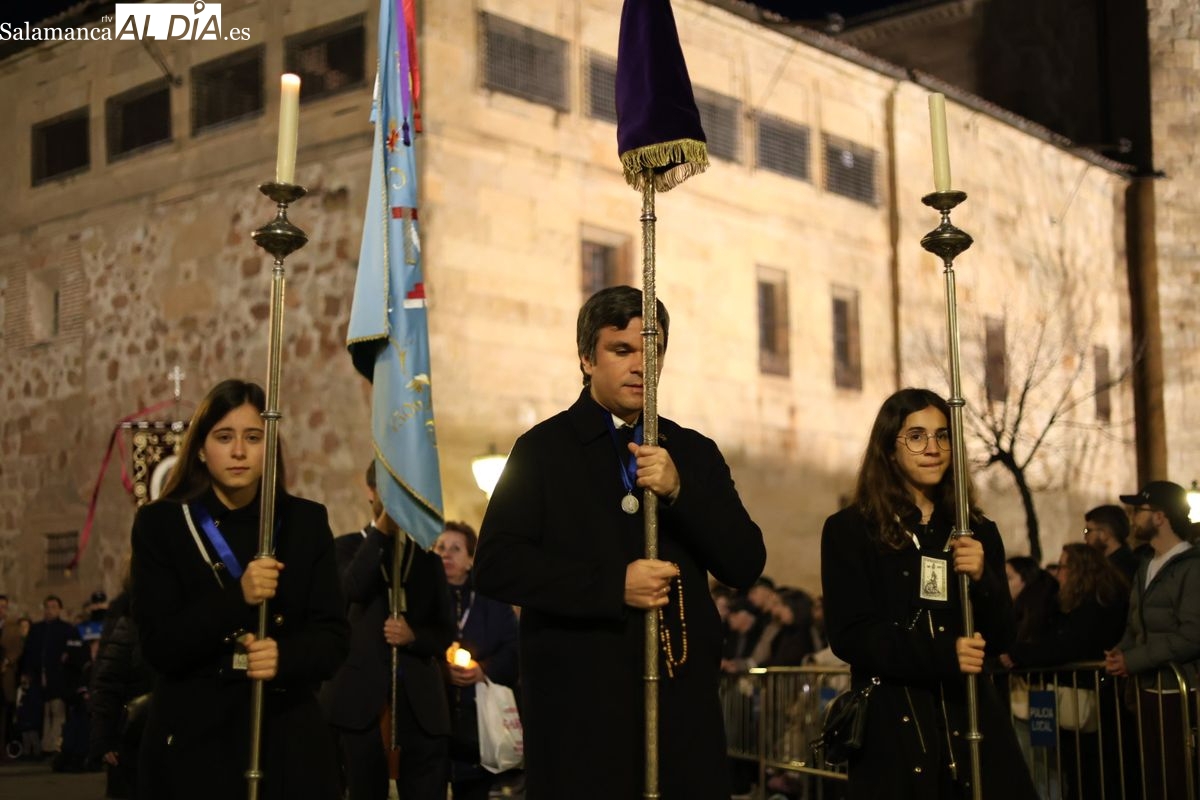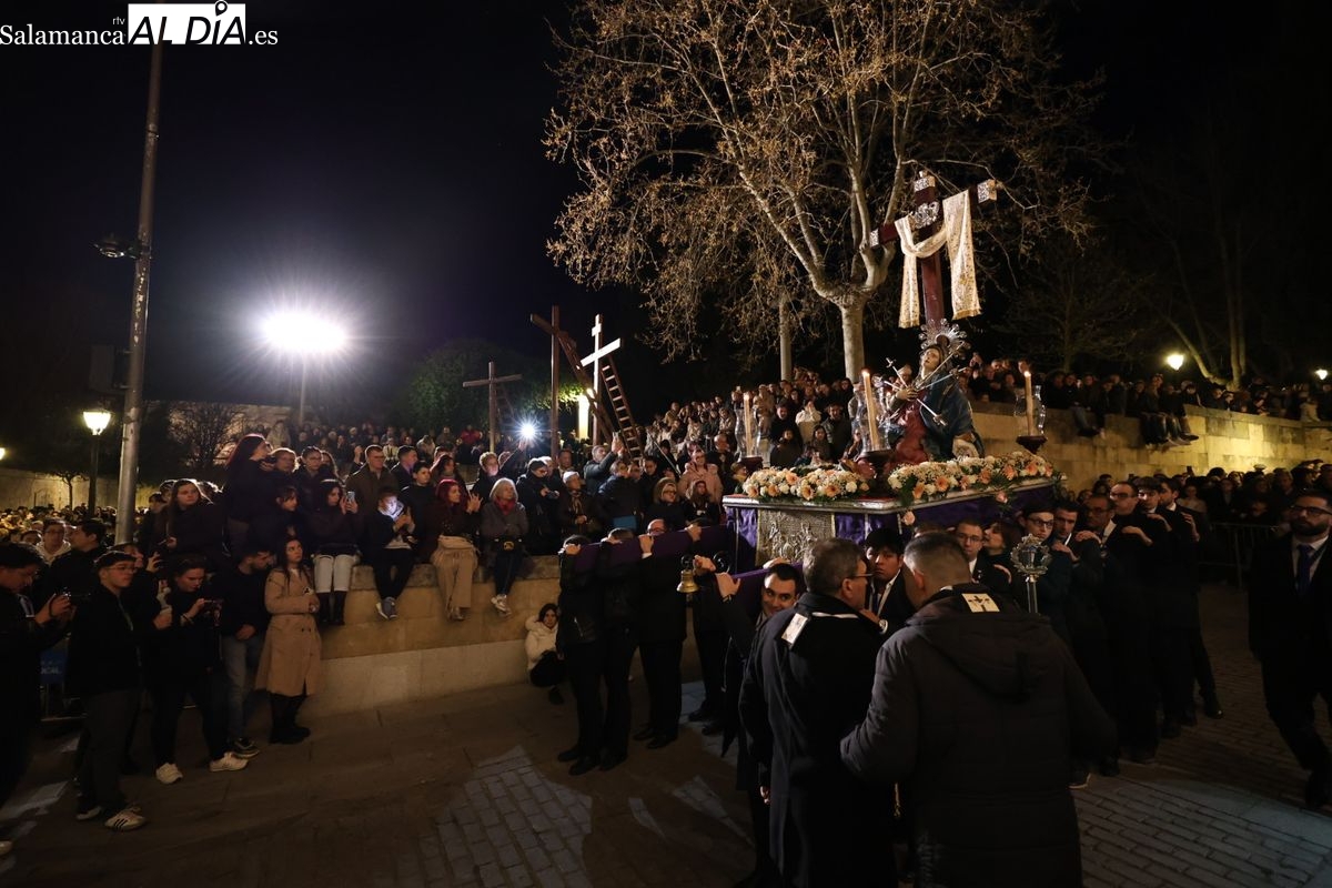 La Ilustre Cofradía de la Santa Vera Cruz ha inaugurado este viernes los desfiles penitenciales en Salamanca con la tradicional procesión del Vía Matris. La imagen de la Santísima Virgen de los Dolores ha podido reencontrarse con los fieles en las calles, tras no poder salir el año pasado a causa de las precipitaciones.