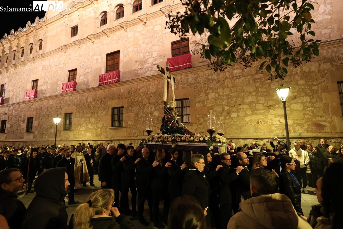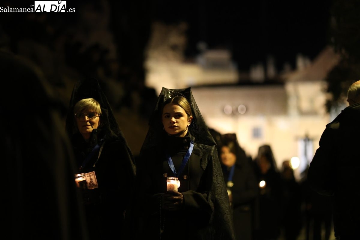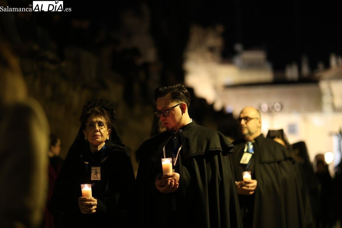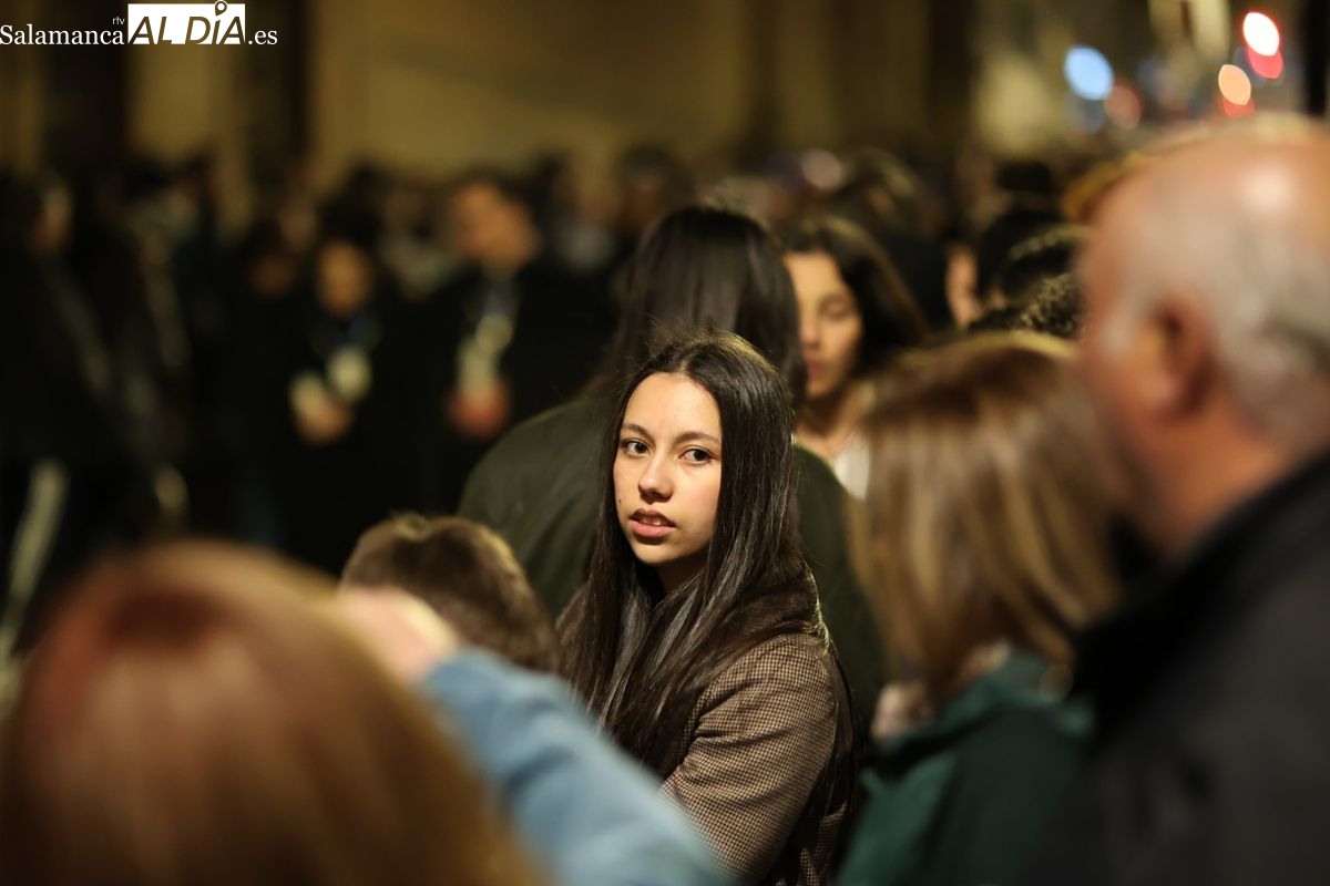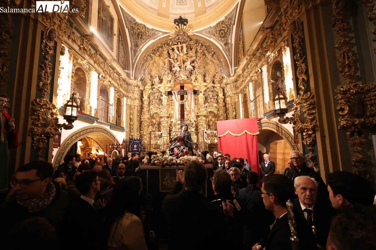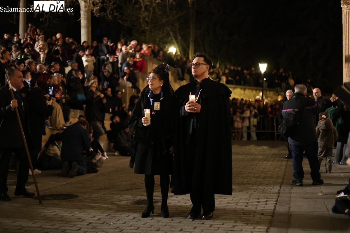 La Ilustre Cofradía de la Santa Vera Cruz ha inaugurado este viernes los desfiles penitenciales en Salamanca con la tradicional procesión del Vía Matris. La imagen de la Santísima Virgen de los Dolores ha podido reencontrarse con los fieles en las calles, tras no poder salir el año pasado a causa de las precipitaciones.