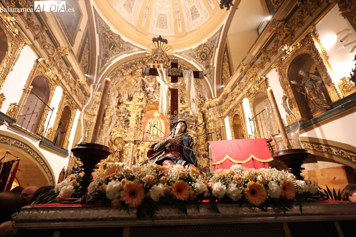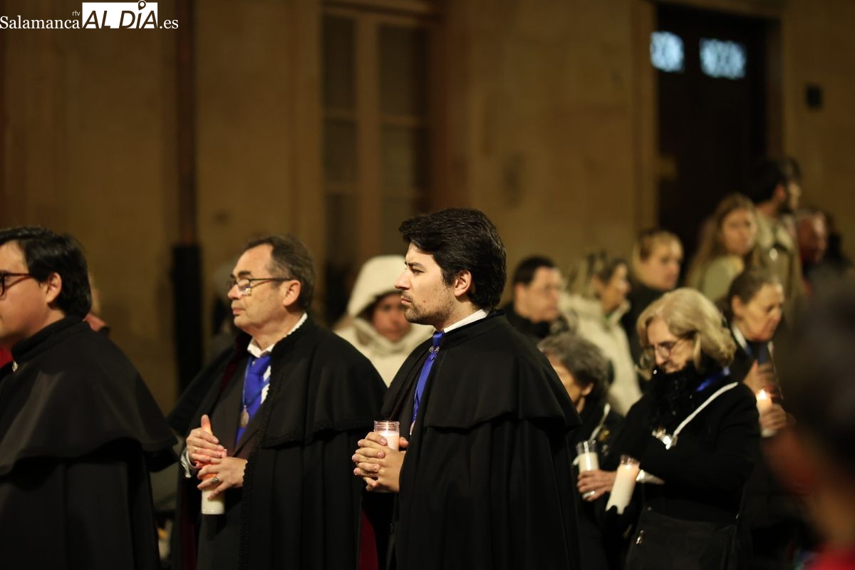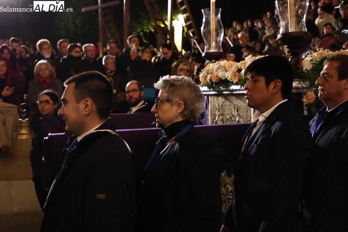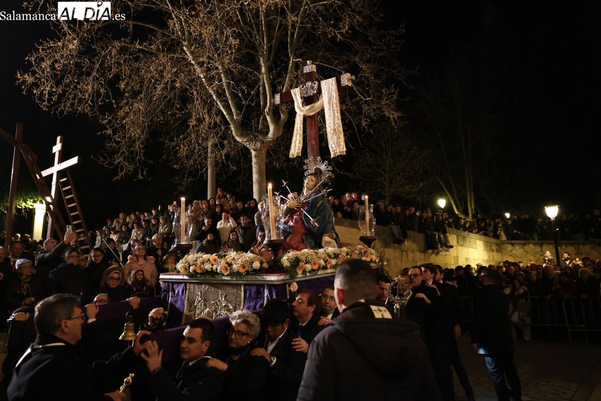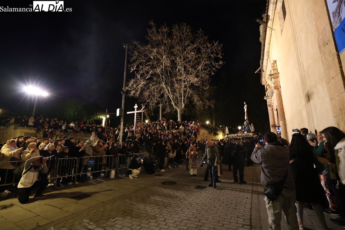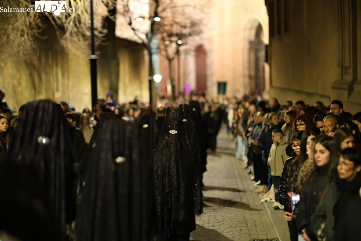 La Ilustre Cofradía de la Santa Vera Cruz ha inaugurado este viernes los desfiles penitenciales en Salamanca con la tradicional procesión del Vía Matris. La imagen de la Santísima Virgen de los Dolores ha podido reencontrarse con los fieles en las calles, tras no poder salir el año pasado a causa de las precipitaciones.