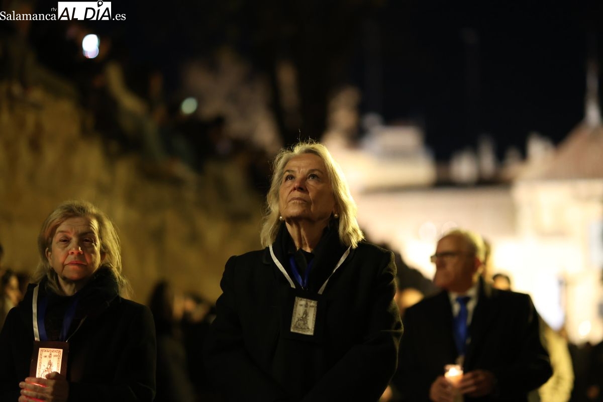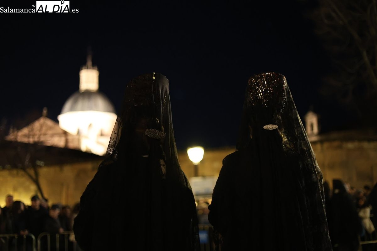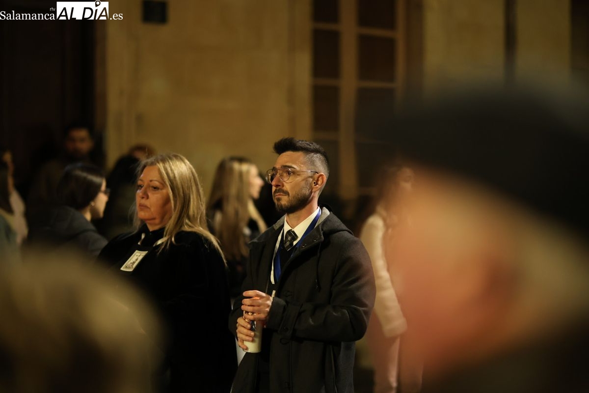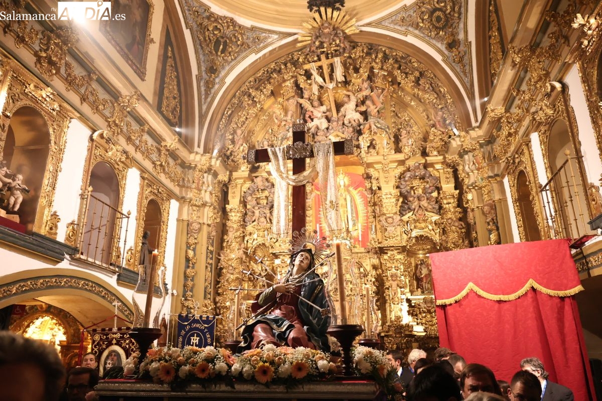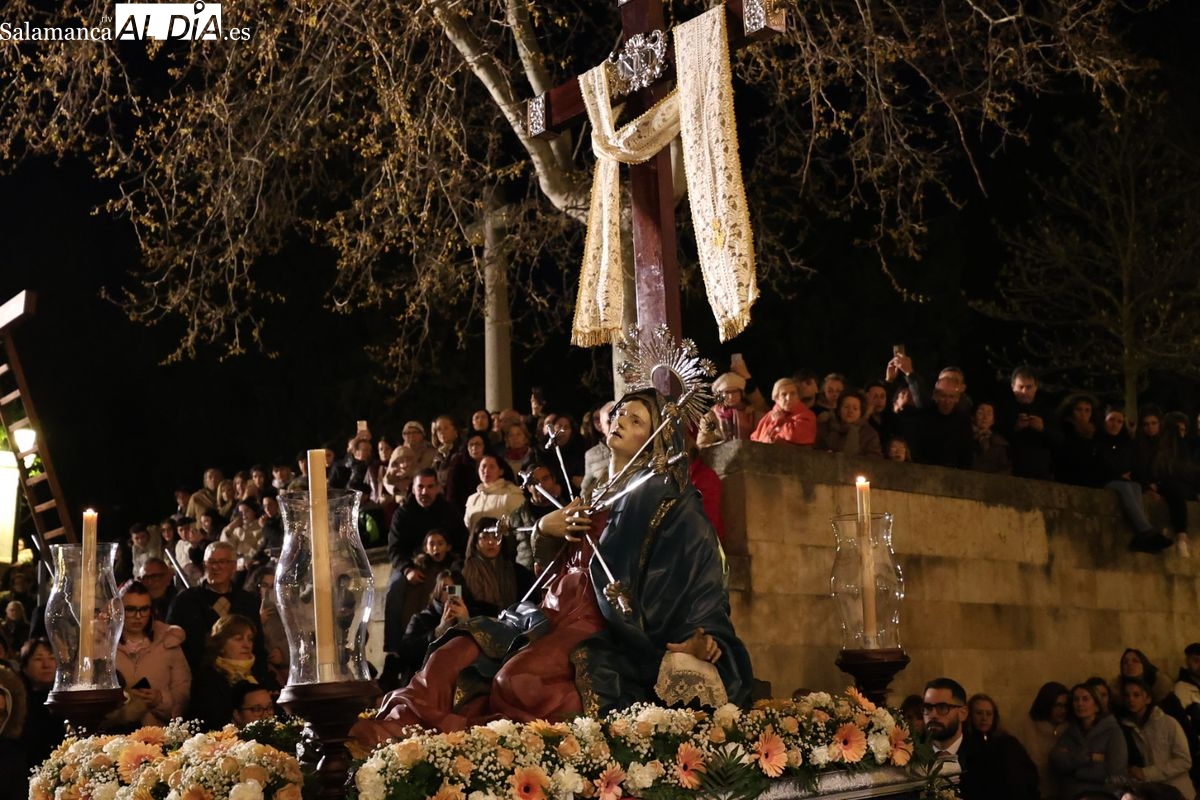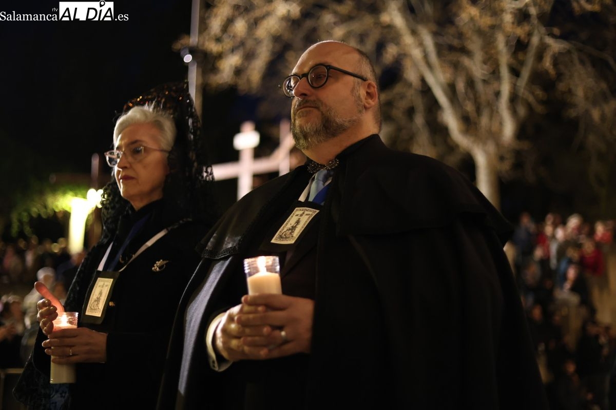 La Ilustre Cofradía de la Santa Vera Cruz ha inaugurado este viernes los desfiles penitenciales en Salamanca con la tradicional procesión del Vía Matris. La imagen de la Santísima Virgen de los Dolores ha podido reencontrarse con los fieles en las calles, tras no poder salir el año pasado a causa de las precipitaciones.