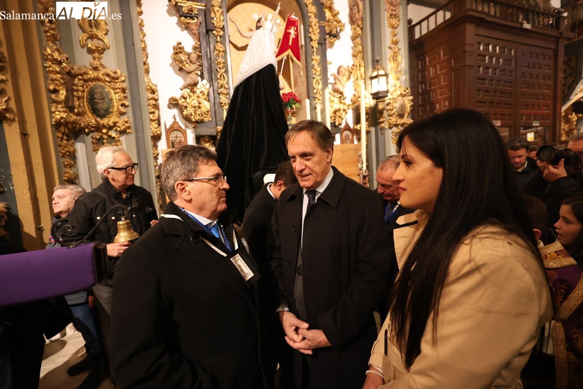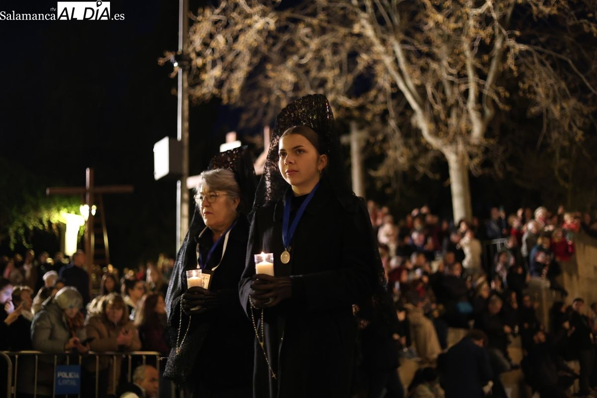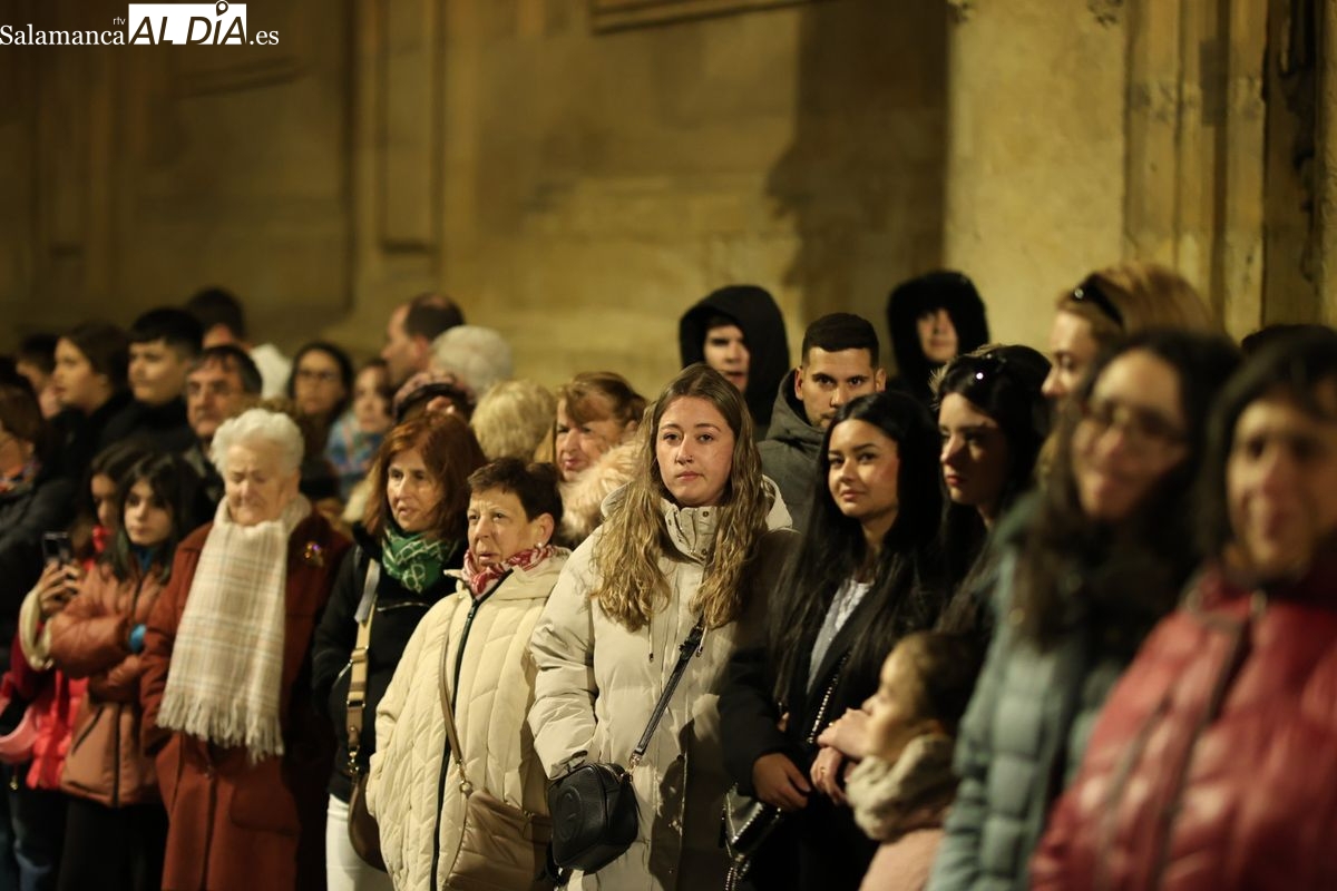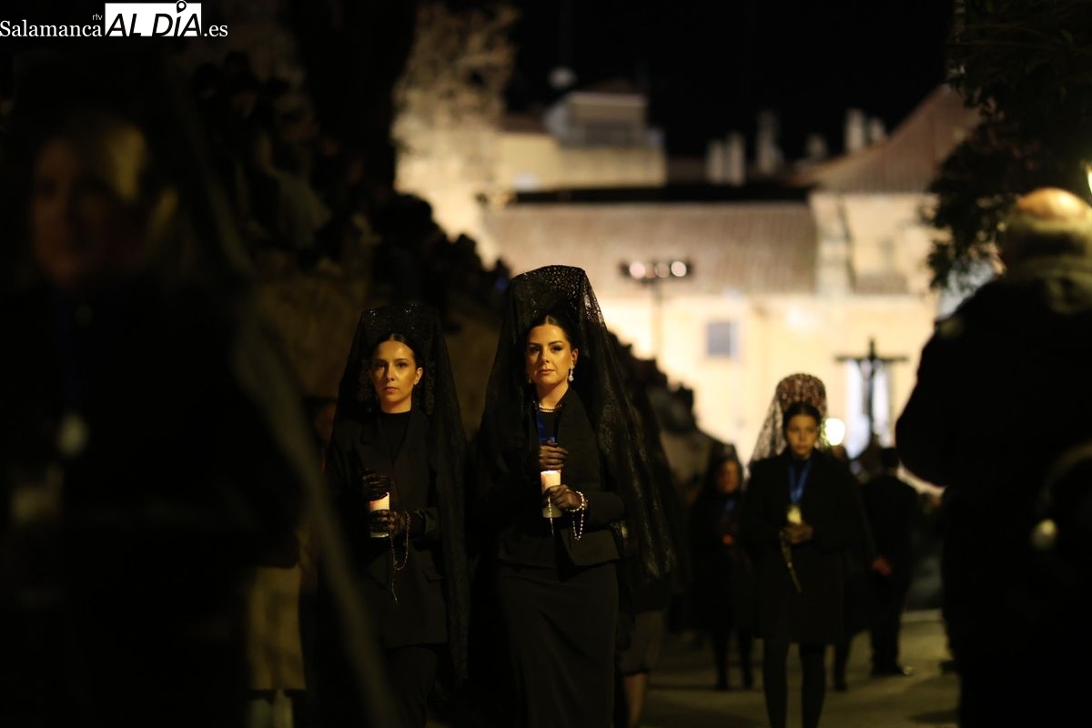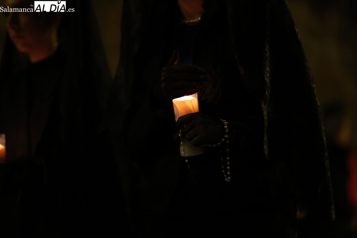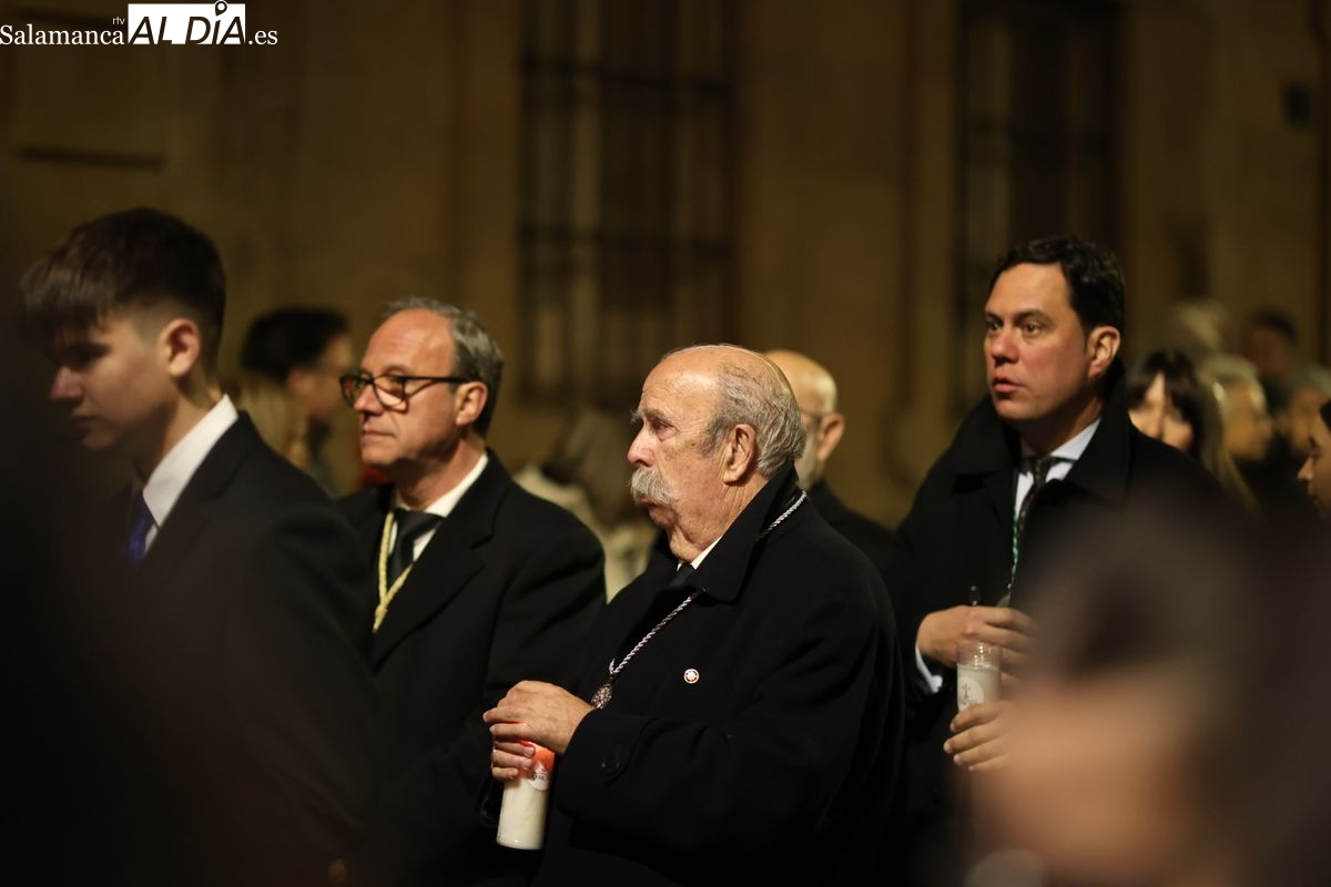 La Ilustre Cofradía de la Santa Vera Cruz ha inaugurado este viernes los desfiles penitenciales en Salamanca con la tradicional procesión del Vía Matris. La imagen de la Santísima Virgen de los Dolores ha podido reencontrarse con los fieles en las calles, tras no poder salir el año pasado a causa de las precipitaciones.