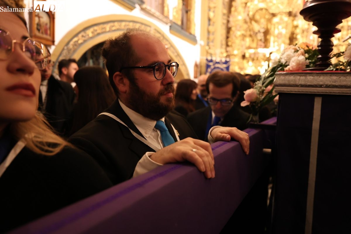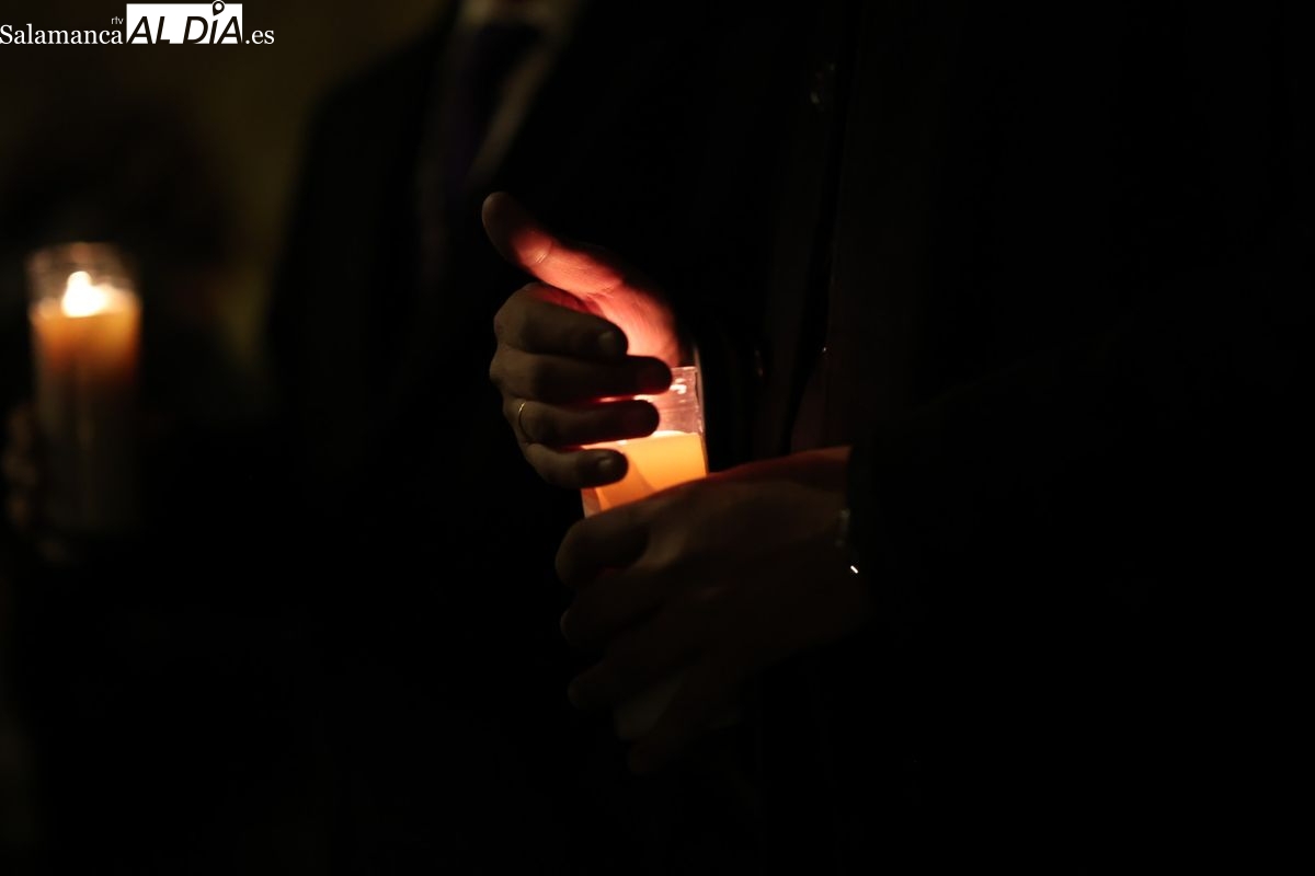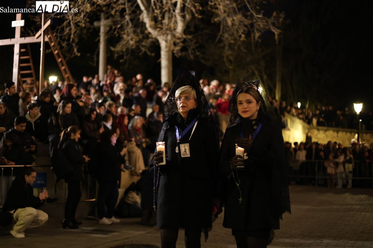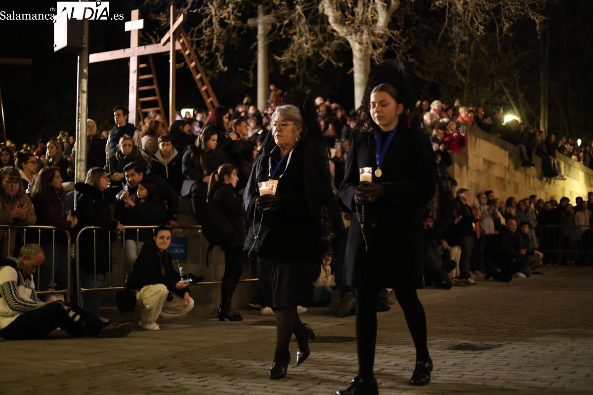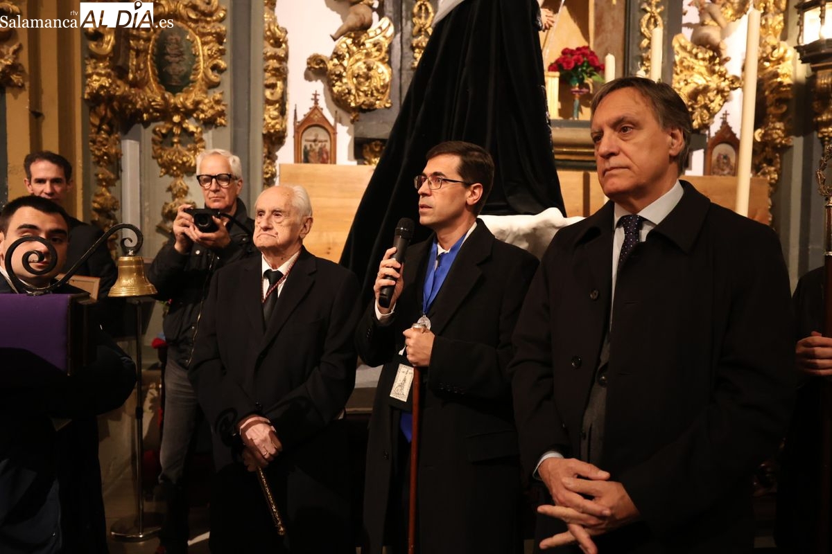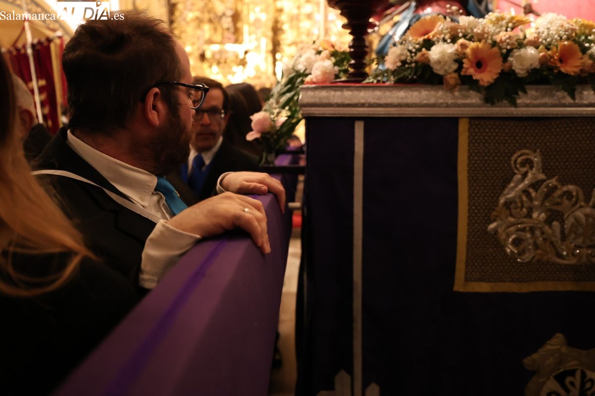 La Ilustre Cofradía de la Santa Vera Cruz ha inaugurado este viernes los desfiles penitenciales en Salamanca con la tradicional procesión del Vía Matris. La imagen de la Santísima Virgen de los Dolores ha podido reencontrarse con los fieles en las calles, tras no poder salir el año pasado a causa de las precipitaciones.