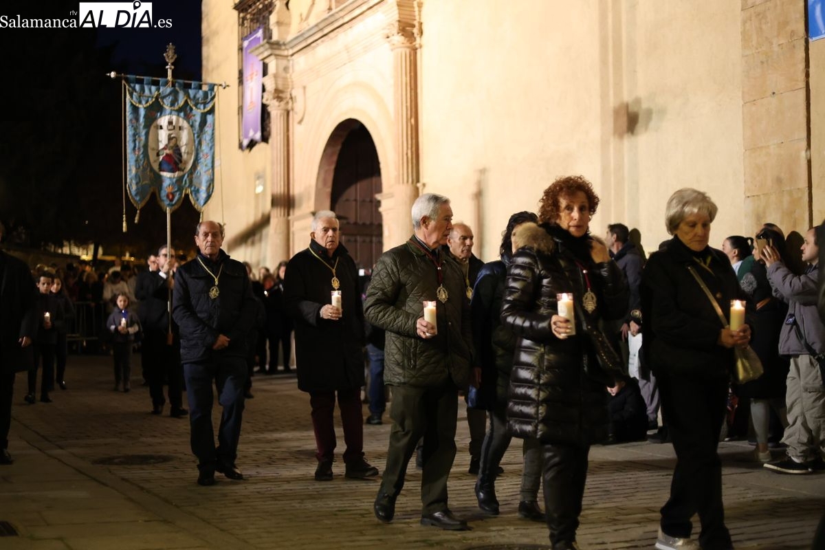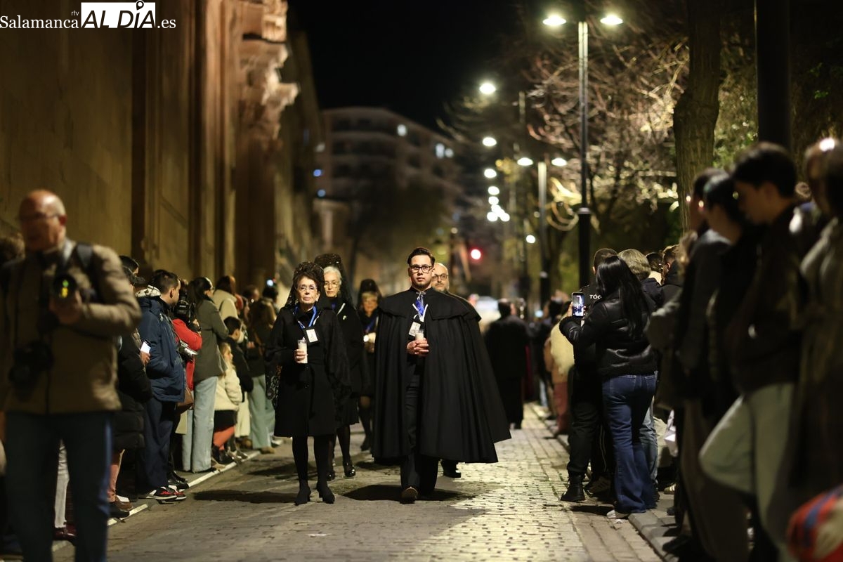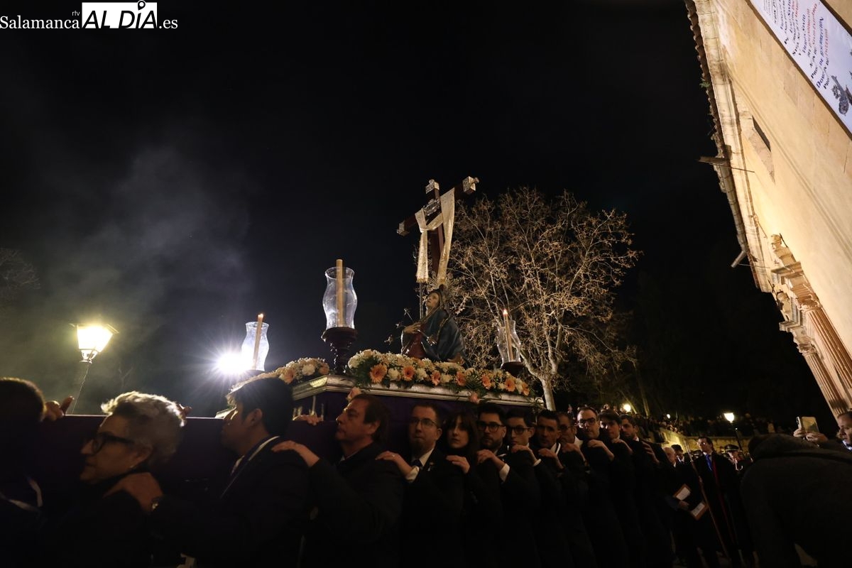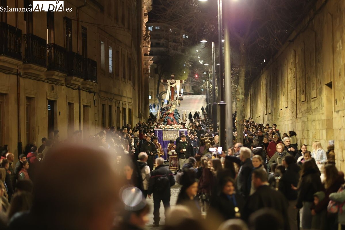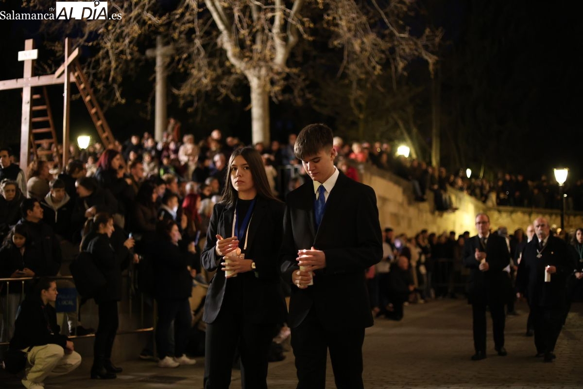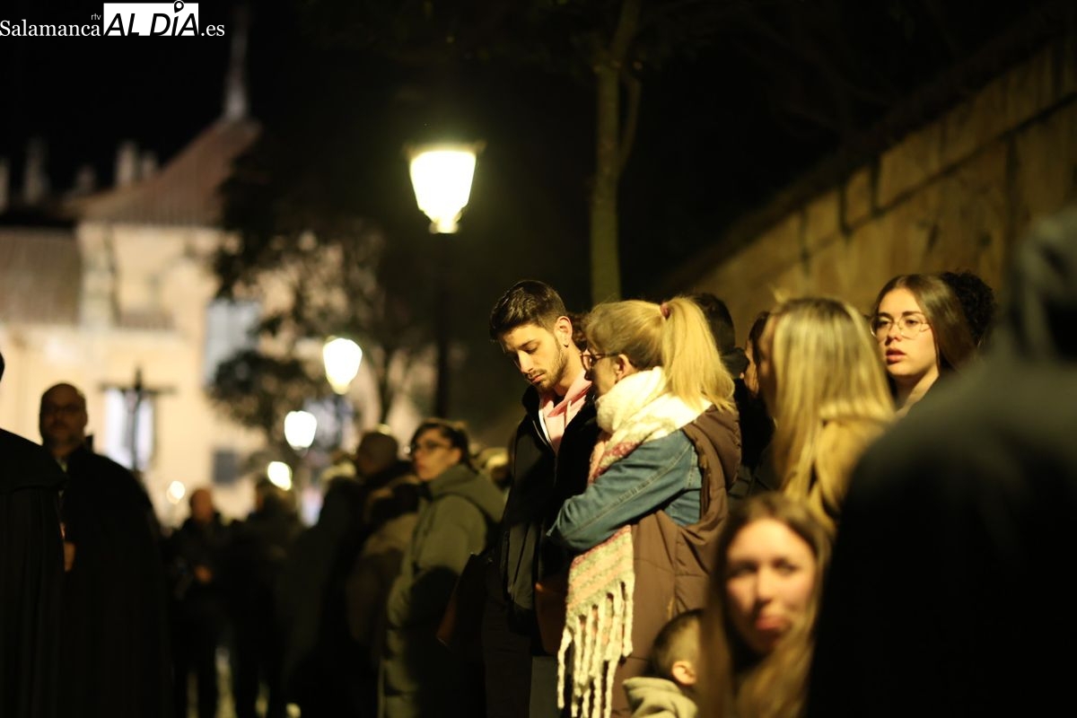 El cortejo ha iniciado su marcha desde la iglesia de la Vera Cruz. Este primer desfile de la Pasión salmantina se concibe como un acto popular, al que la hermandad ha invitado a participar a todas las parroquias y católicos, recordando que no es una procesión exclusiva para los cofrades.