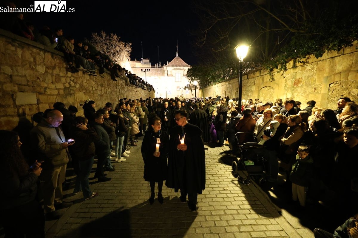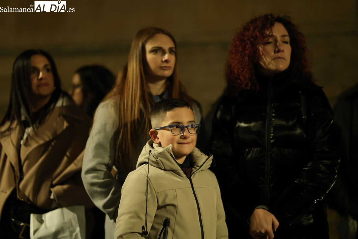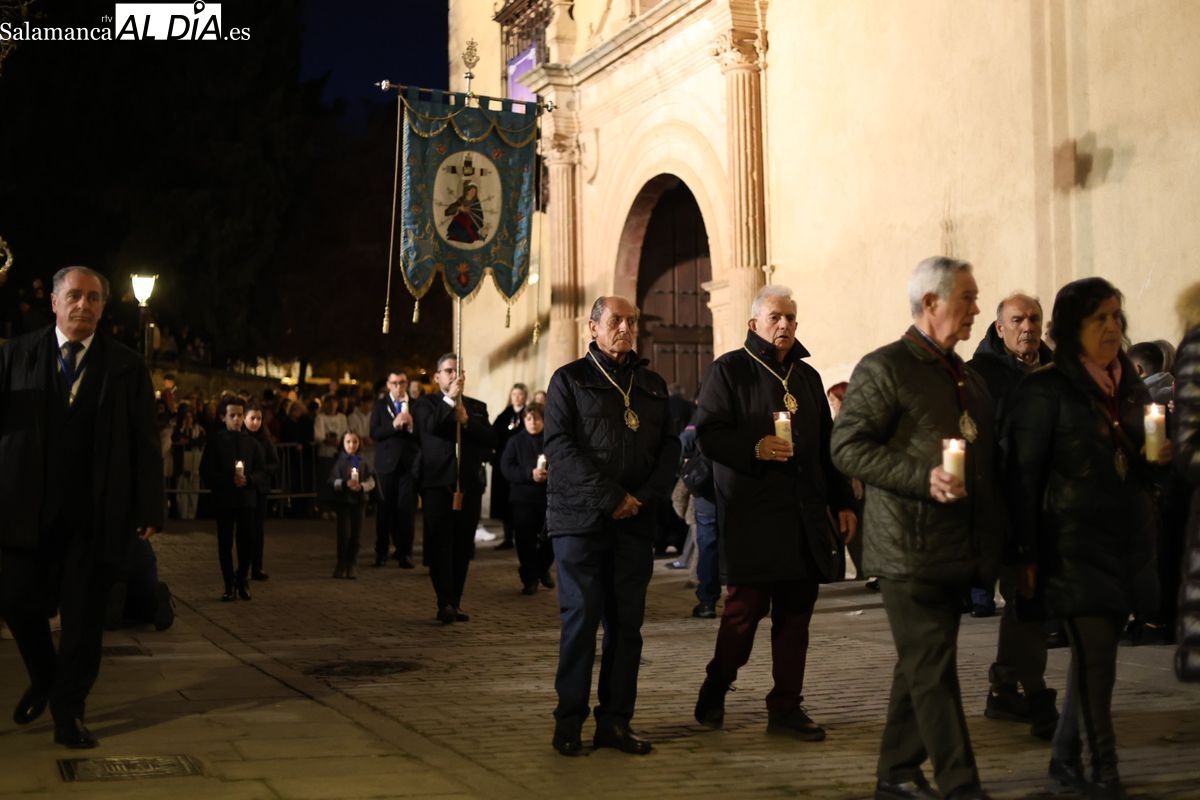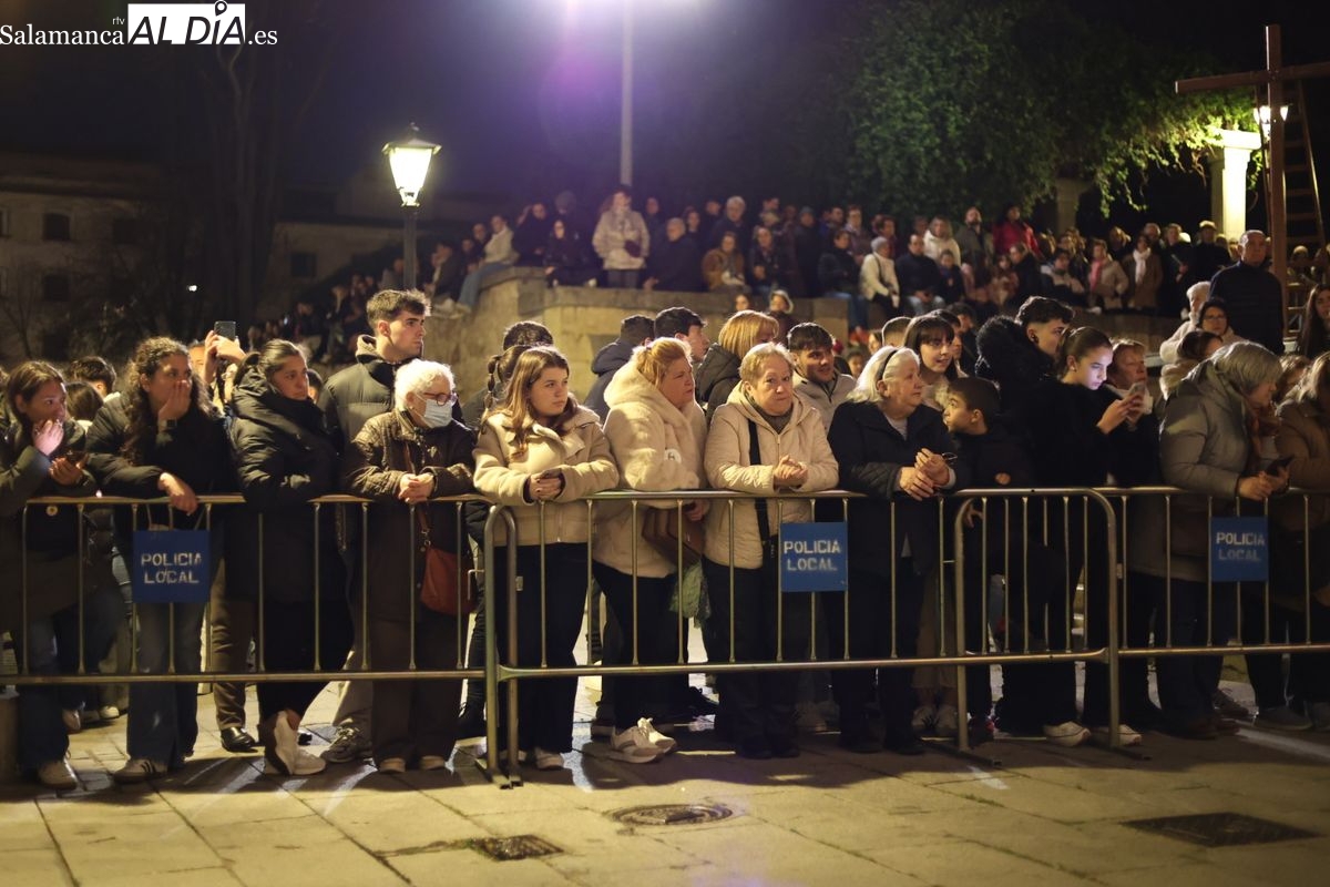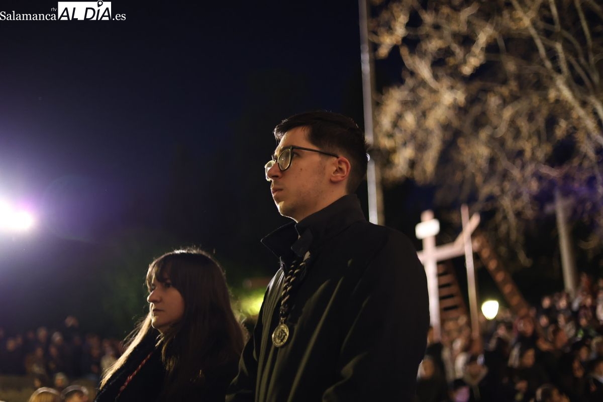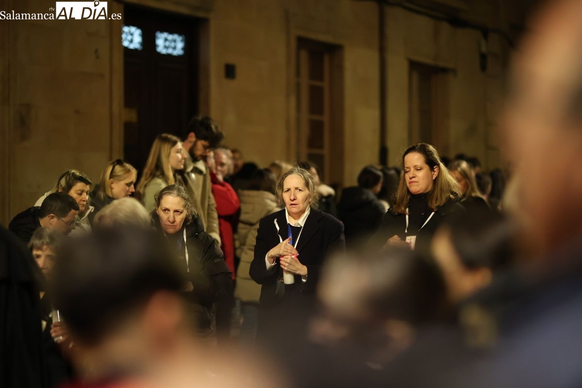 El cortejo ha iniciado su marcha desde la iglesia de la Vera Cruz. Este primer desfile de la Pasión salmantina se concibe como un acto popular, al que la hermandad ha invitado a participar a todas las parroquias y católicos, recordando que no es una procesión exclusiva para los cofrades.