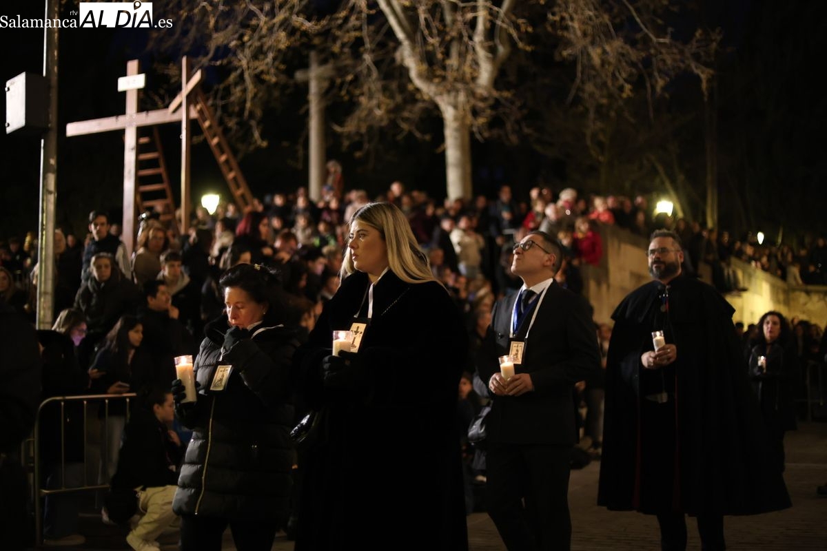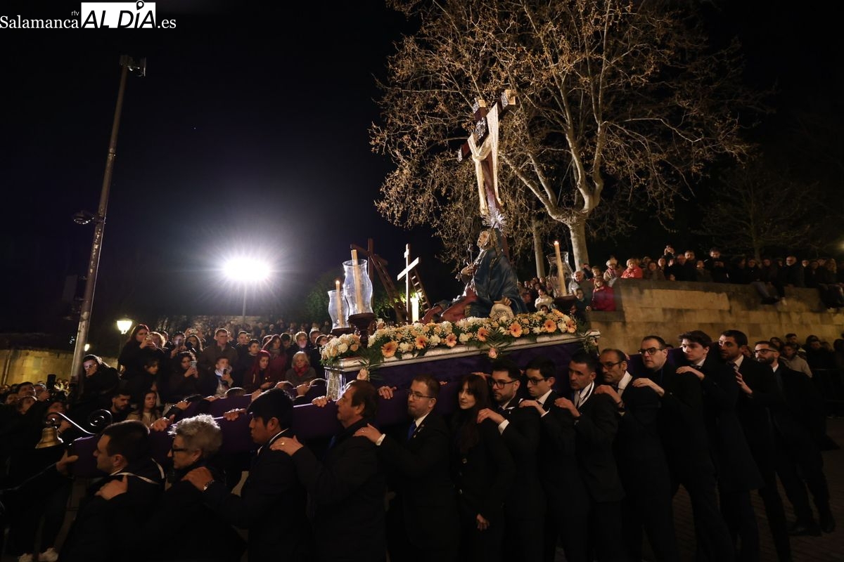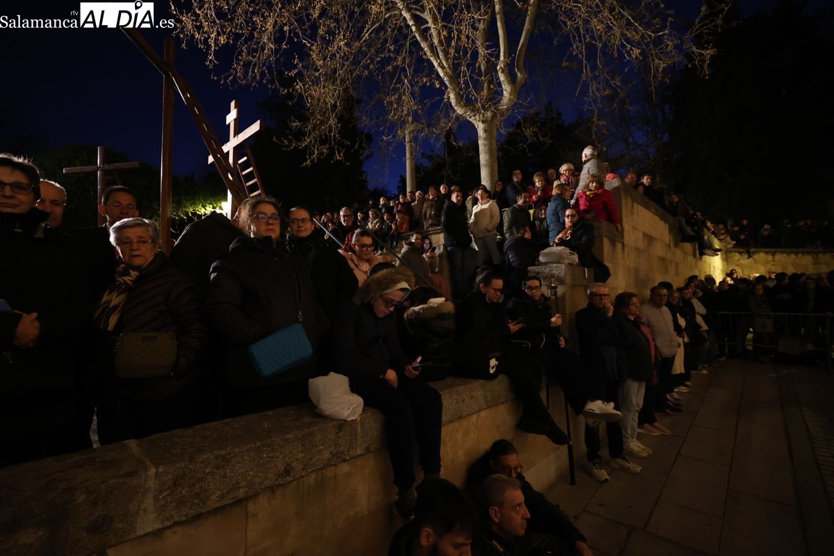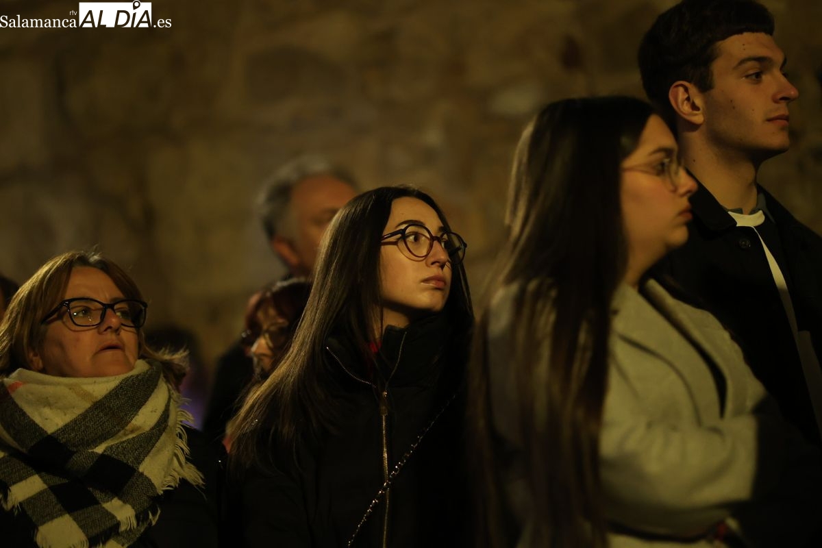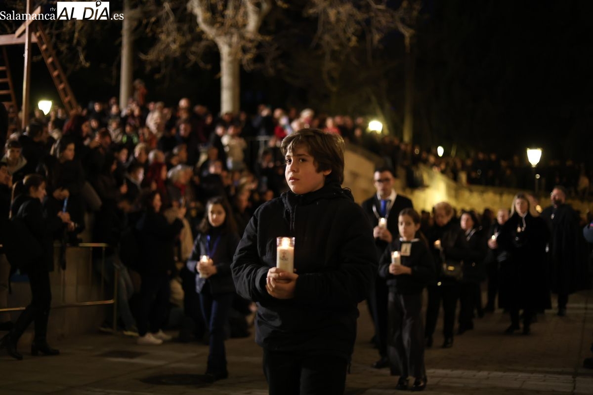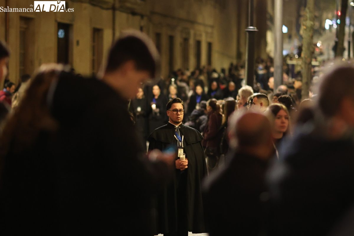 El cortejo ha iniciado su marcha desde la iglesia de la Vera Cruz. Este primer desfile de la Pasión salmantina se concibe como un acto popular, al que la hermandad ha invitado a participar a todas las parroquias y católicos, recordando que no es una procesión exclusiva para los cofrades.