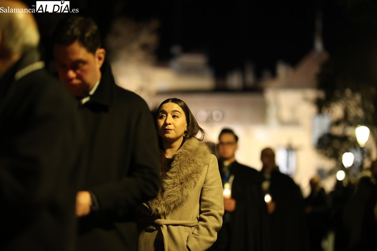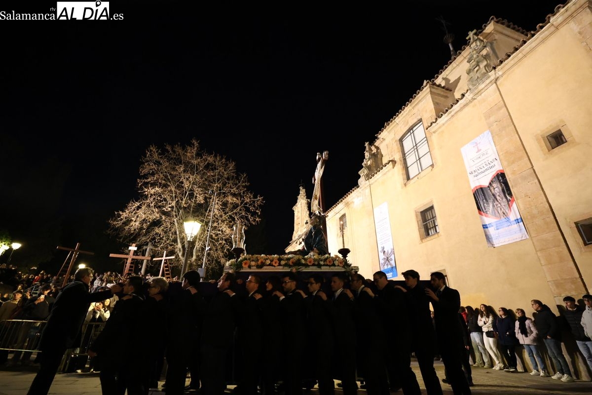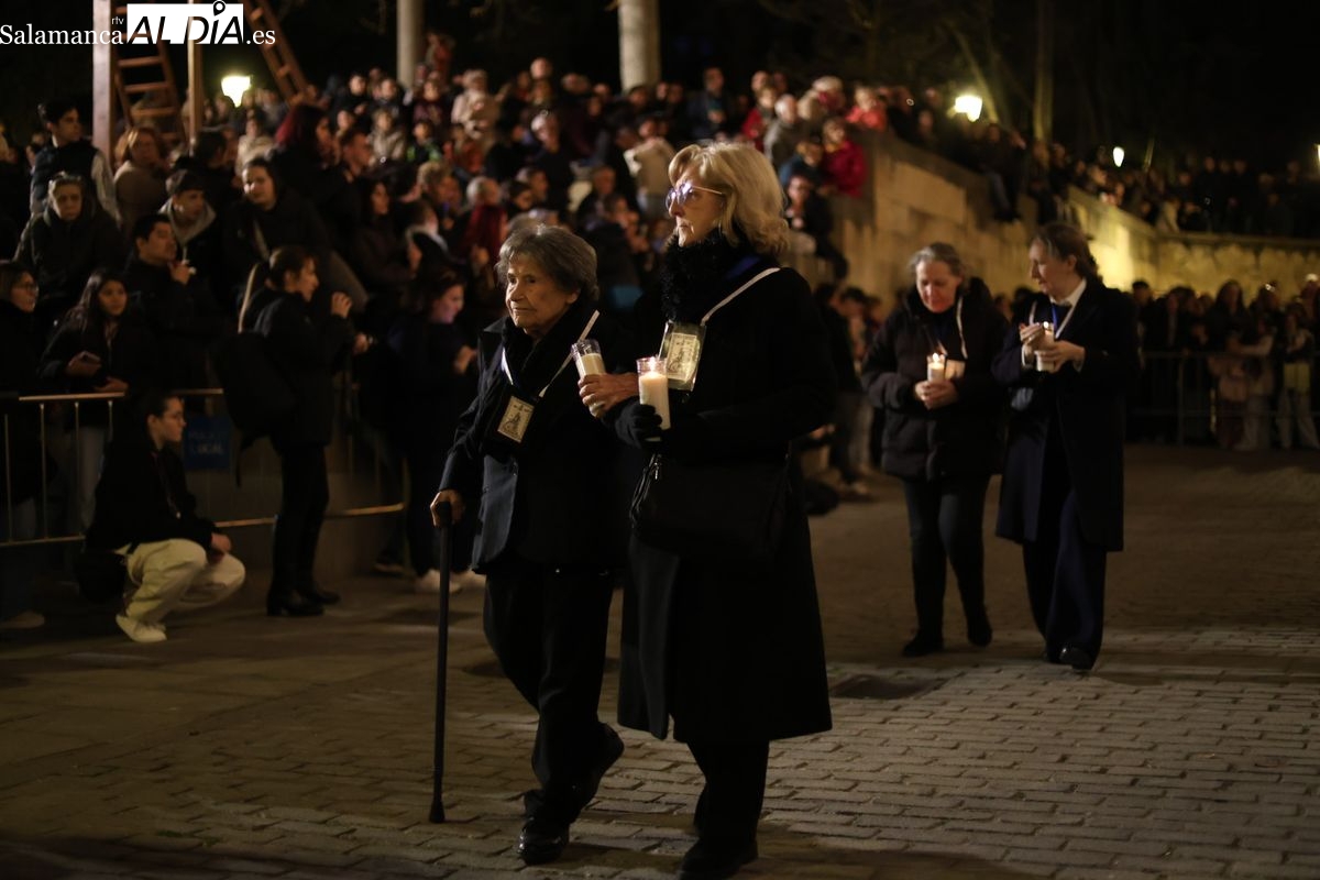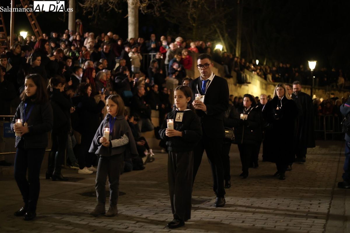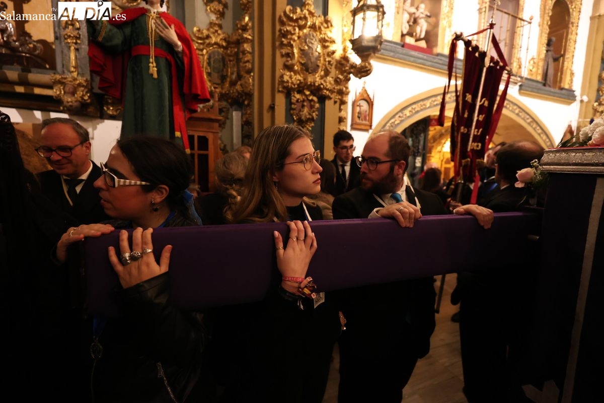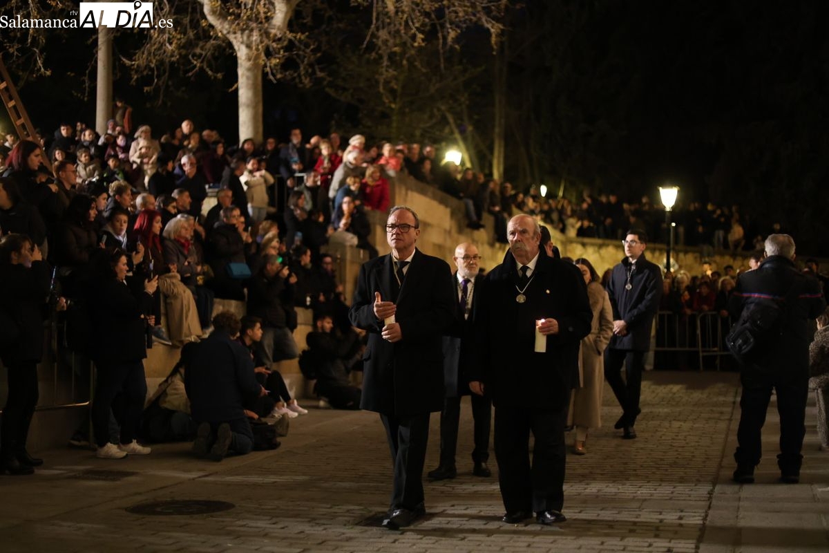 El cortejo ha iniciado su marcha desde la iglesia de la Vera Cruz. Este primer desfile de la Pasión salmantina se concibe como un acto popular, al que la hermandad ha invitado a participar a todas las parroquias y católicos, recordando que no es una procesión exclusiva para los cofrades.
