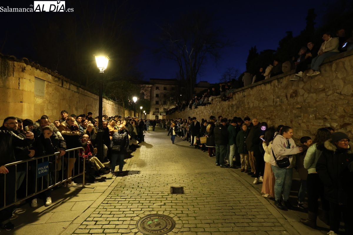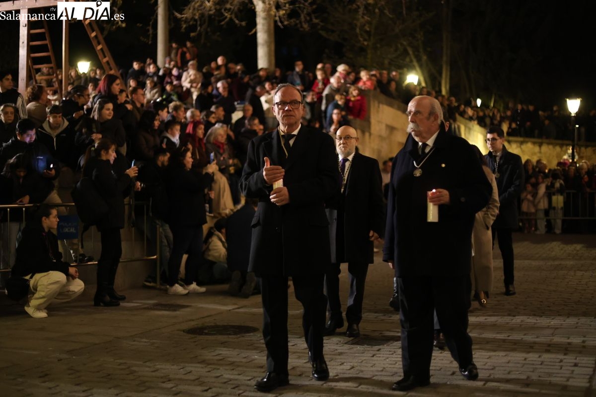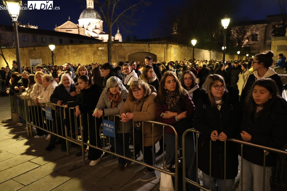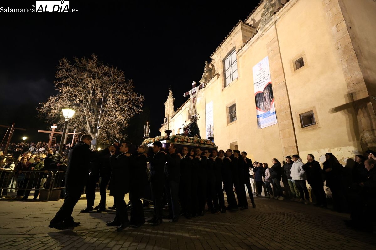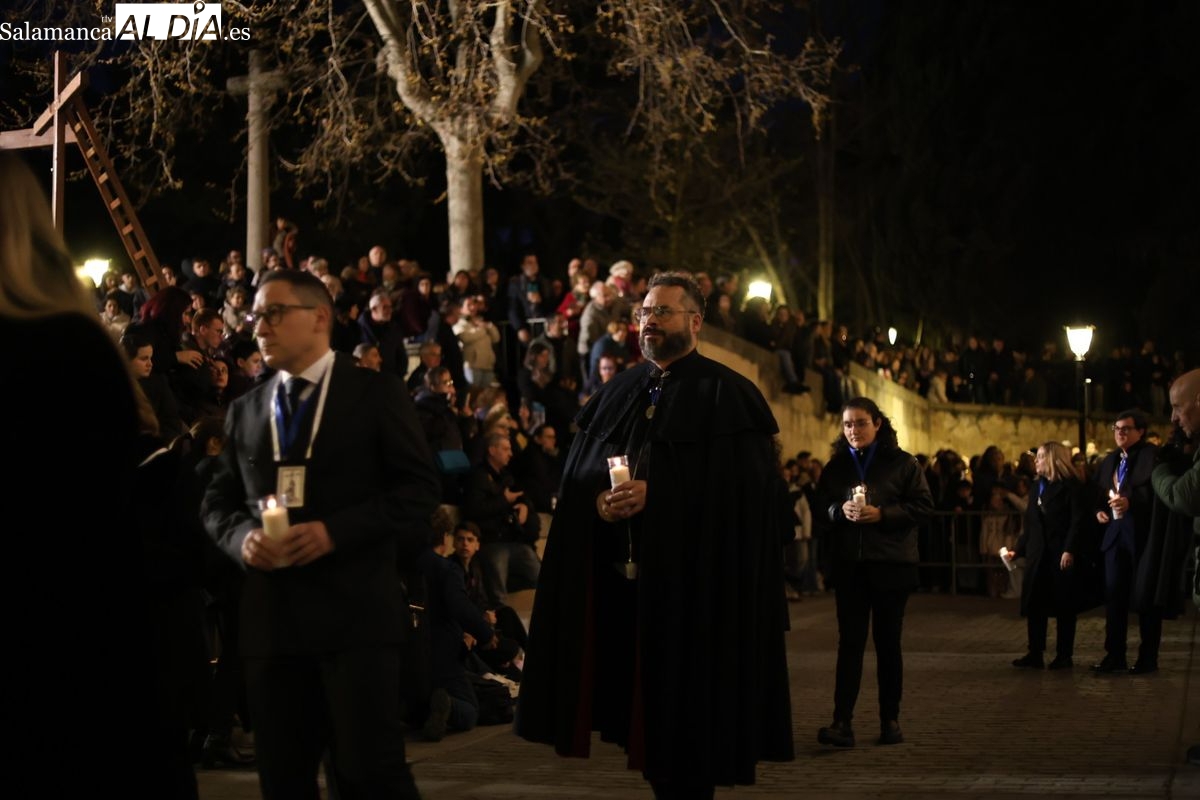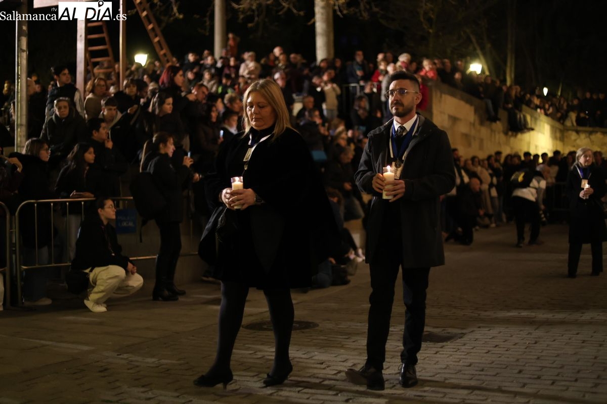 El cortejo ha iniciado su marcha desde la iglesia de la Vera Cruz. Este primer desfile de la Pasión salmantina se concibe como un acto popular, al que la hermandad ha invitado a participar a todas las parroquias y católicos, recordando que no es una procesión exclusiva para los cofrades.