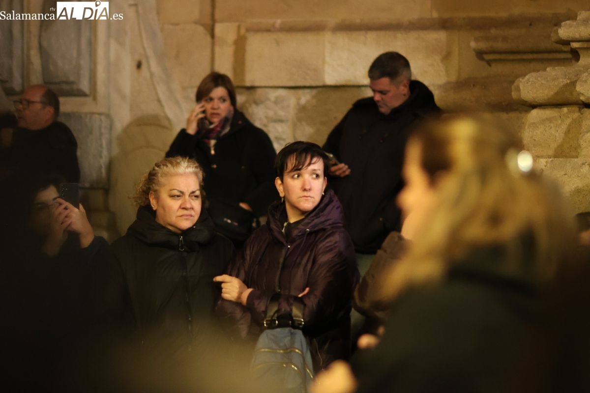 El momento central de la noche ha tenido lugar en la plaza de San Benito, espacio donde se ha llevado a cabo el solemne rezo del Vía Matris. Posteriormente, la procesión ha continuado su trayecto por la calle de la Compañía, la calle Meléndez y la plaza del Corrillo.