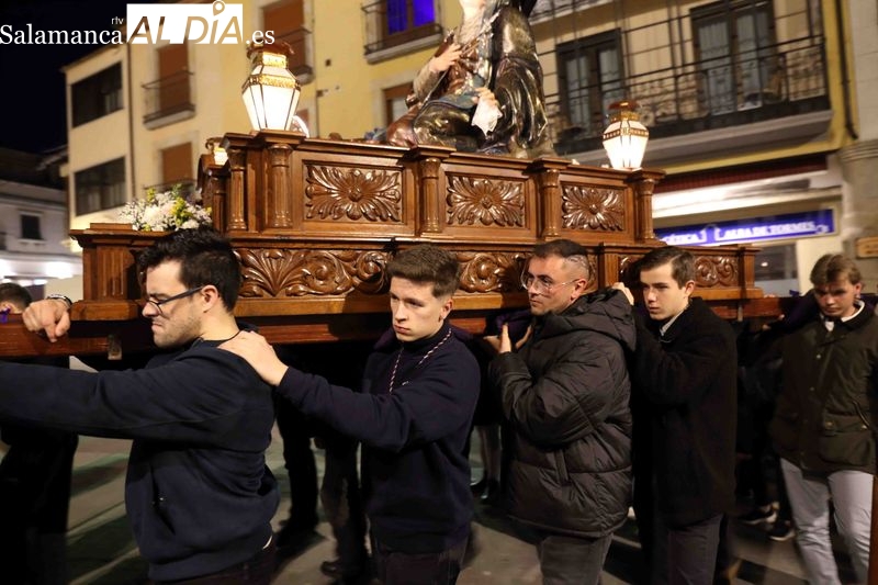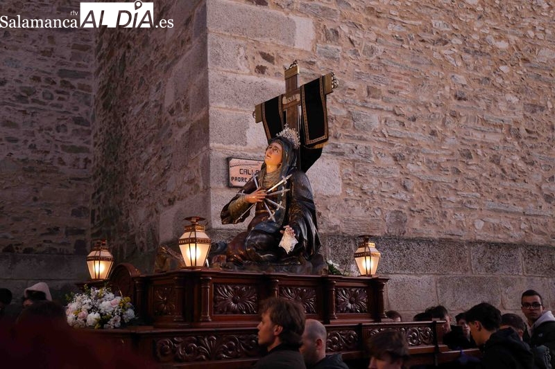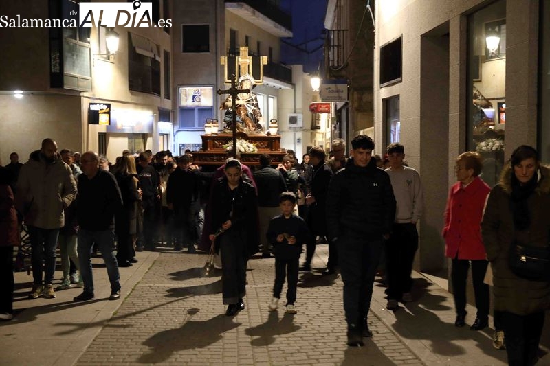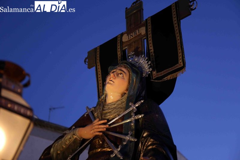 La Cofradía de la Vera Cruz ha inaugurado los actos centrales de la Semana Santa de Alba de Tormes con el tradicional desfile procesional del Viernes de Dolores. Los cofrades acompañan a la imagen mariana en un solemne recorrido por el centro histórico del municipio, precedido por un acto litúrgico en memoria de los hermanos fallecidos.
